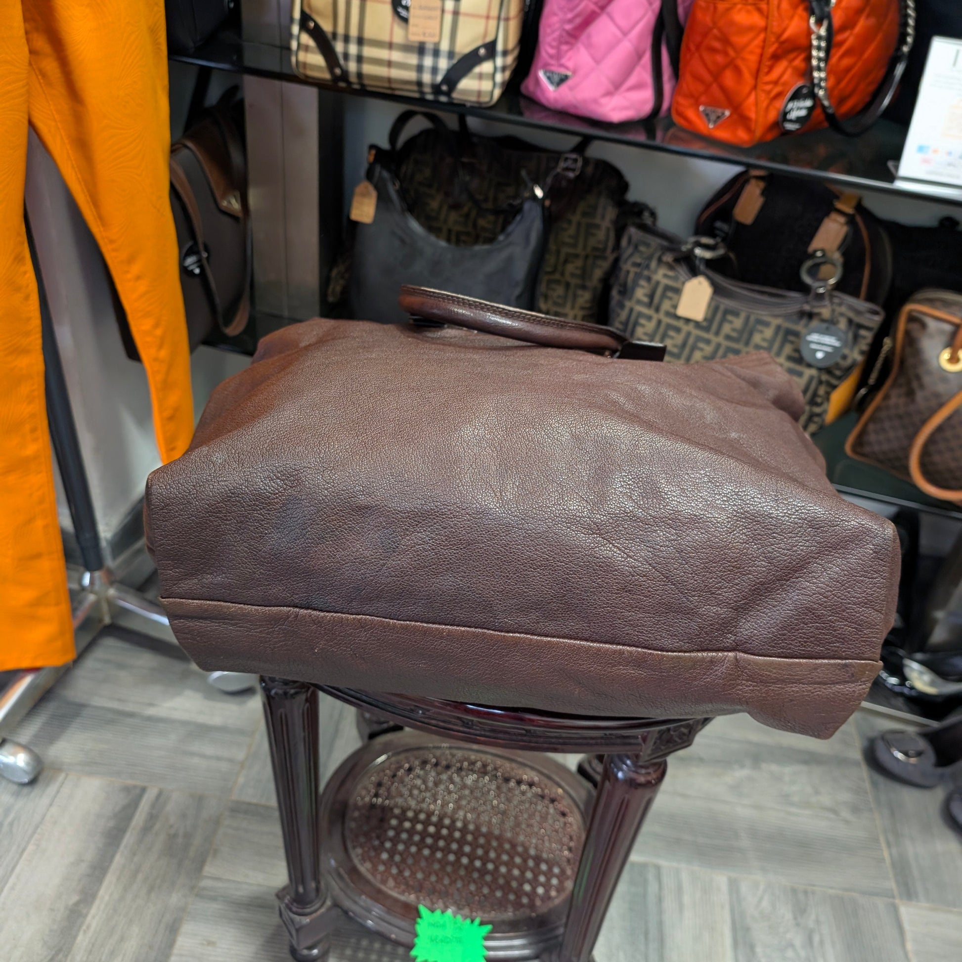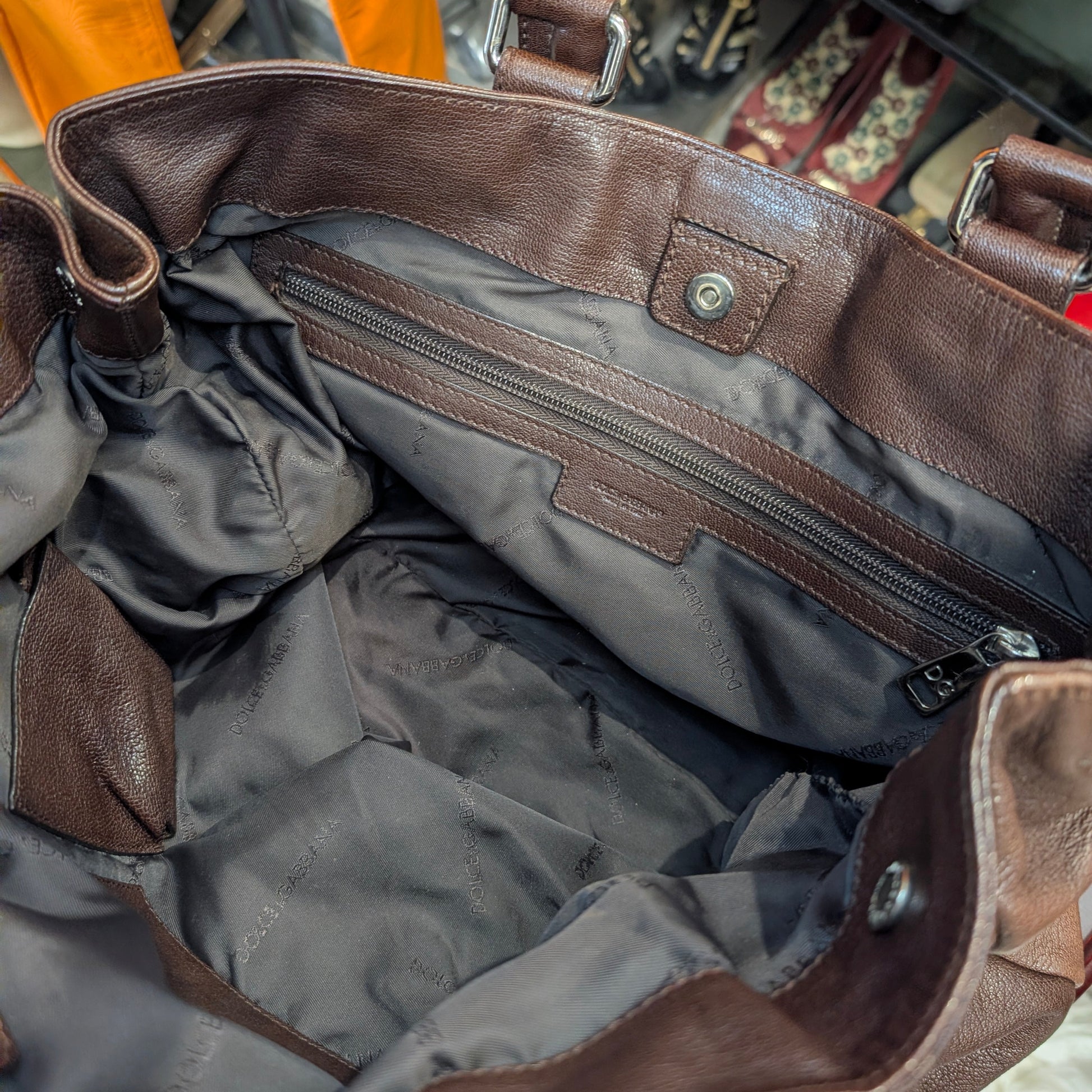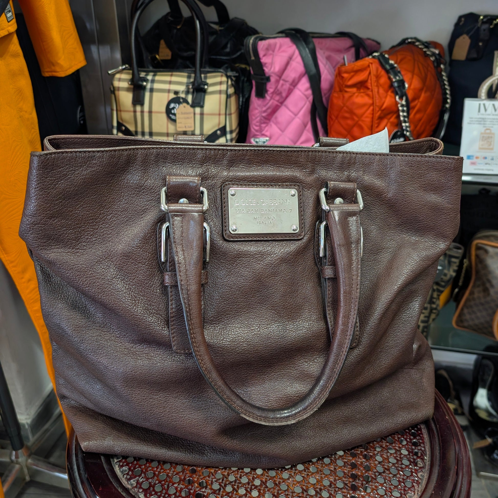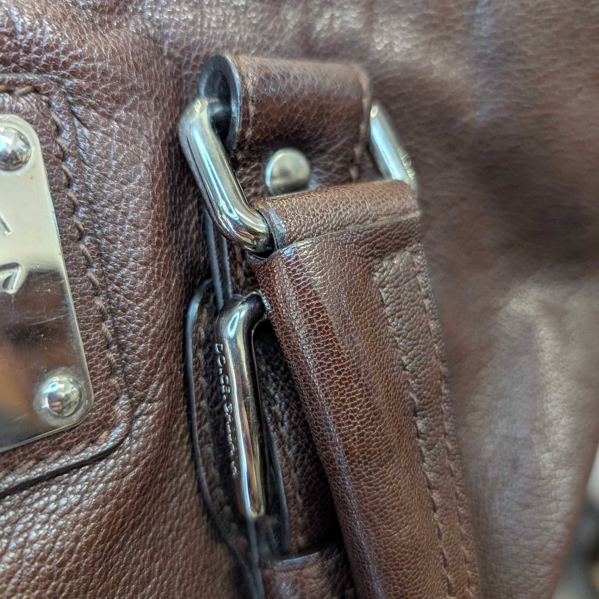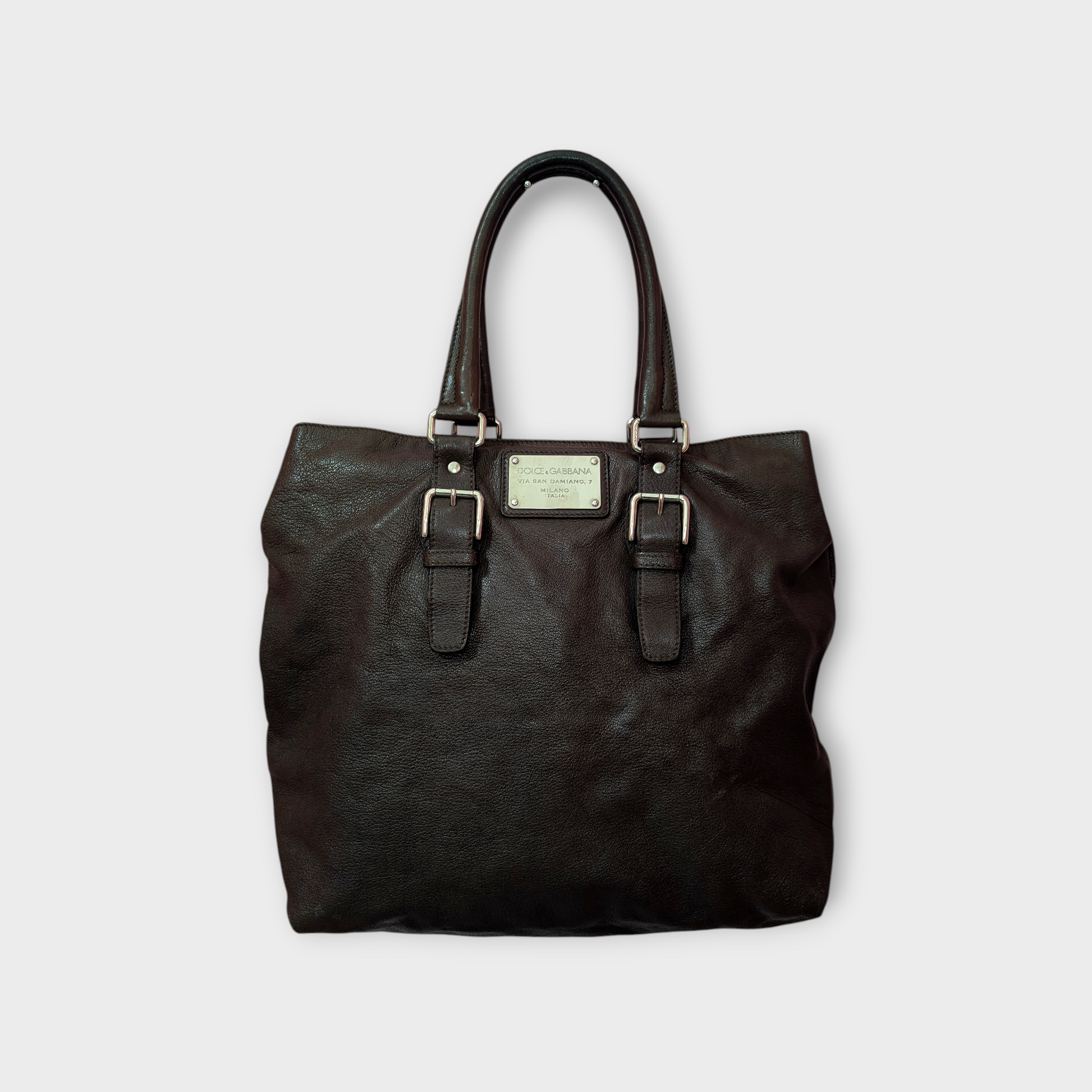 Shopper vintage di Dolce e Gabbana, in morbidissima pelle di vitello, colore marrone scuro, doppi manici, chiusura con clip e automatici laterali, di cui uno mancante visibile in foto. Capiente, comoda e perfetta per tutti i giorni. Presenta la tipica placca di Dolce e Gabbana sul fronte e non presenta difetti evidenti. Ottime condizioni generali.