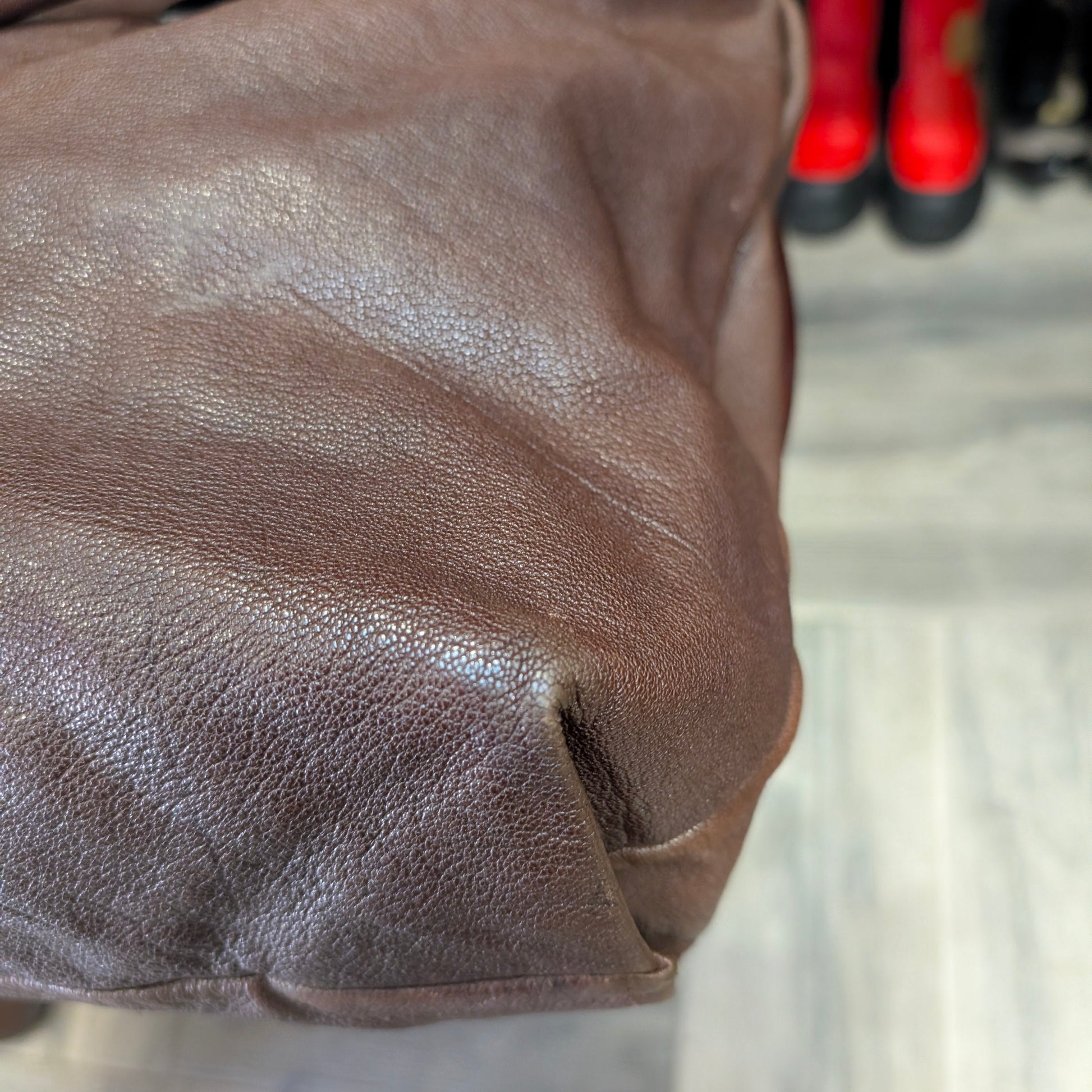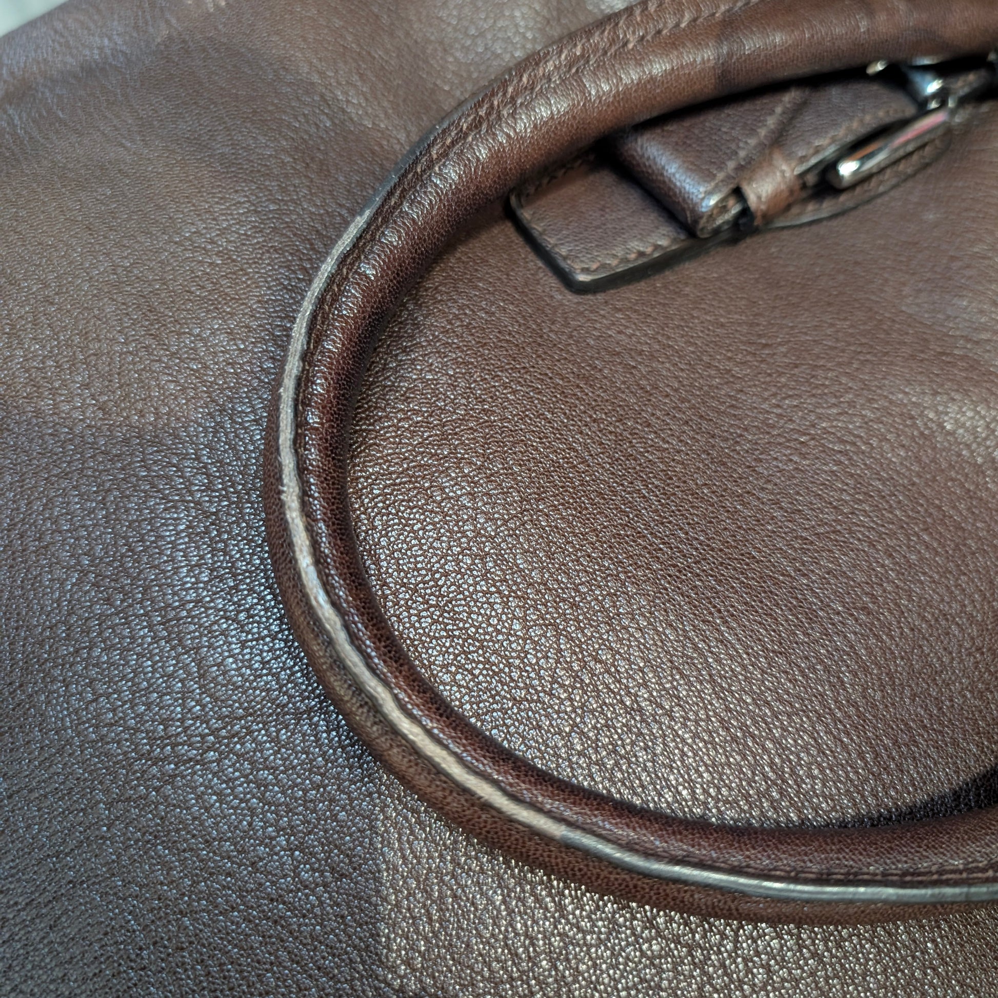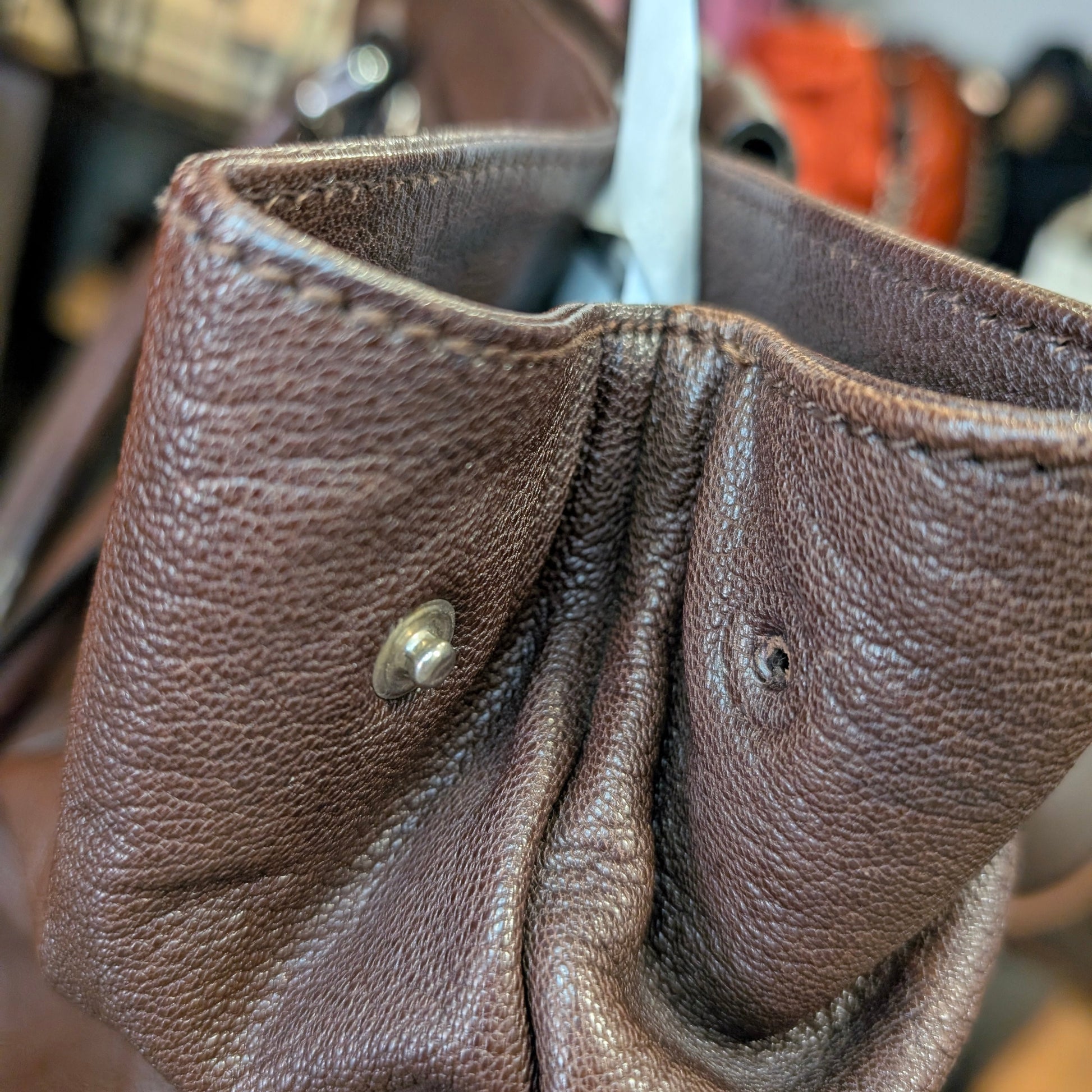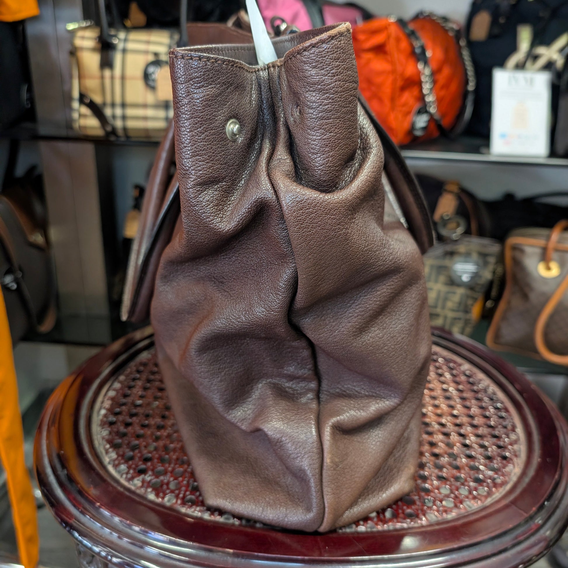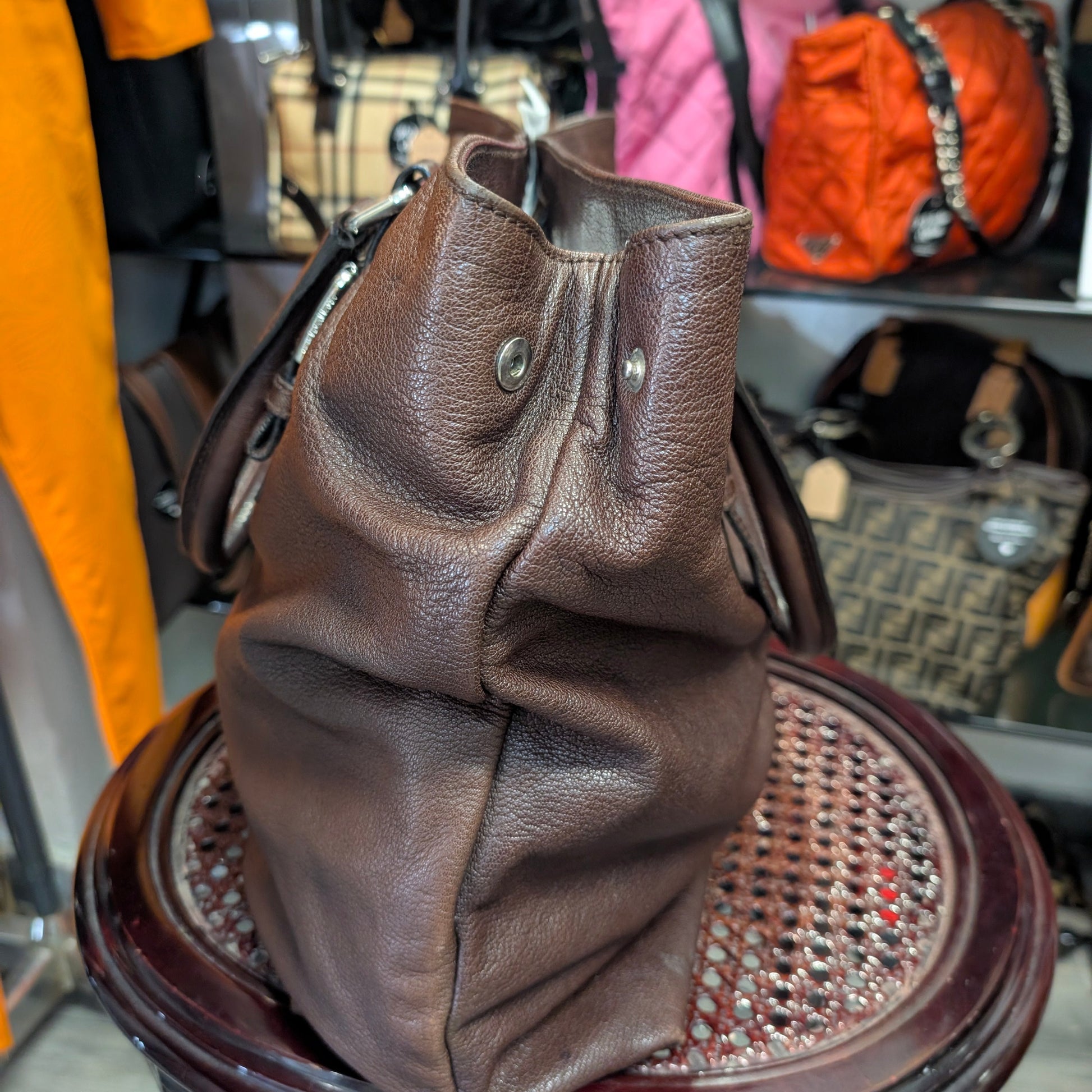 Shopper vintage di Dolce e Gabbana, in morbidissima pelle di vitello, colore marrone scuro, doppi manici, chiusura con clip e automatici laterali, di cui uno mancante visibile in foto. Capiente, comoda e perfetta per tutti i giorni. Presenta la tipica placca di Dolce e Gabbana sul fronte e non presenta difetti evidenti. Ottime condizioni generali.