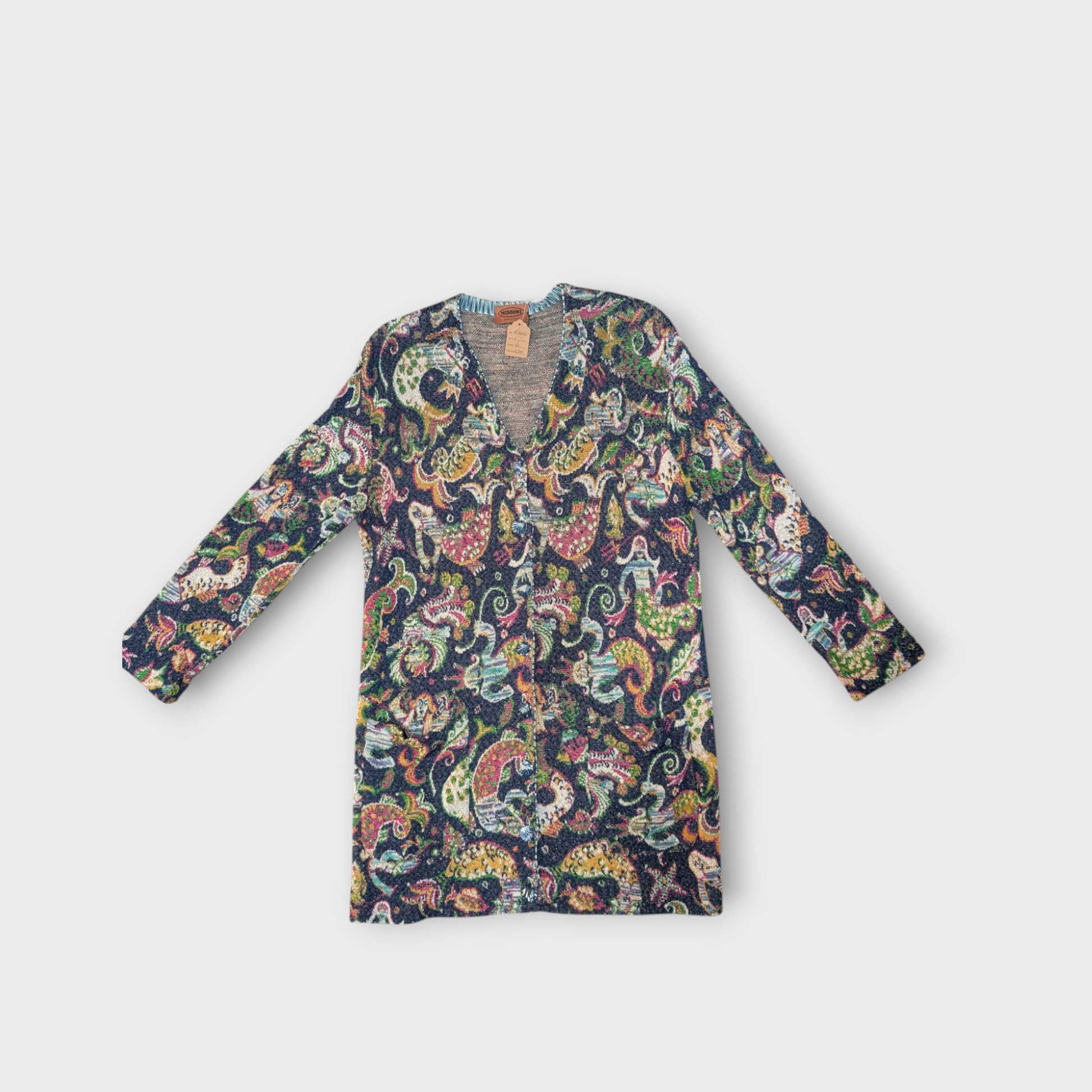 Cardigan vintage di Missoni, a tema marino, con sirene e conchiglie come bottoni.