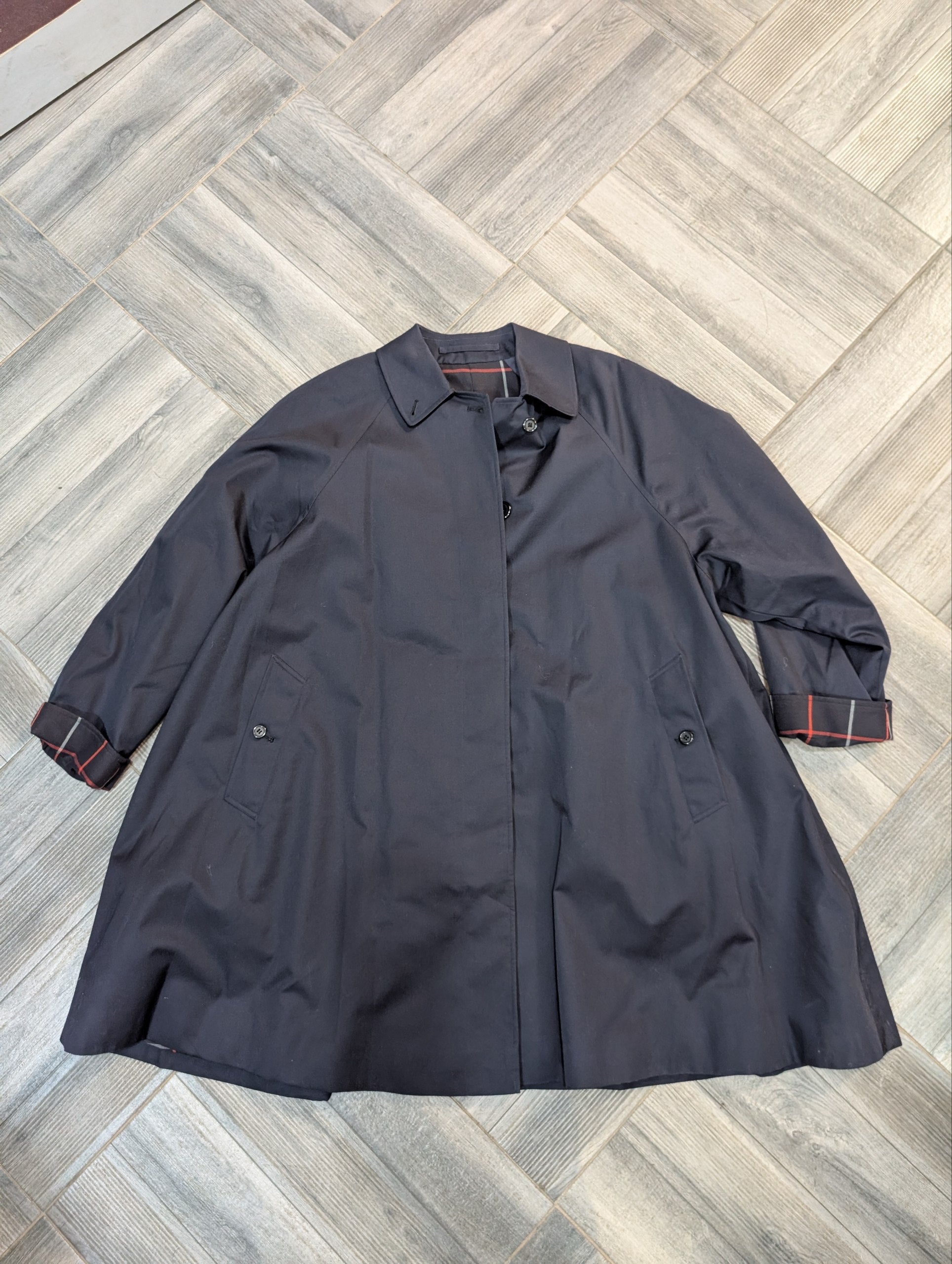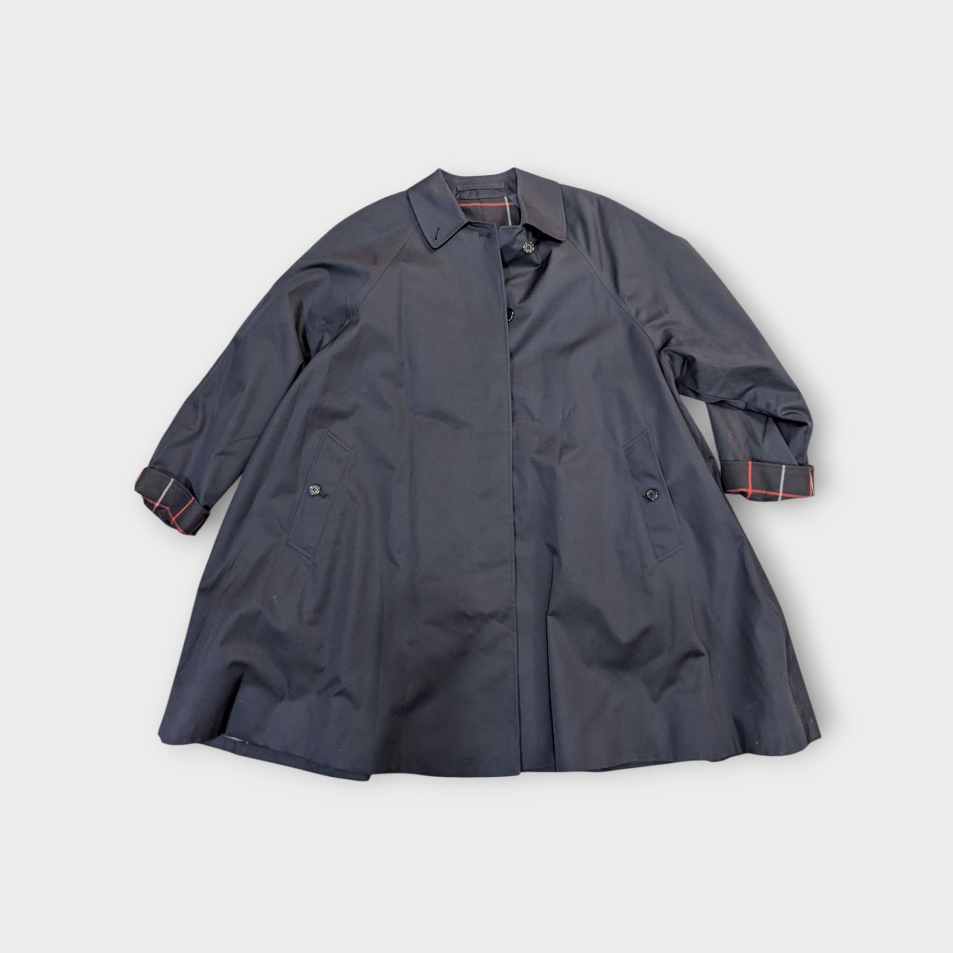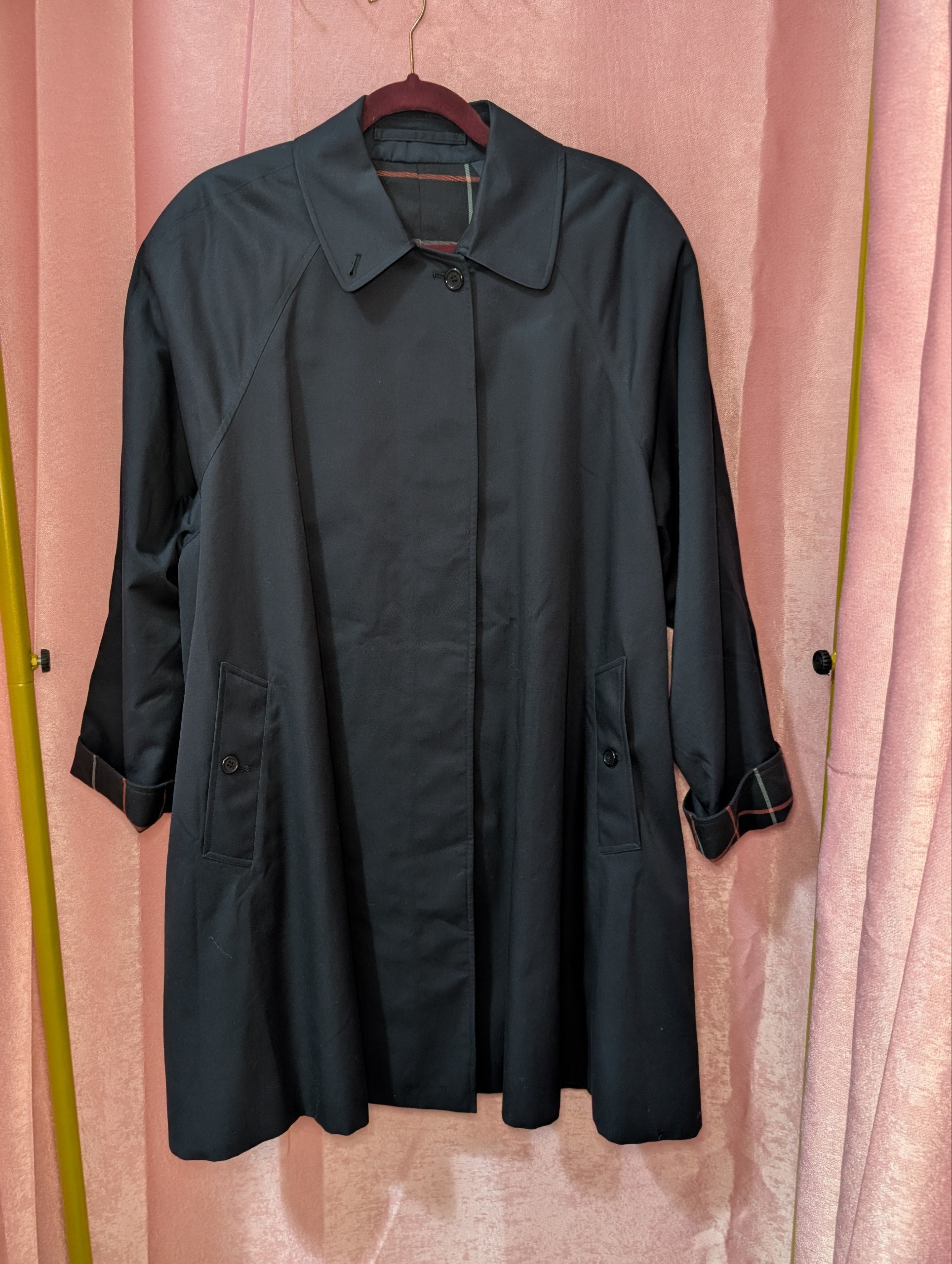 Cappotto vintage anni 80 di Burberry's, modello Camden, in cotone e poliestere blu scuro e fodera interna in check. Ottime condizioni generali, vestibilità svasata proprio come prevede il modello.