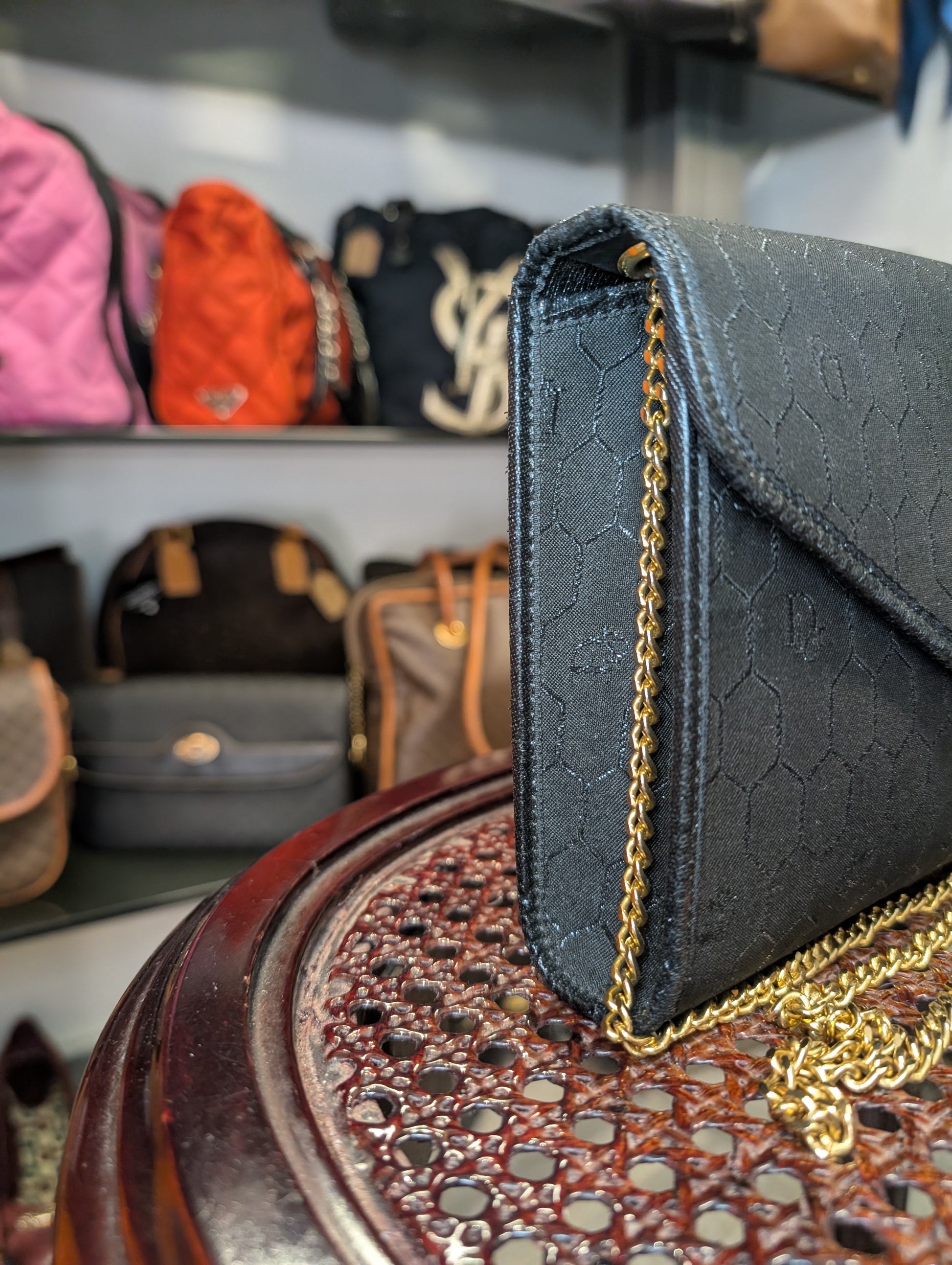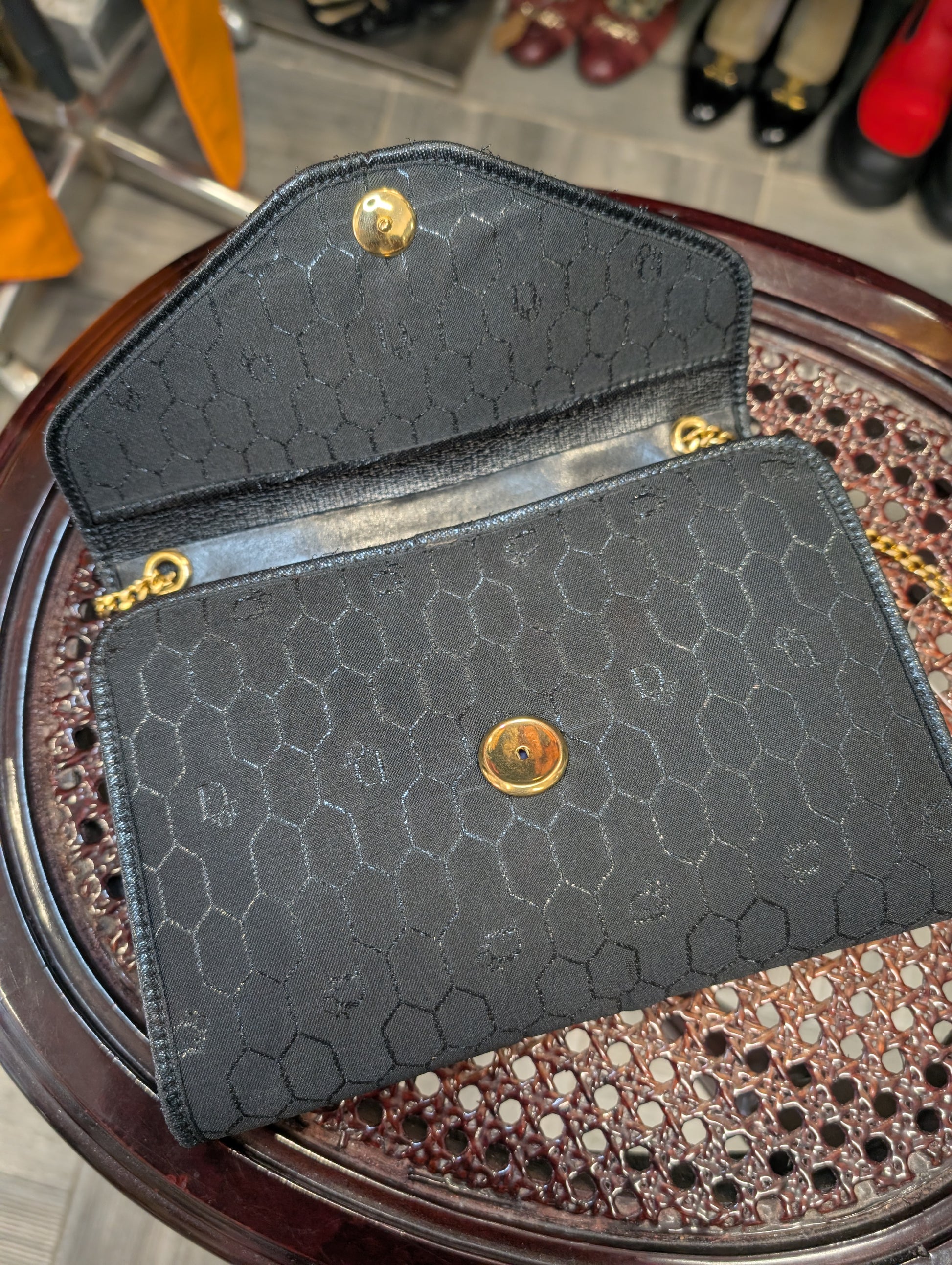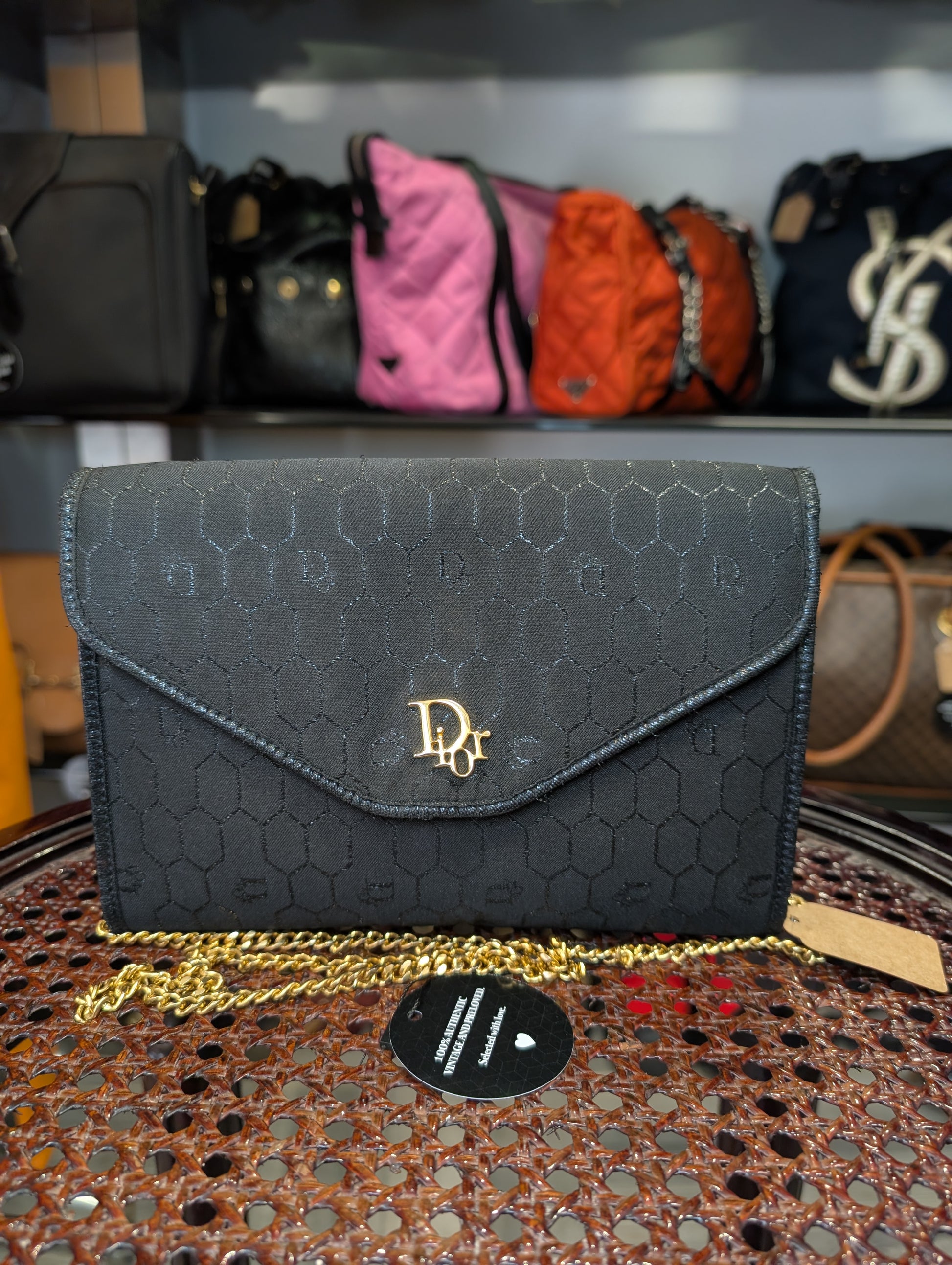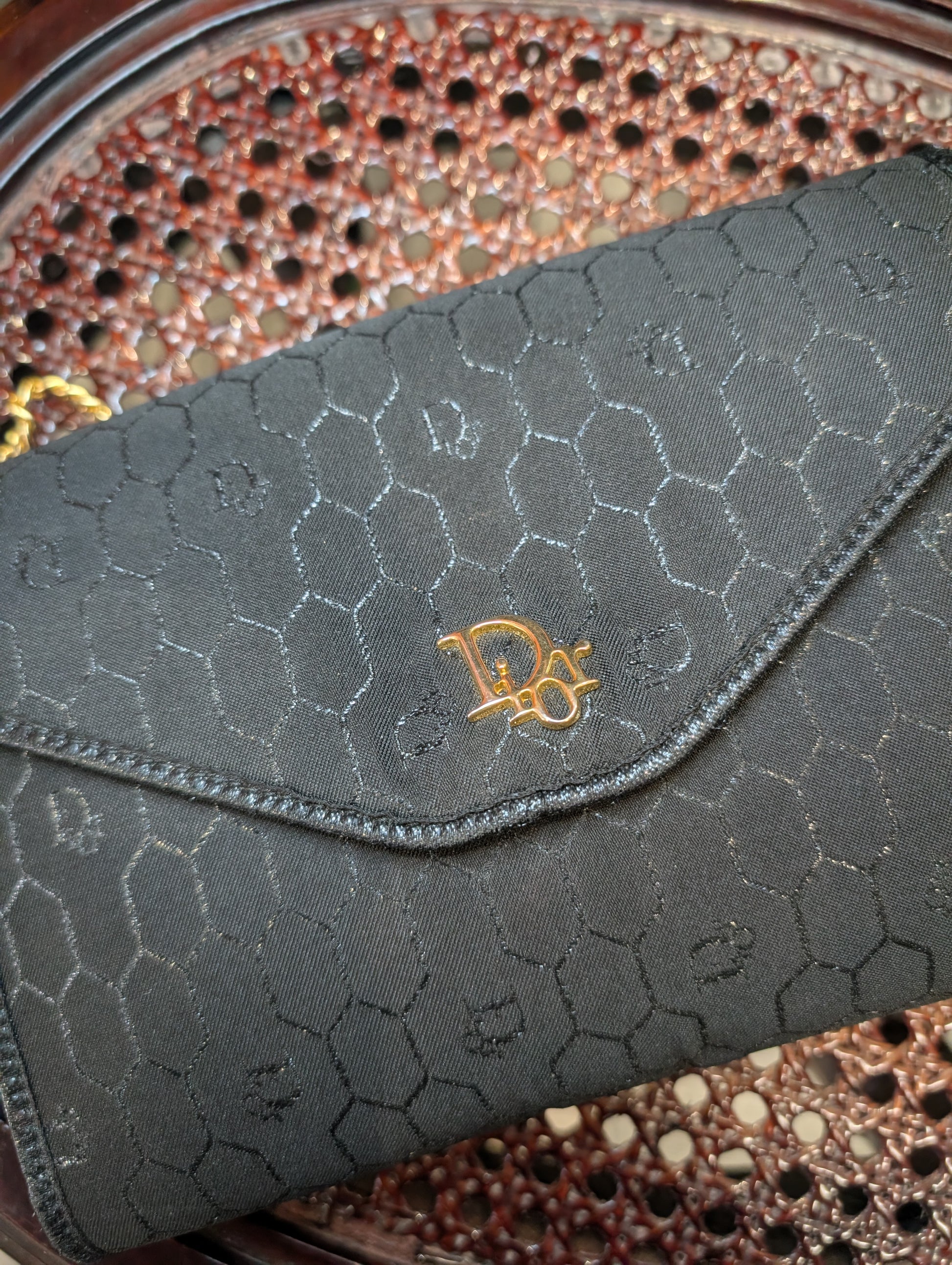 Splendida pochette in tela nido d'ape Christian Dior, profili in pelle e catena in ottone dorato.