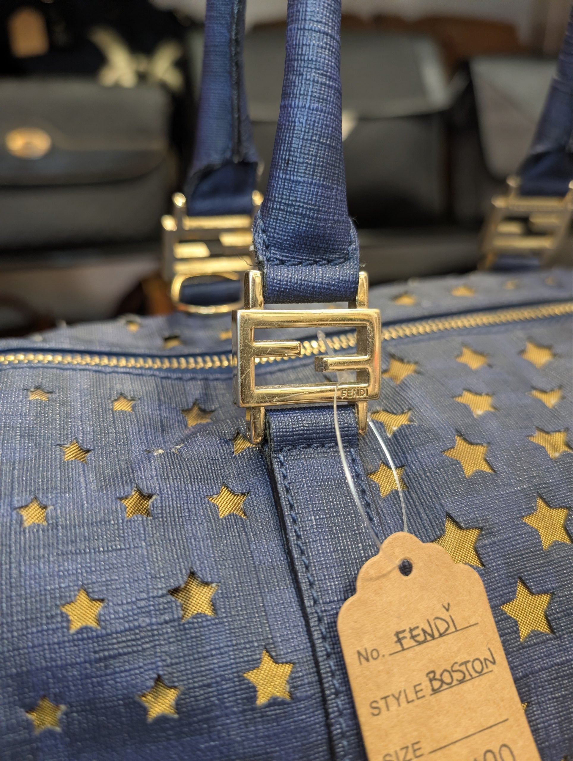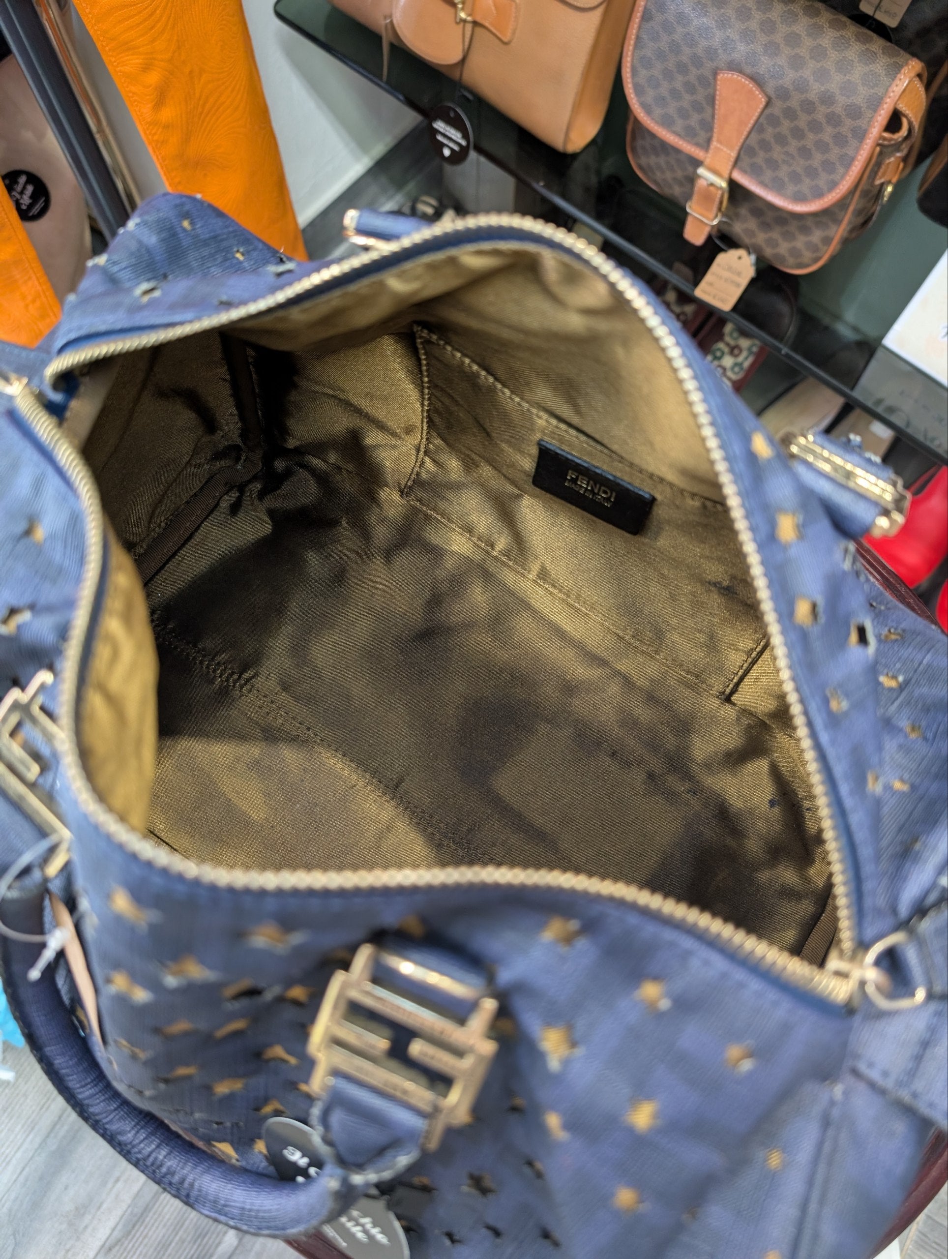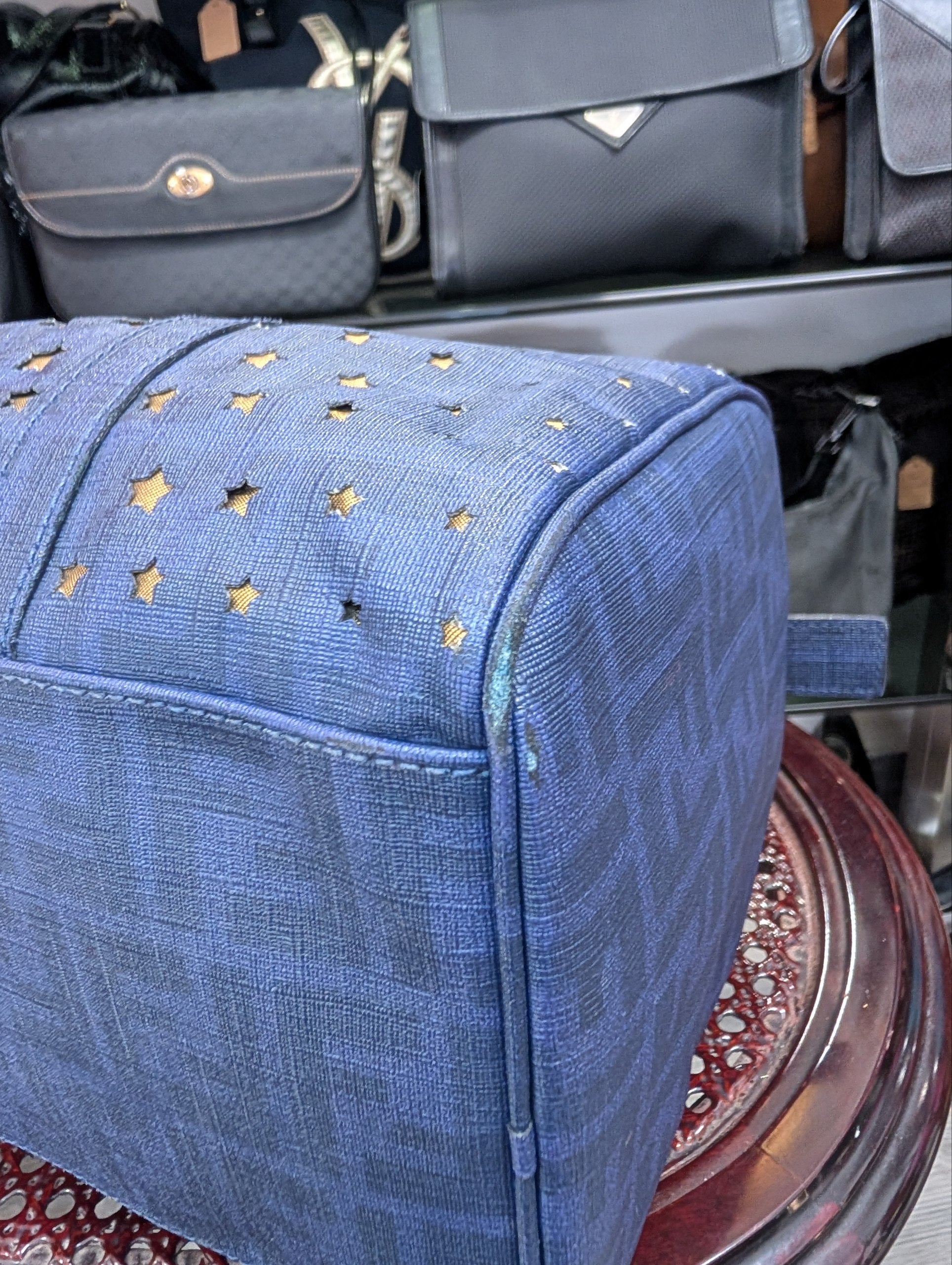 Bauletto di Fendi, in edizione limitata, colore blu, tela plastificata FF e stelline intagliate.