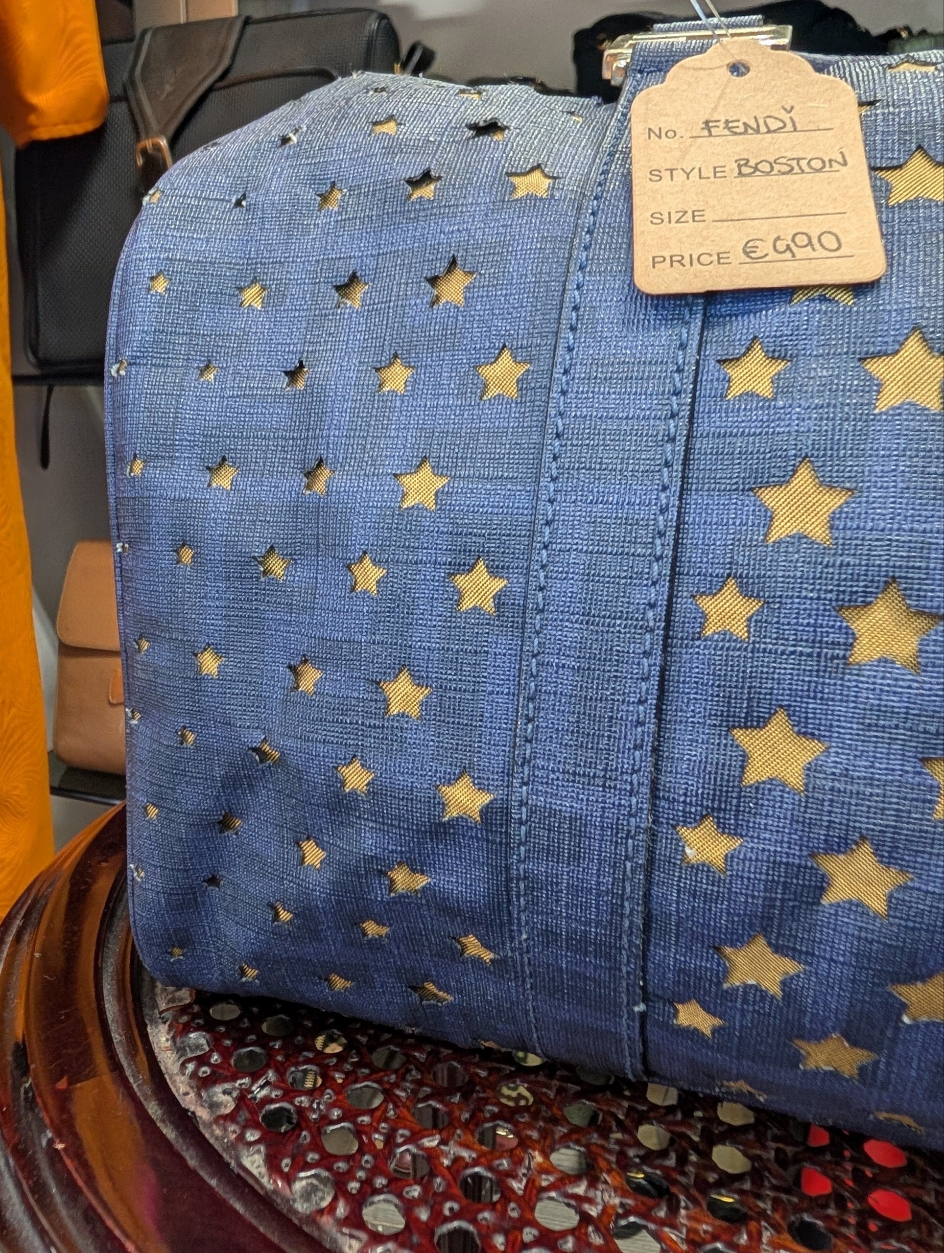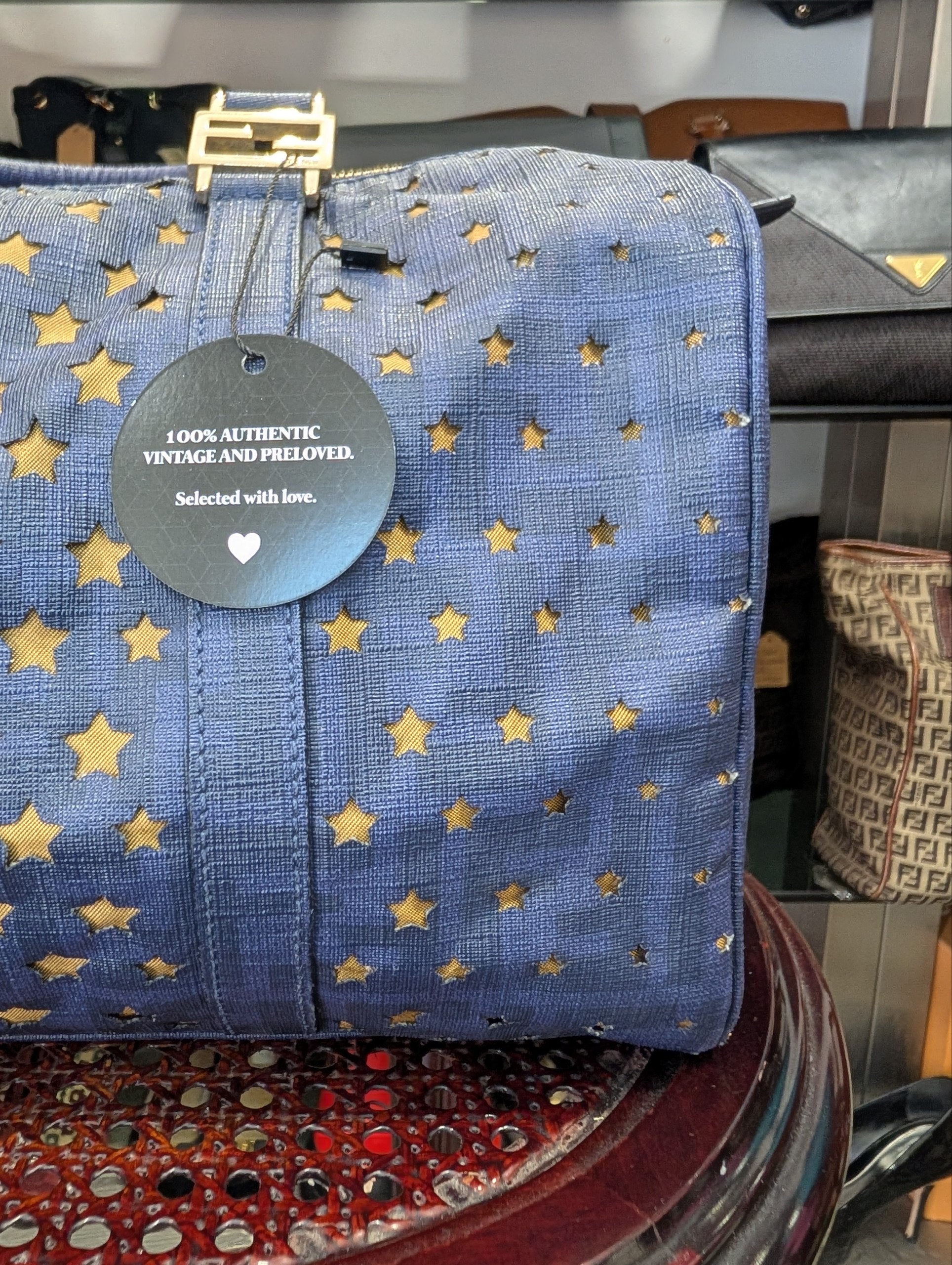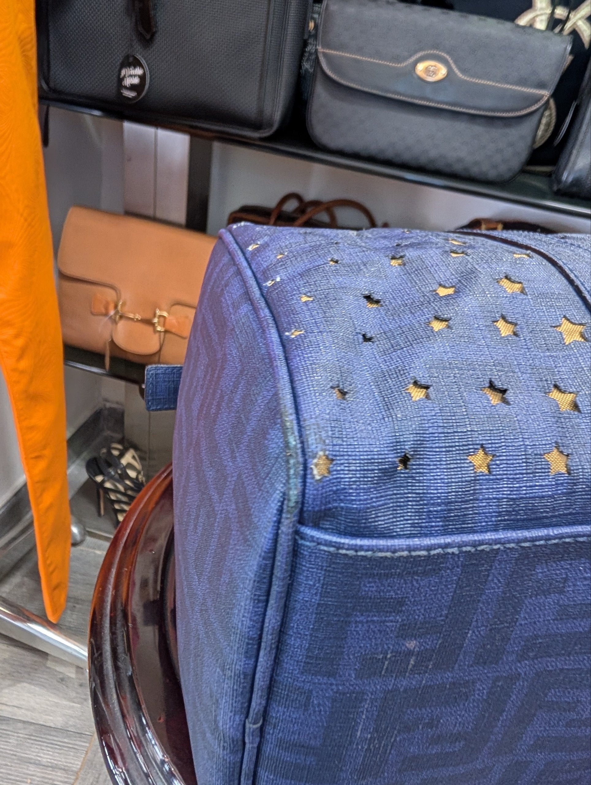 Bauletto di Fendi, in edizione limitata, colore blu, tela plastificata FF e stelline intagliate.