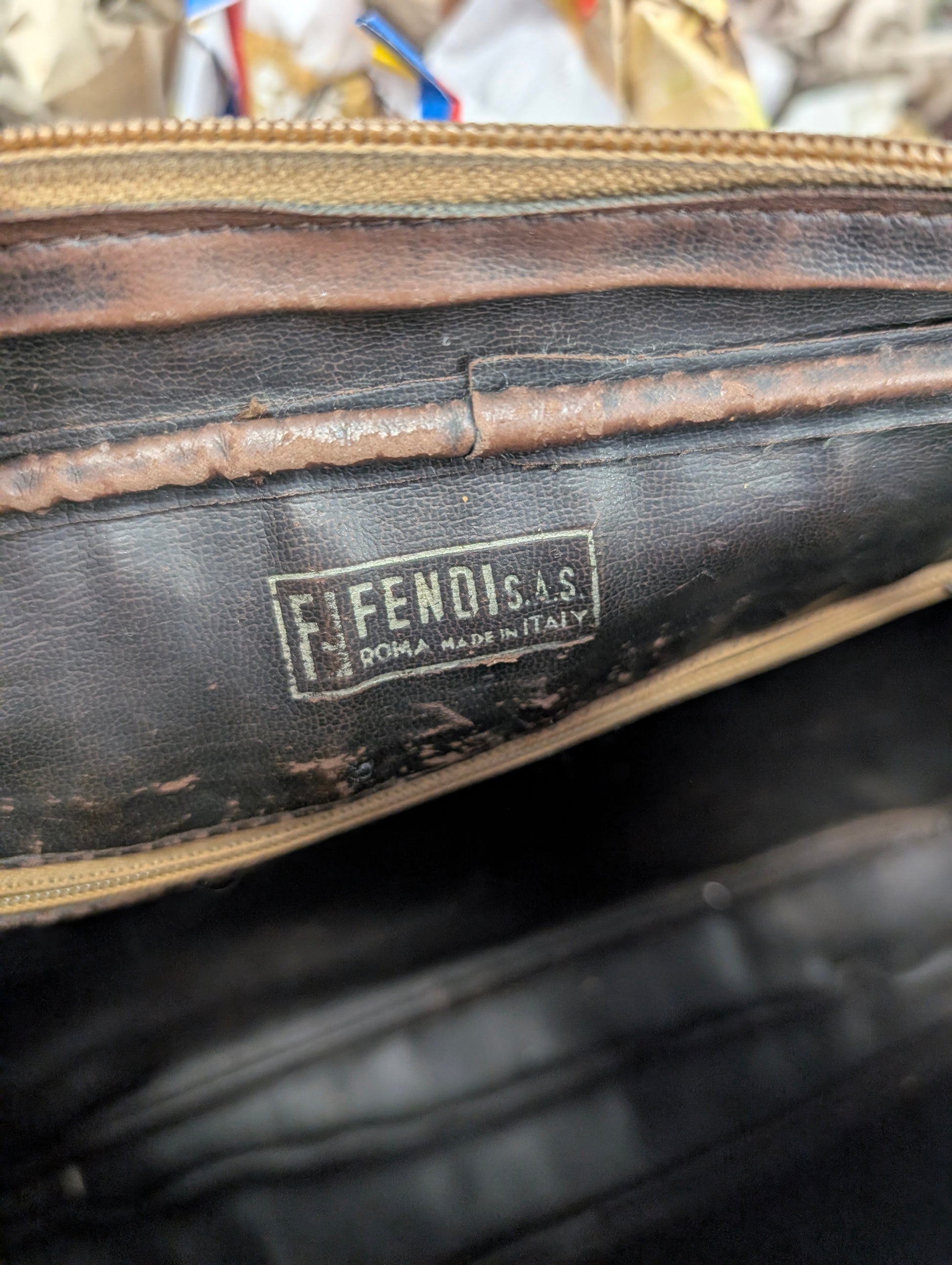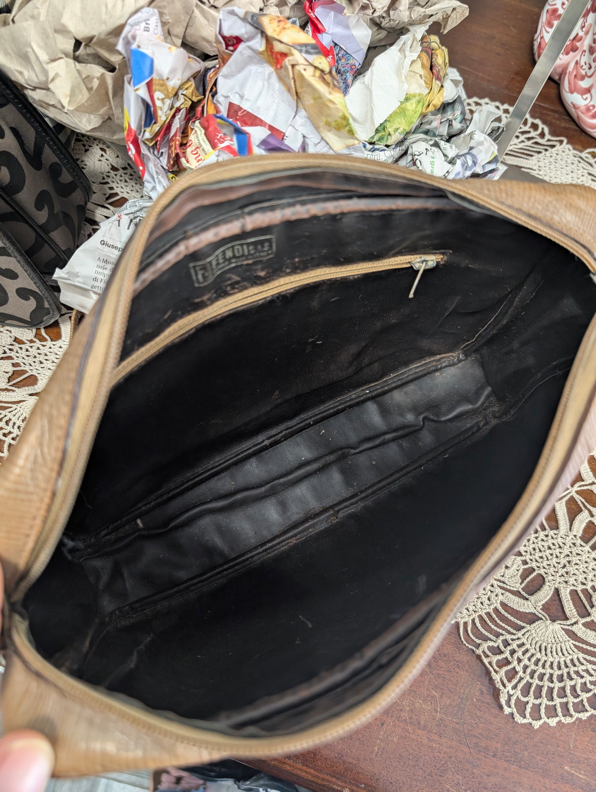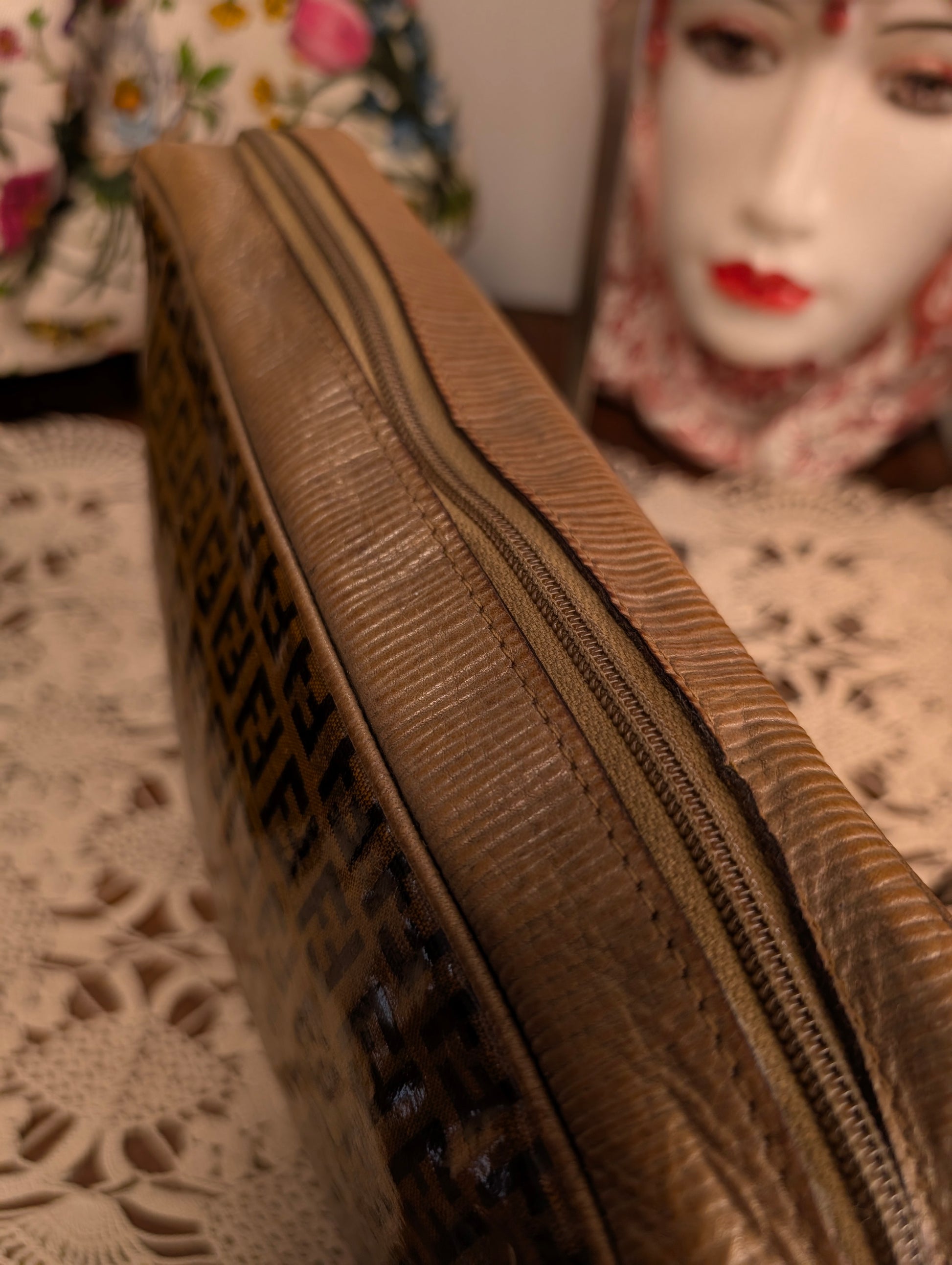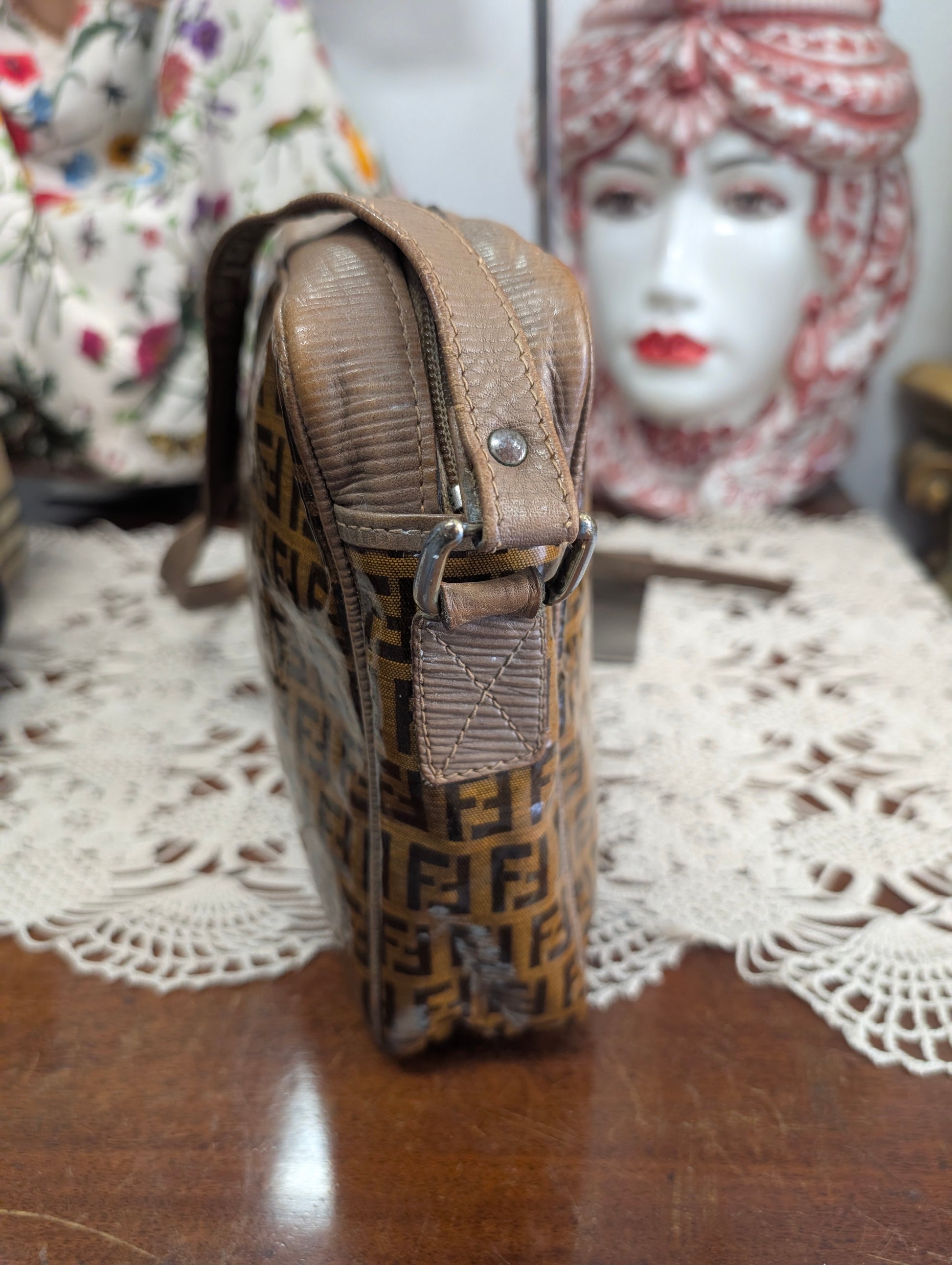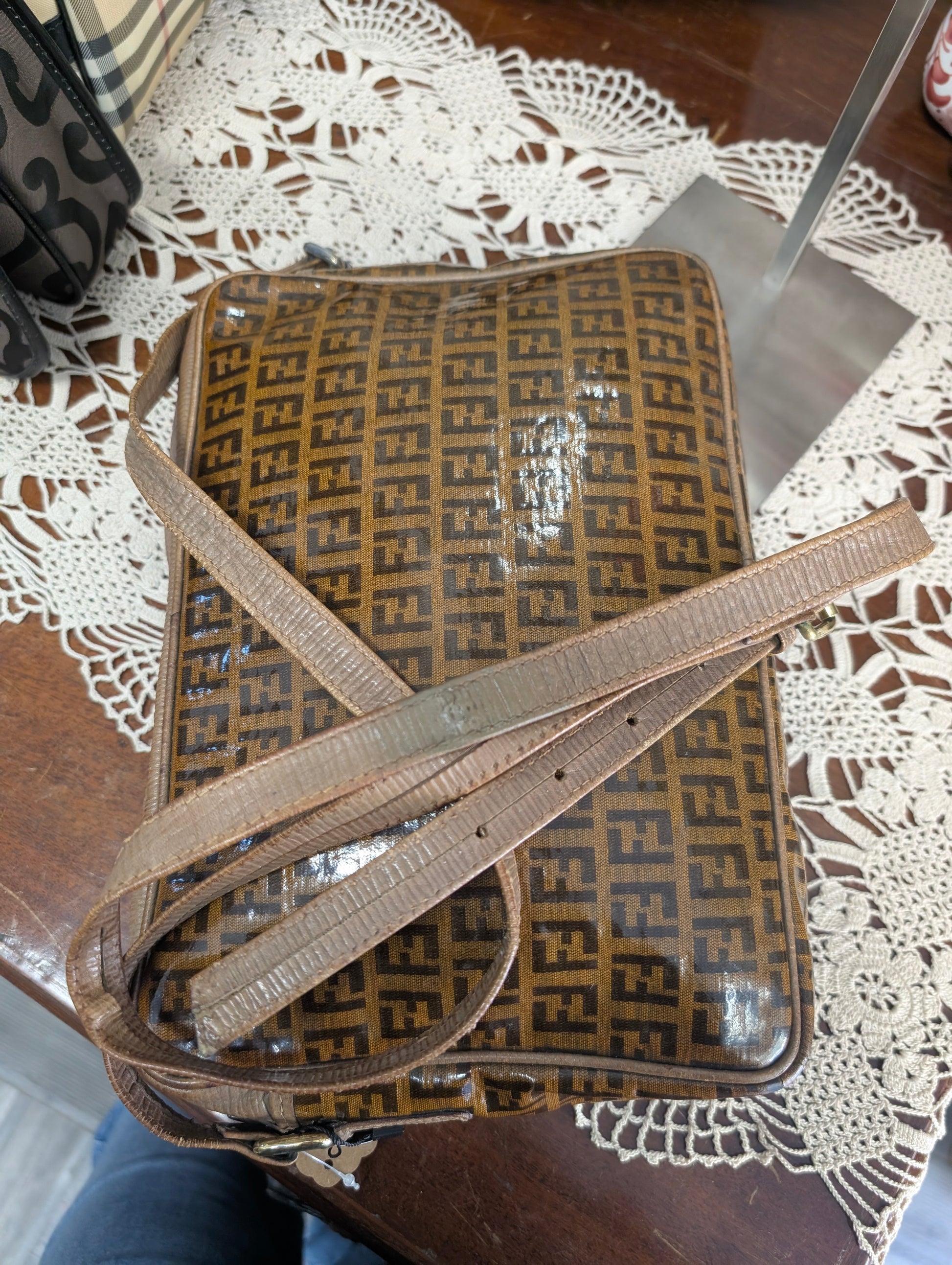 Tracollina vintage di Fendi, risalente agli anni 70, in tela zucchino plastificata e profili in pelle.