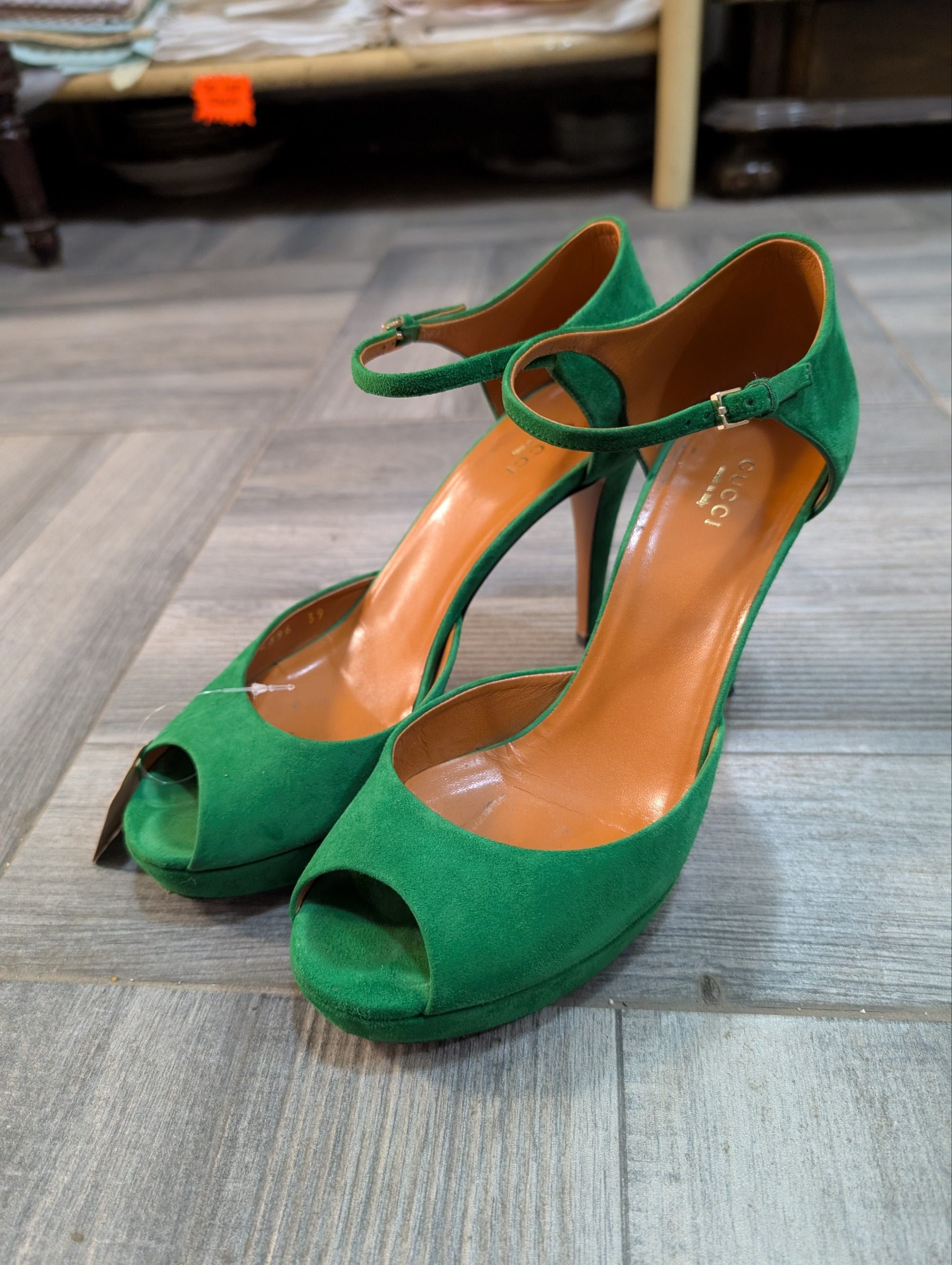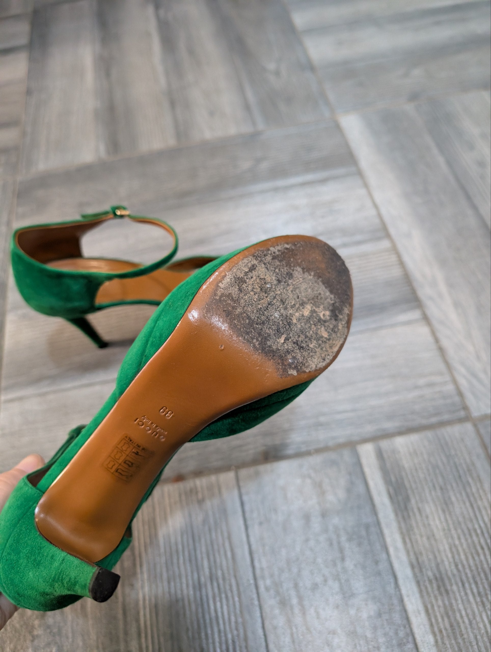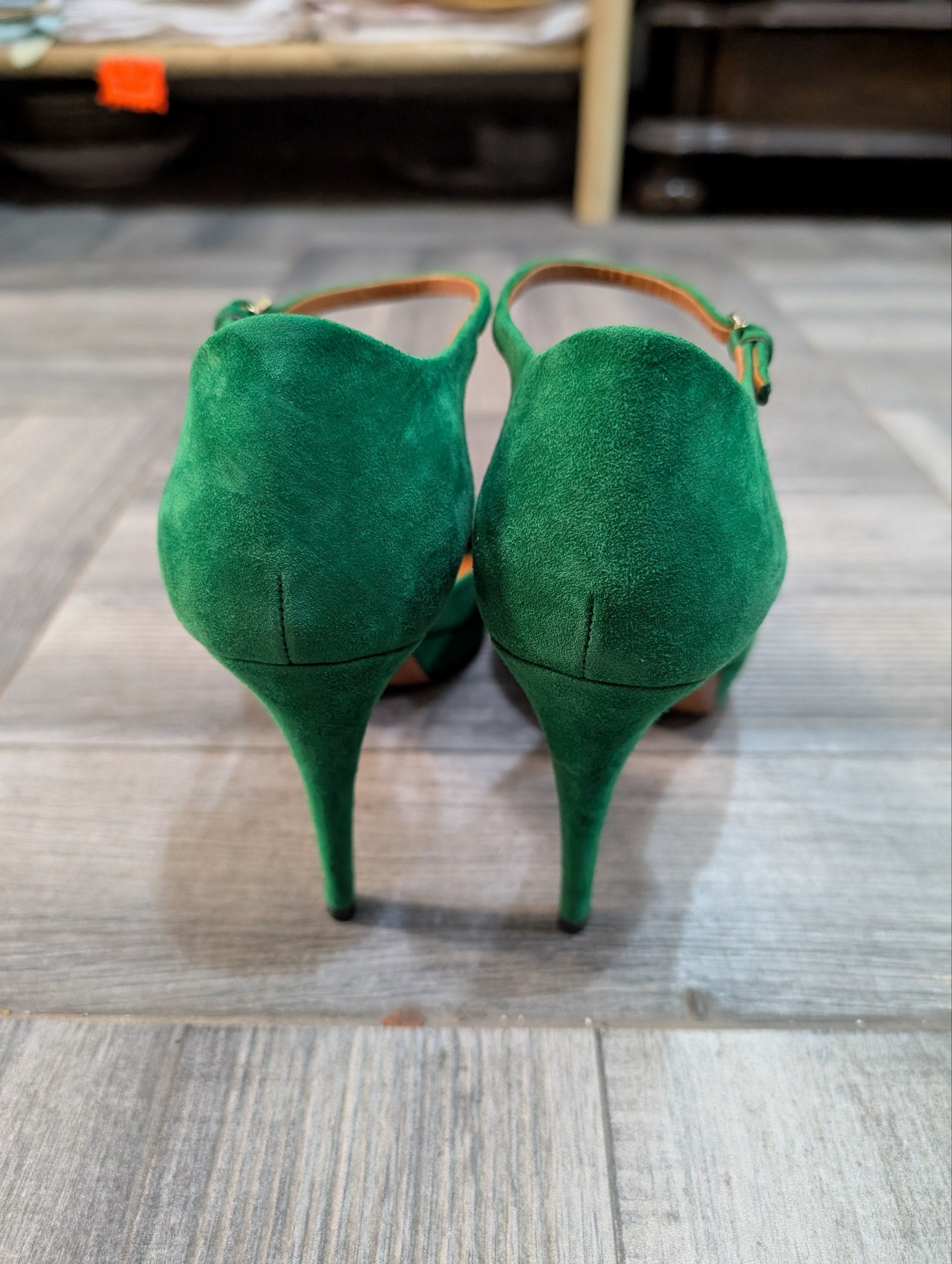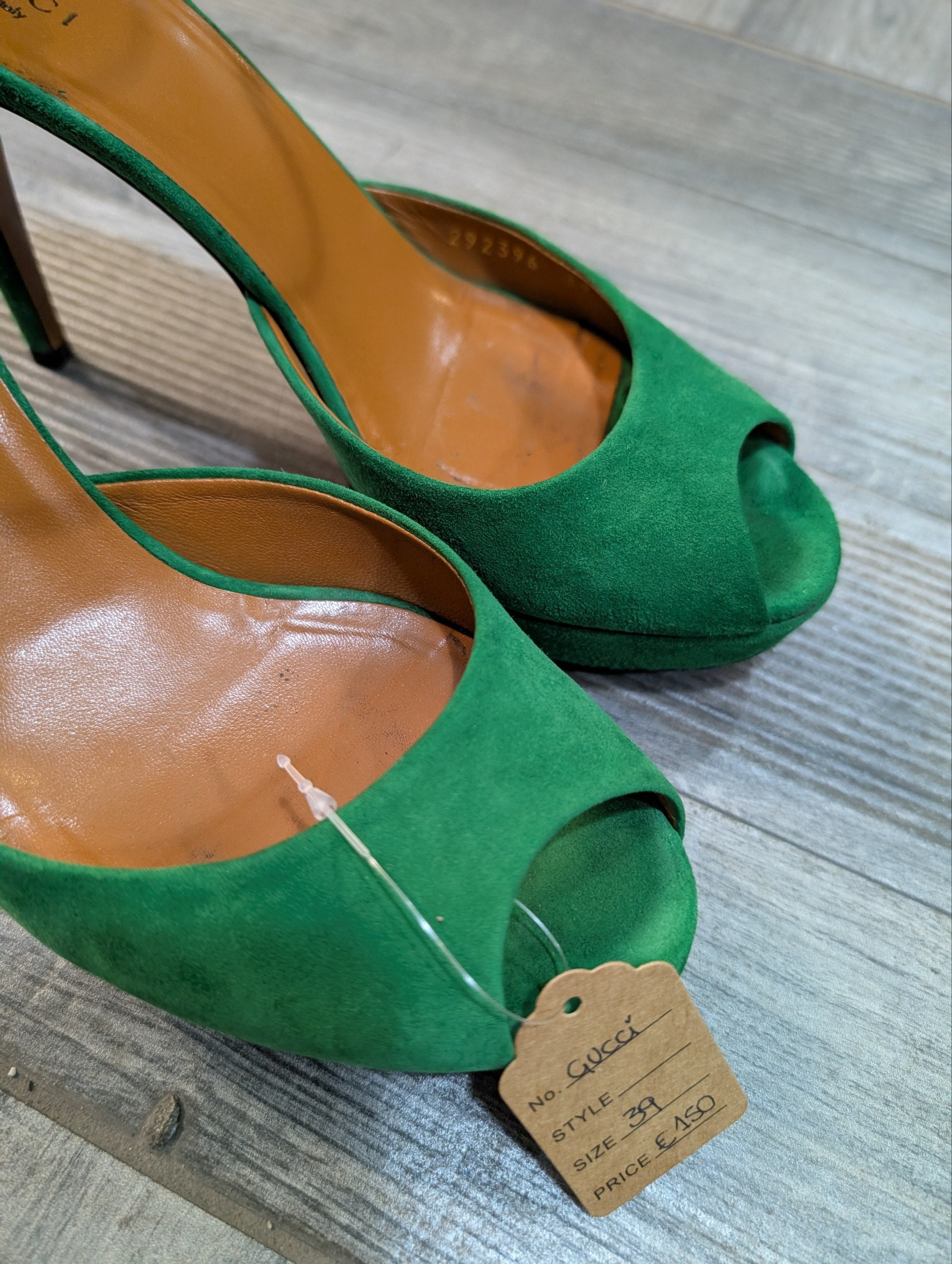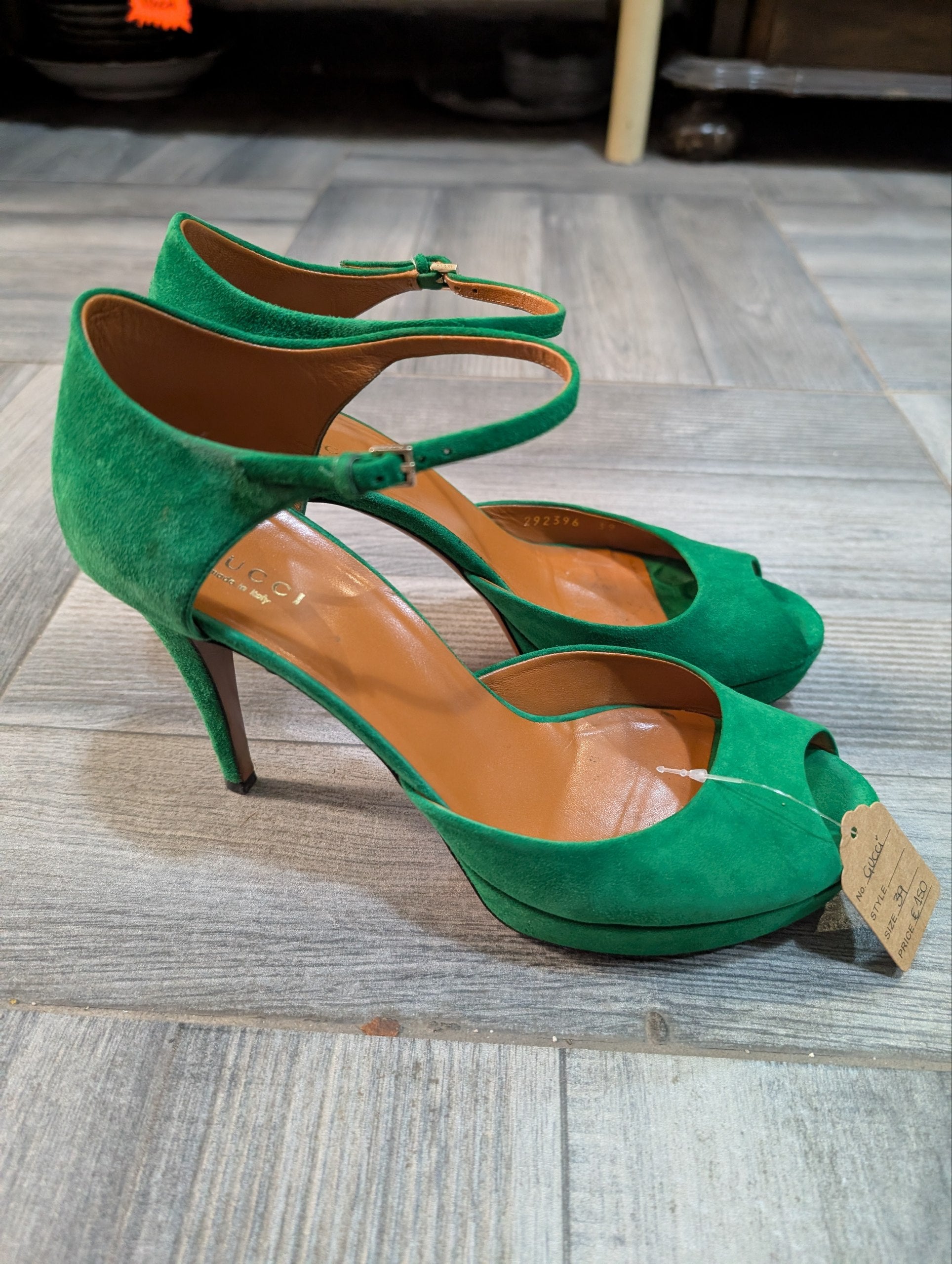 Scarpe con tacco open toe e fibbietta regolabile vintage di Gucci, primi anni 2000. Pelle scamosciata verde, stupende. Buone condizioni generali.