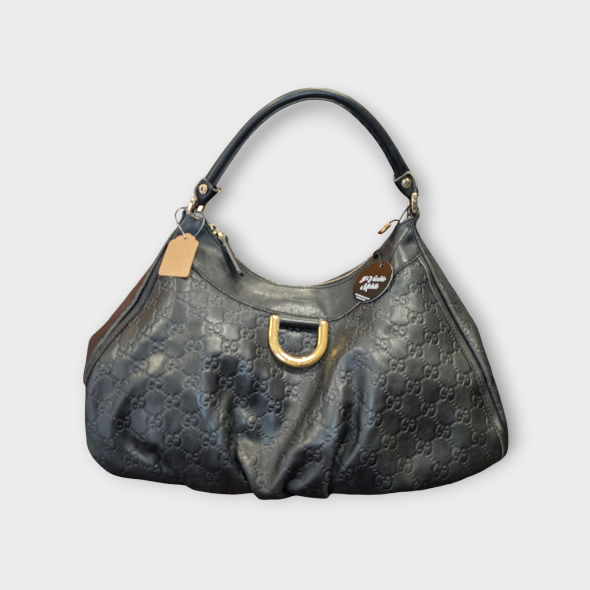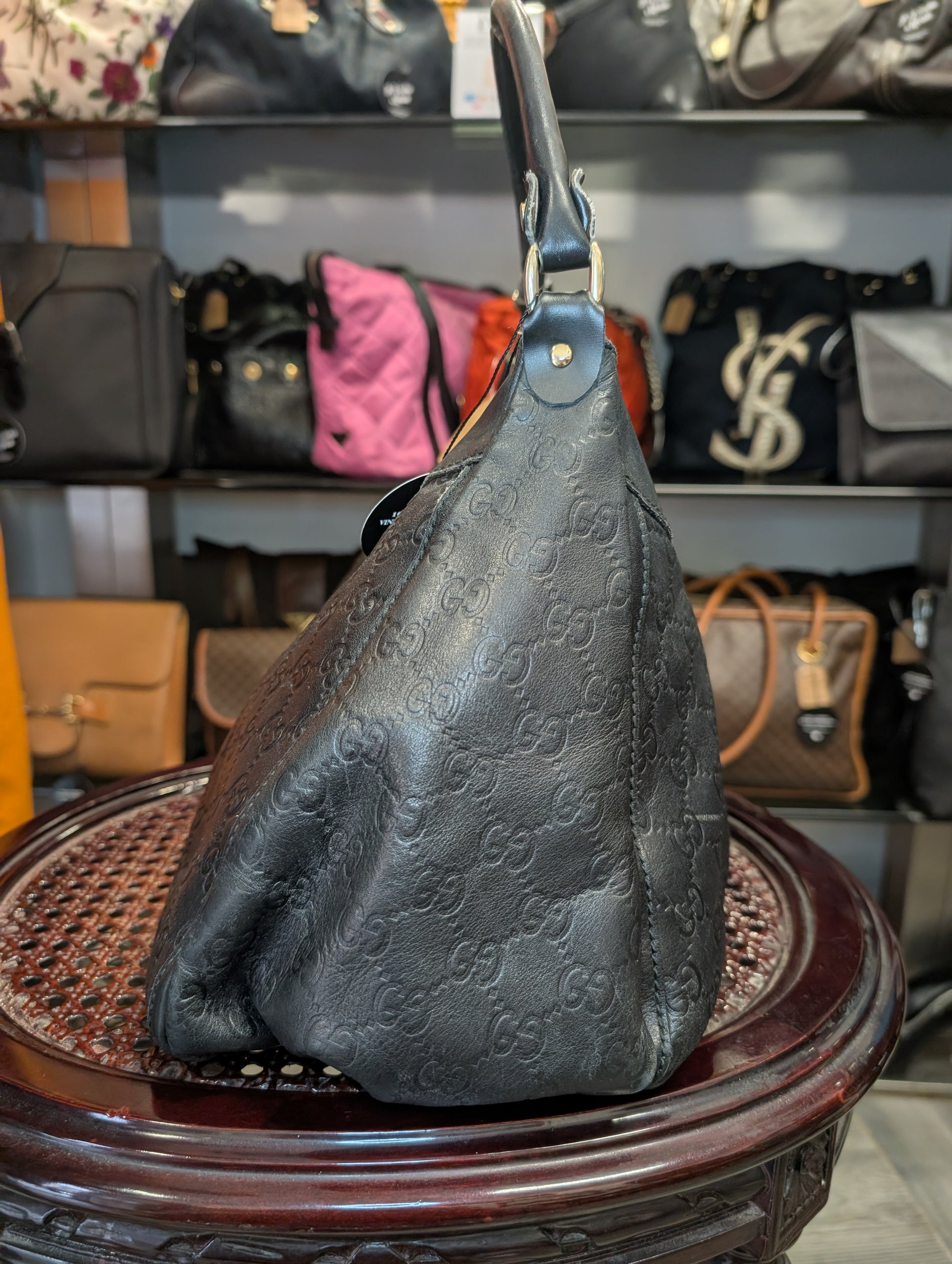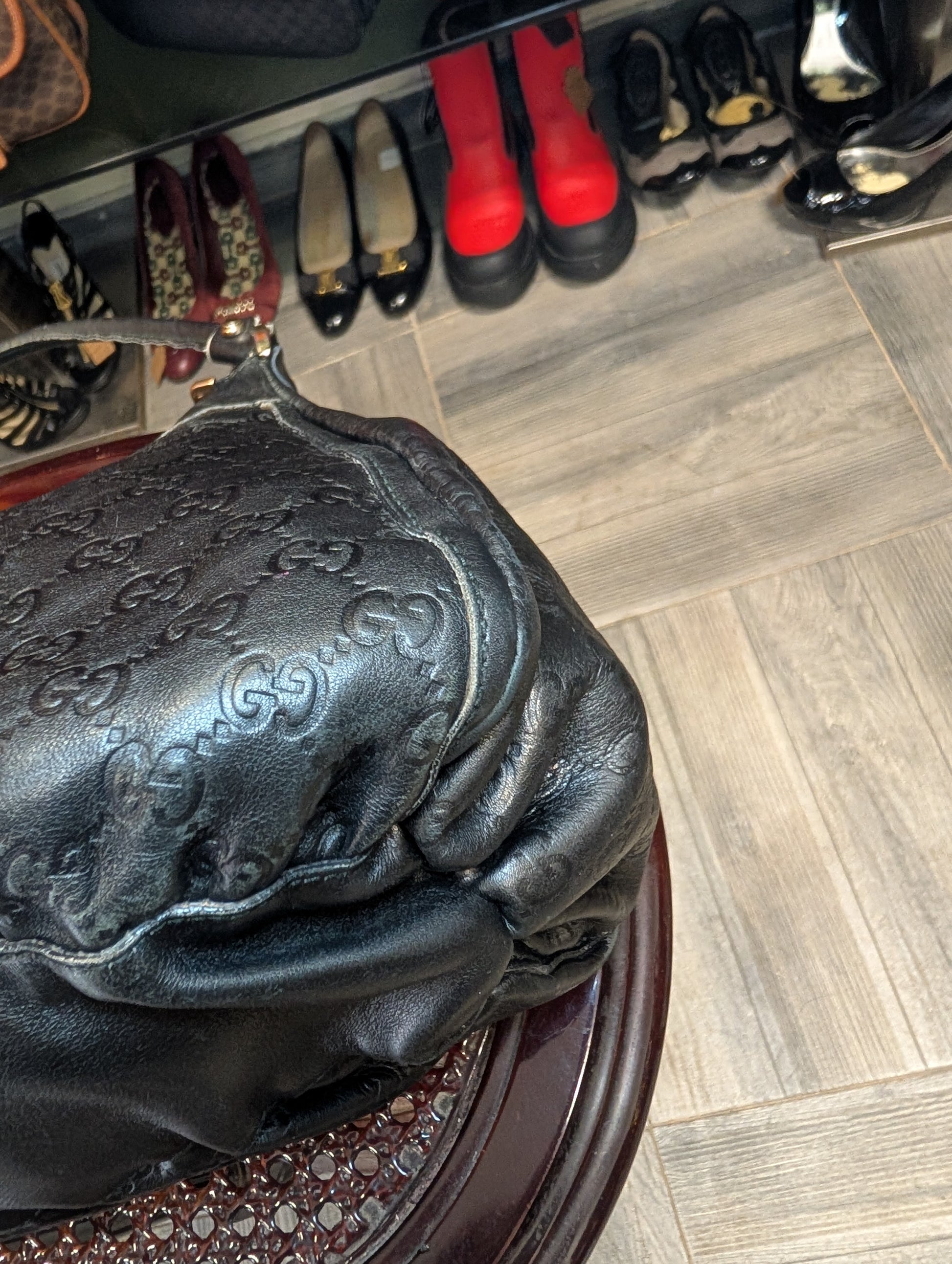 Borsa vintage di Gucci, in pelle nera con logo GG impresso e manico unico.
