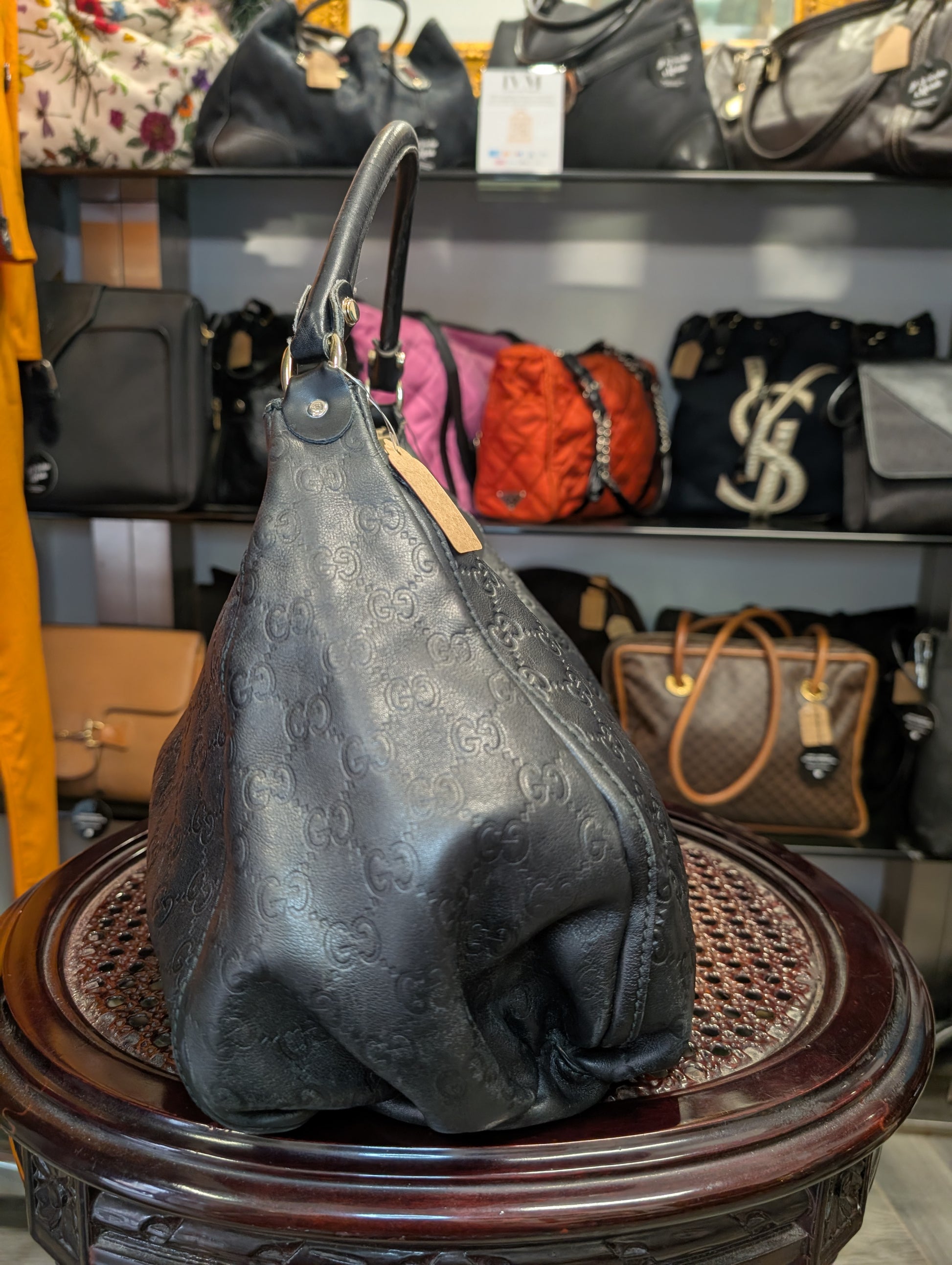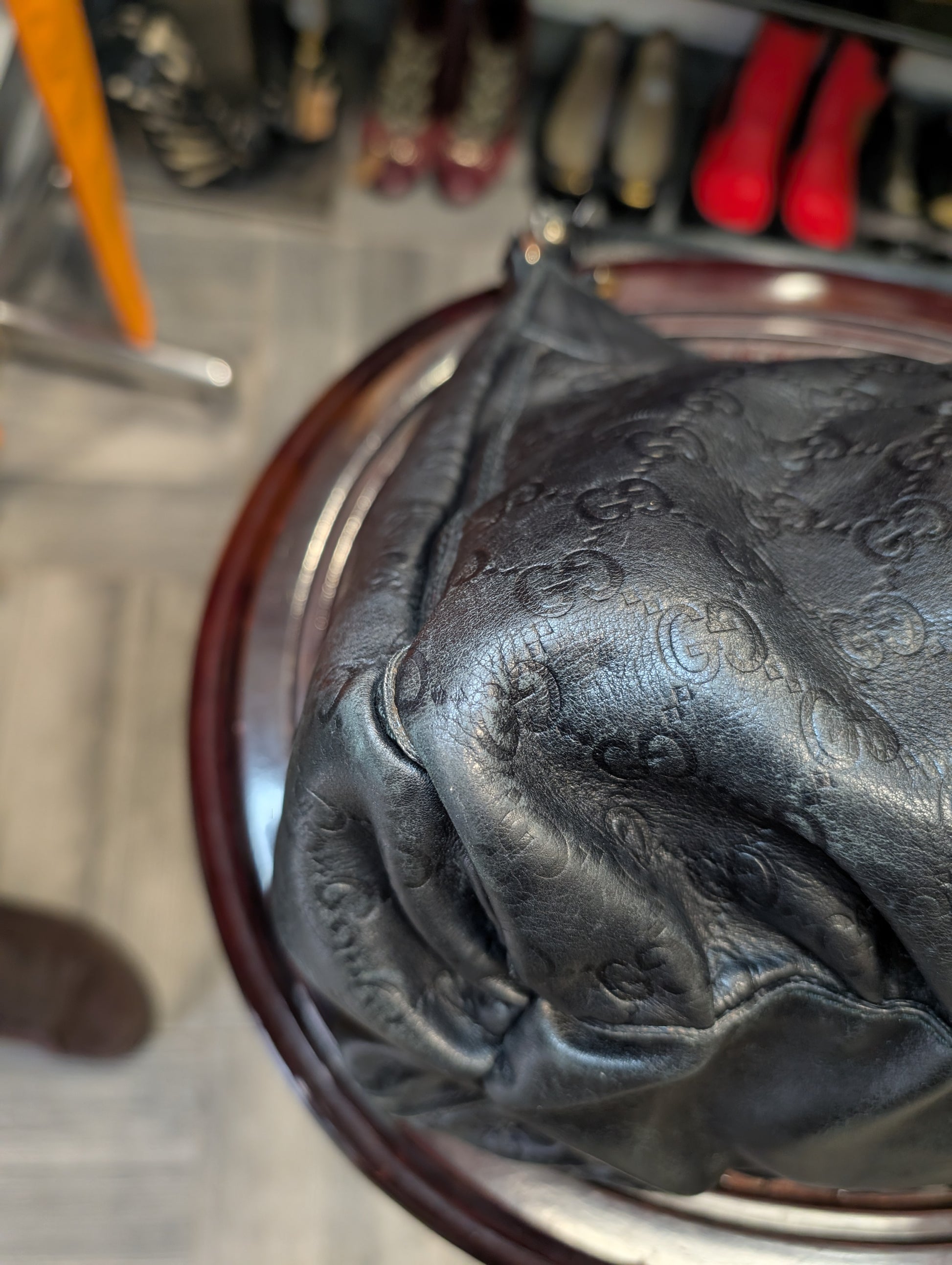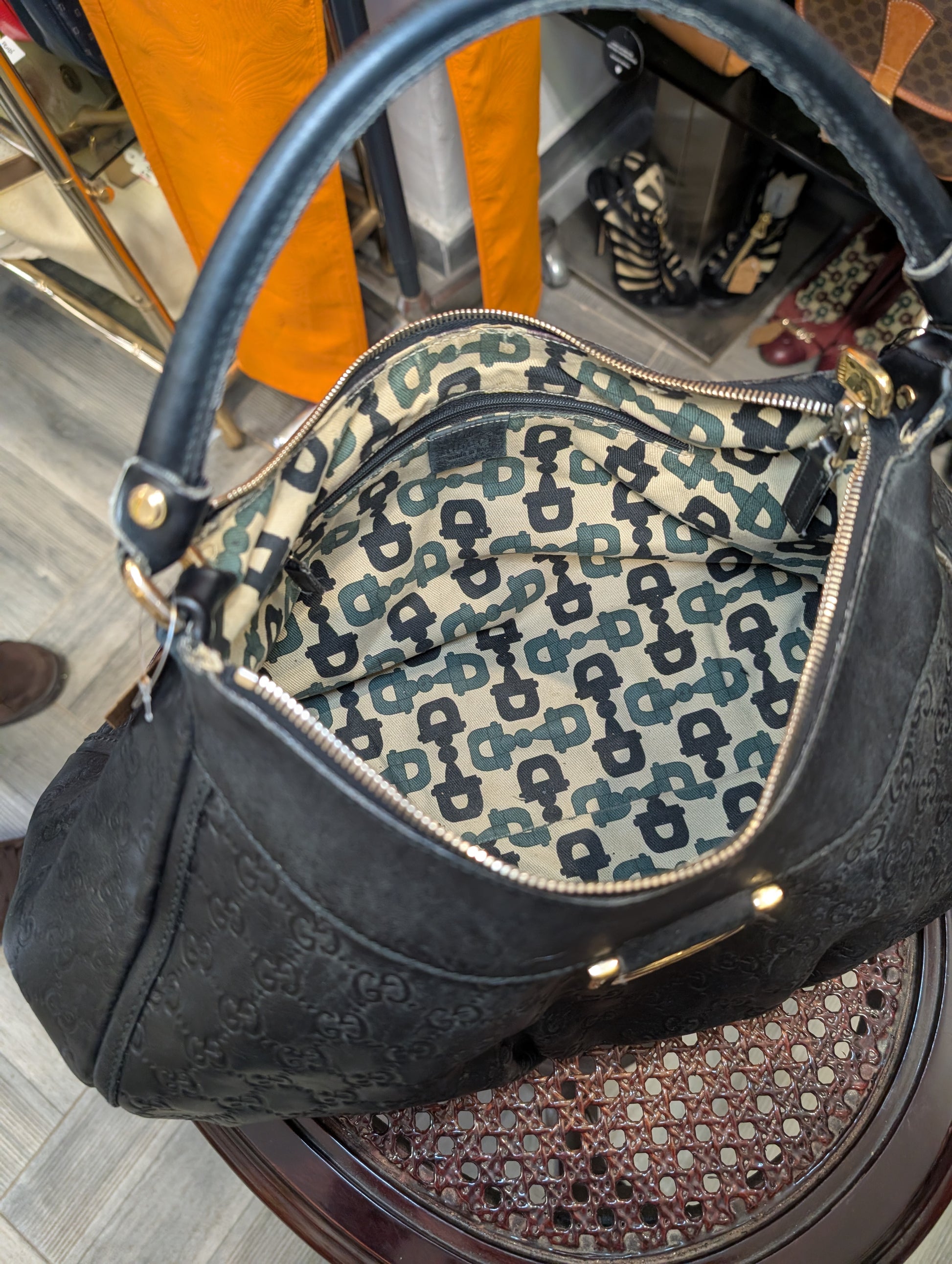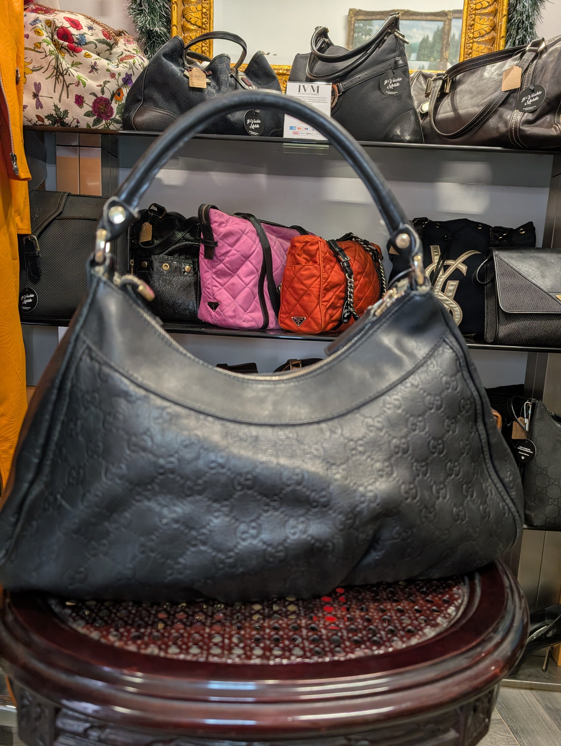 Borsa vintage di Gucci, in pelle nera con logo GG impresso e manico unico.