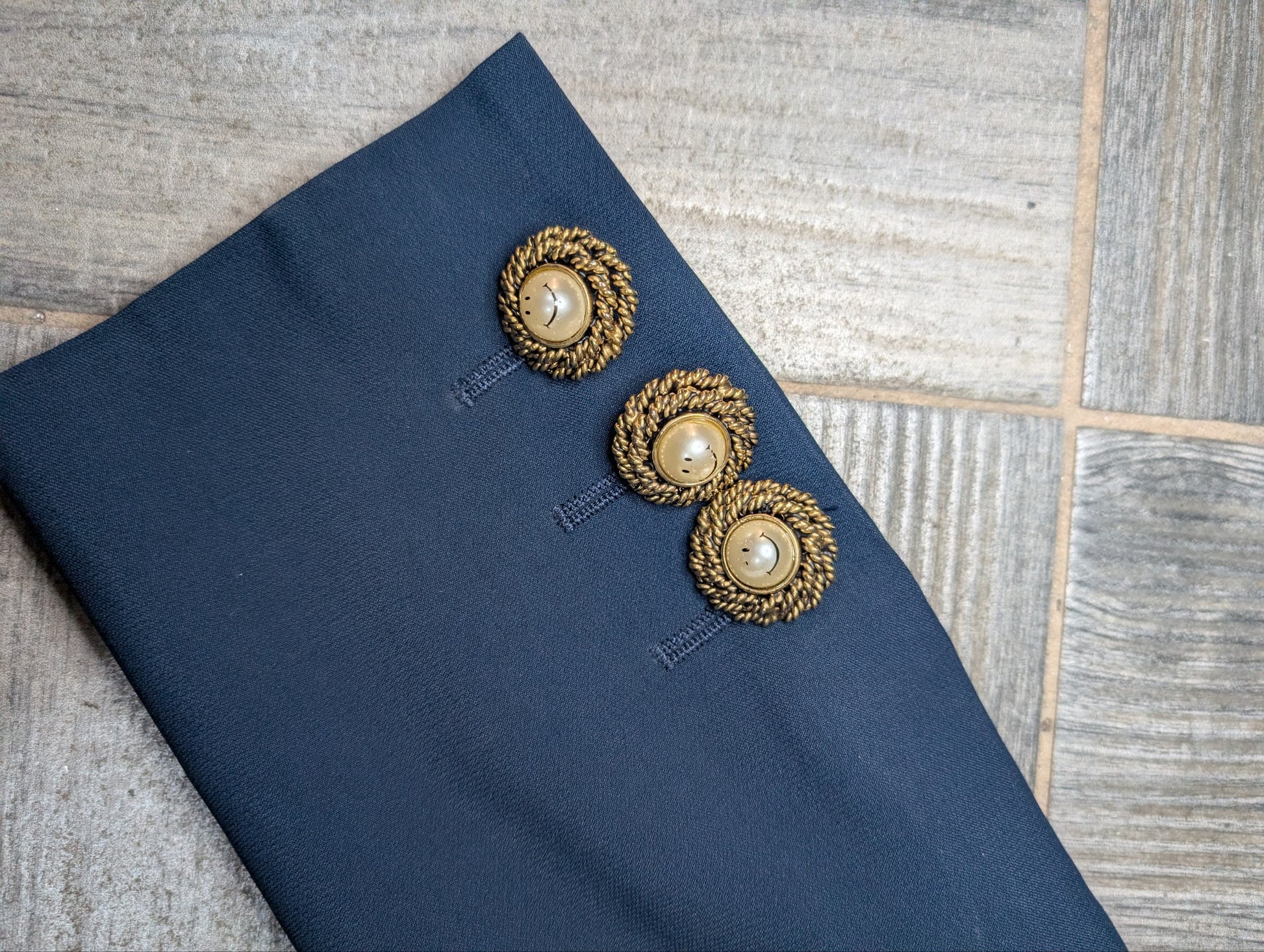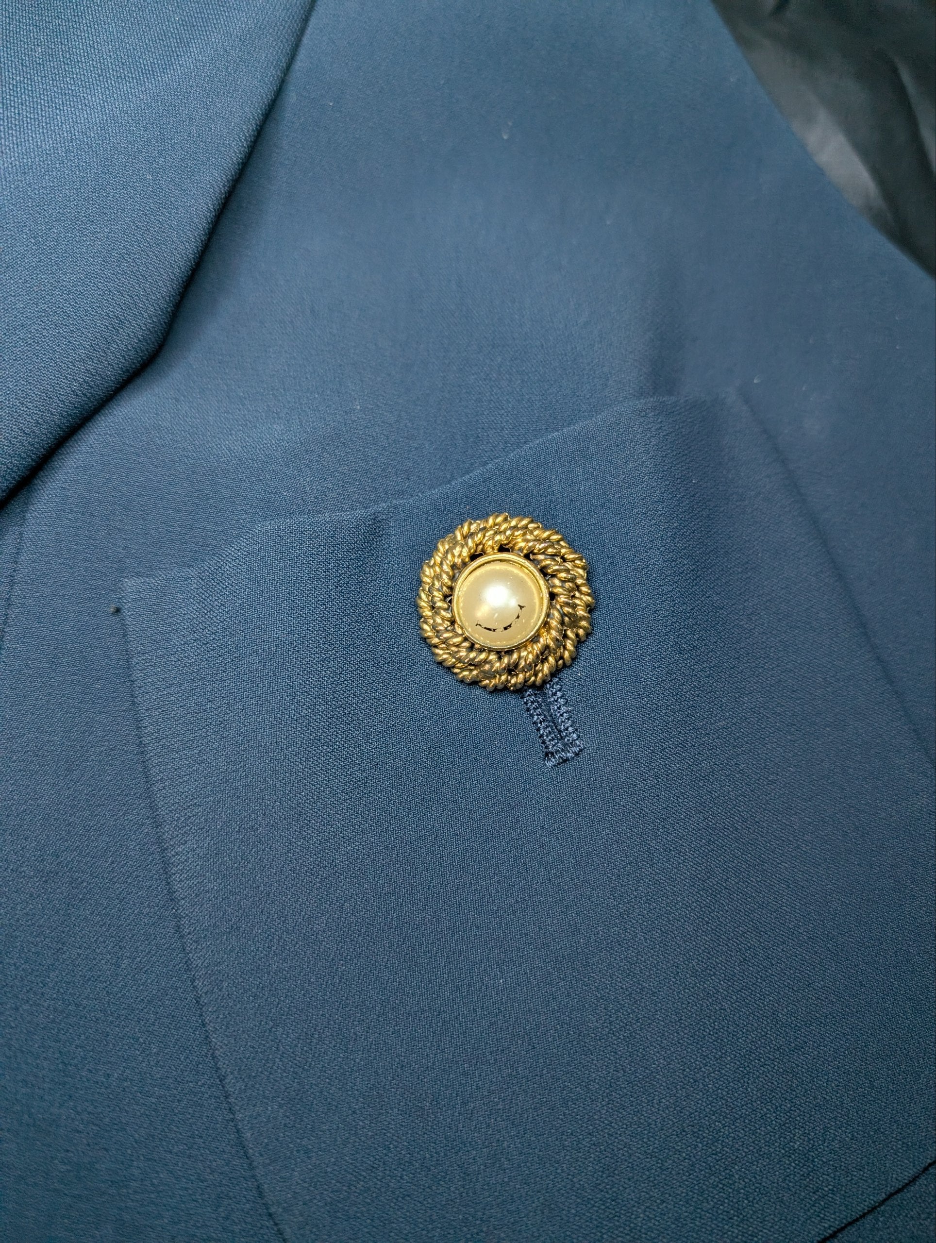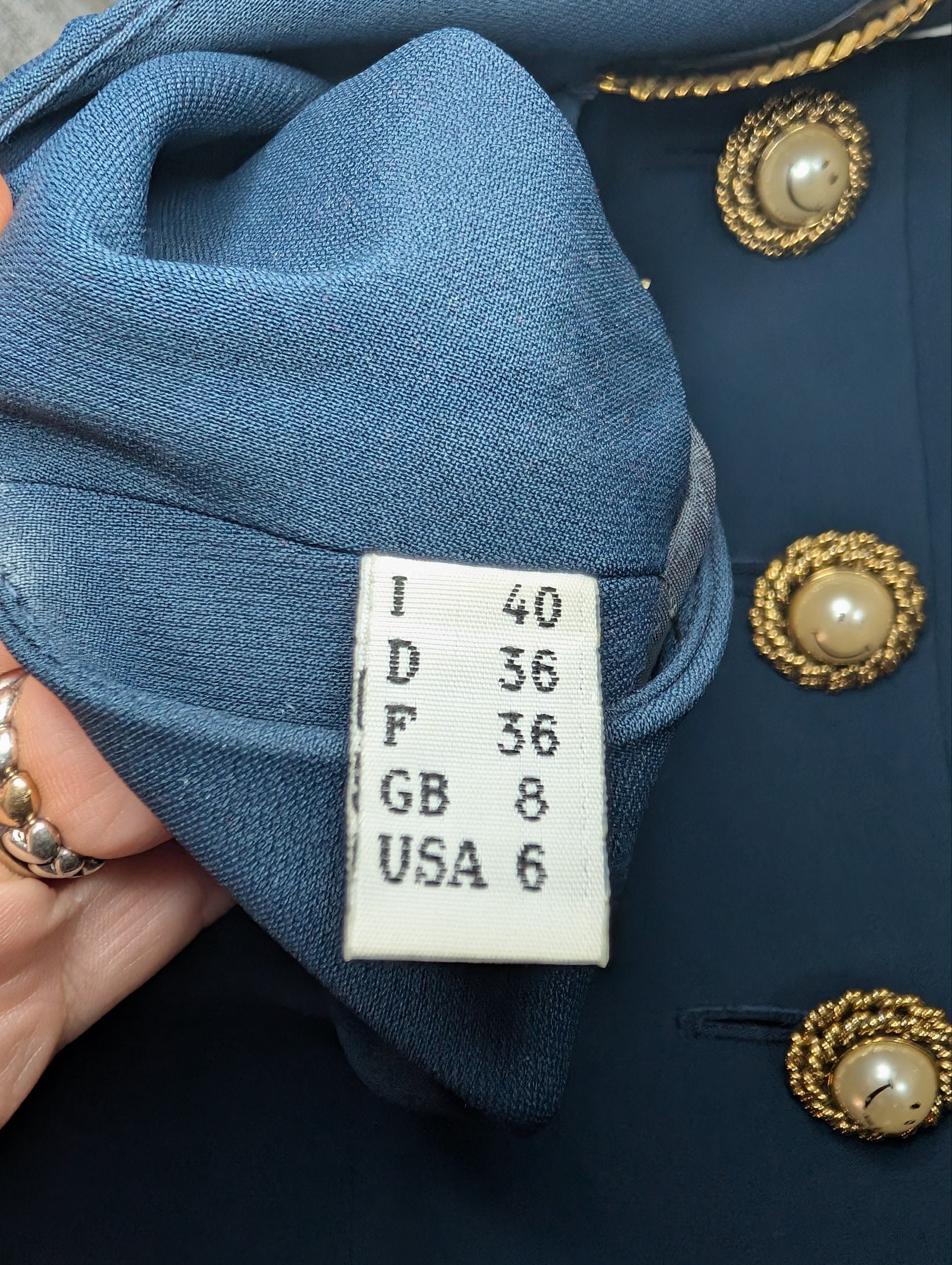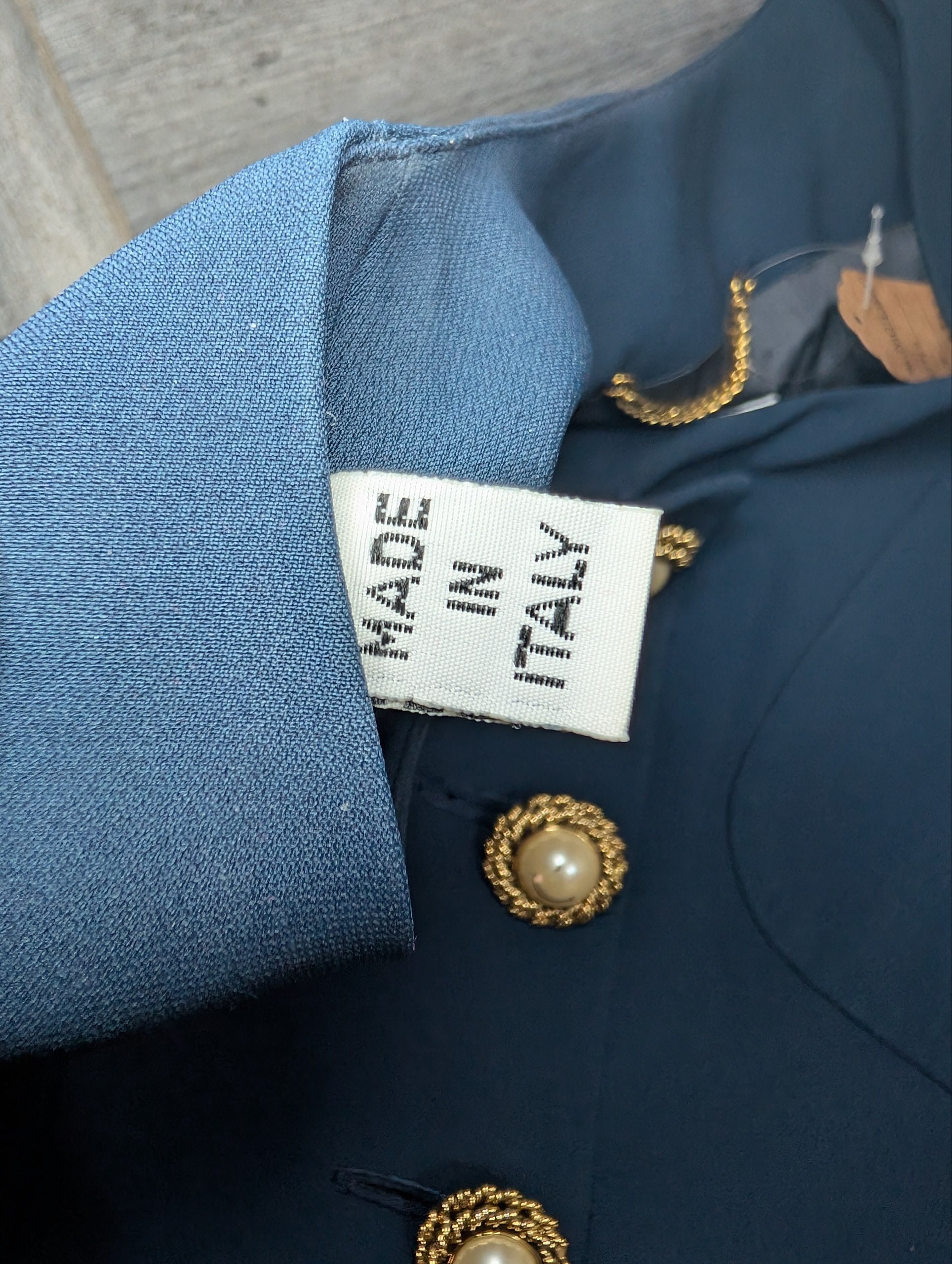 Colore blu scuro, dettagli oro. La giacca si presenta in ottime condizioni, tuttavia i bottoni presentano sbiaditure, e uno è danneggiato, ma riparabile. (Tutto visibile in foto).