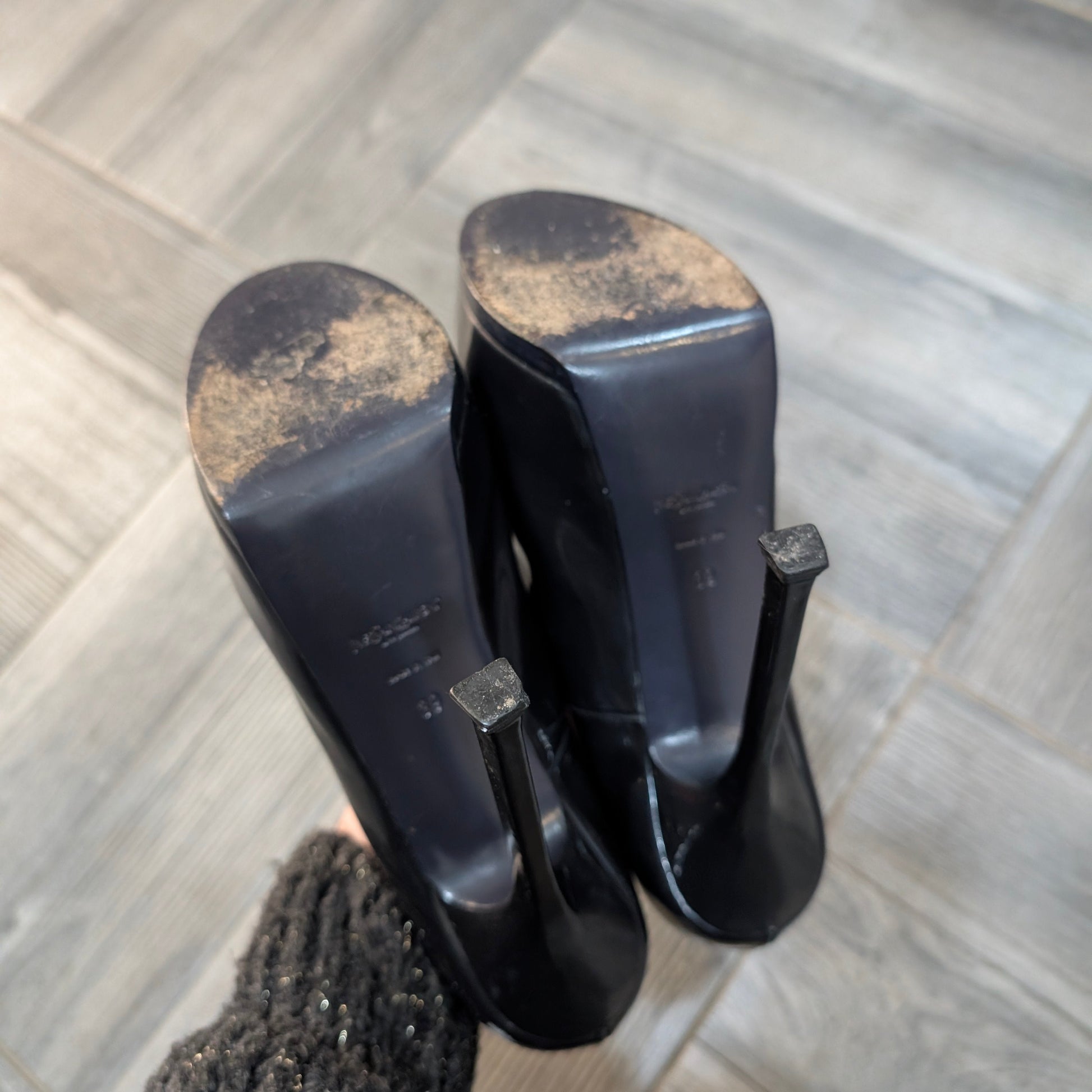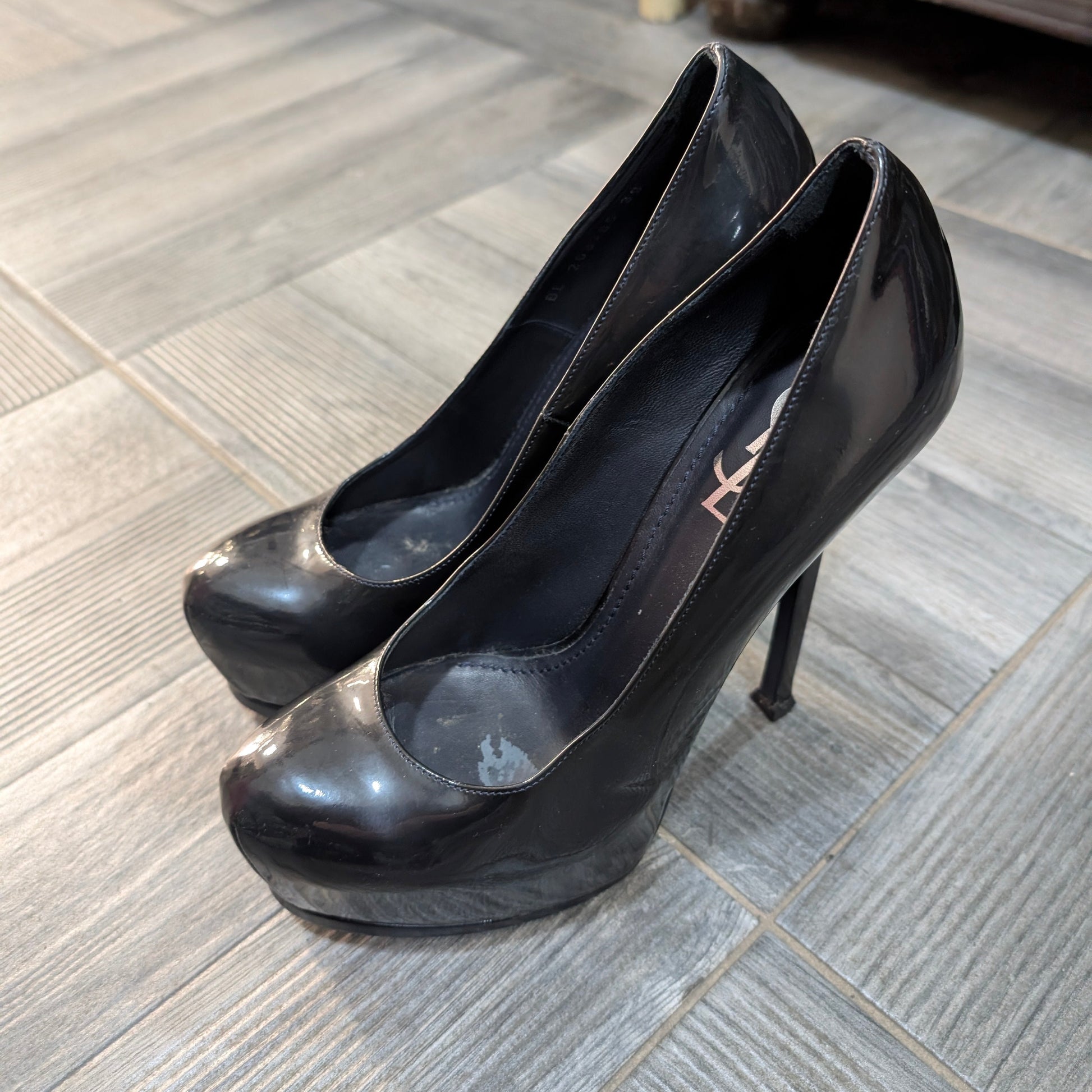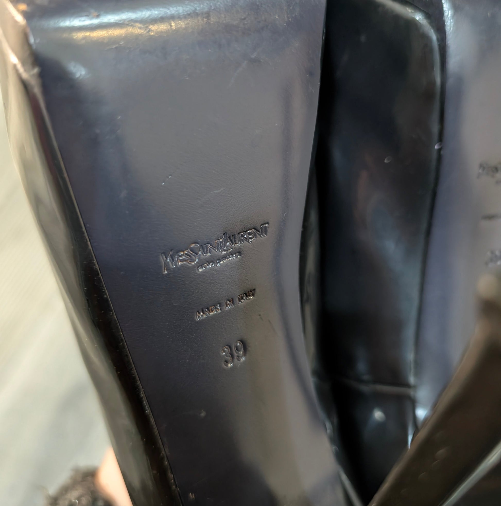 Scarpe con tacco e plateau in pelle verniciata nera di Yves Saint Laurent, primi anni 2000.