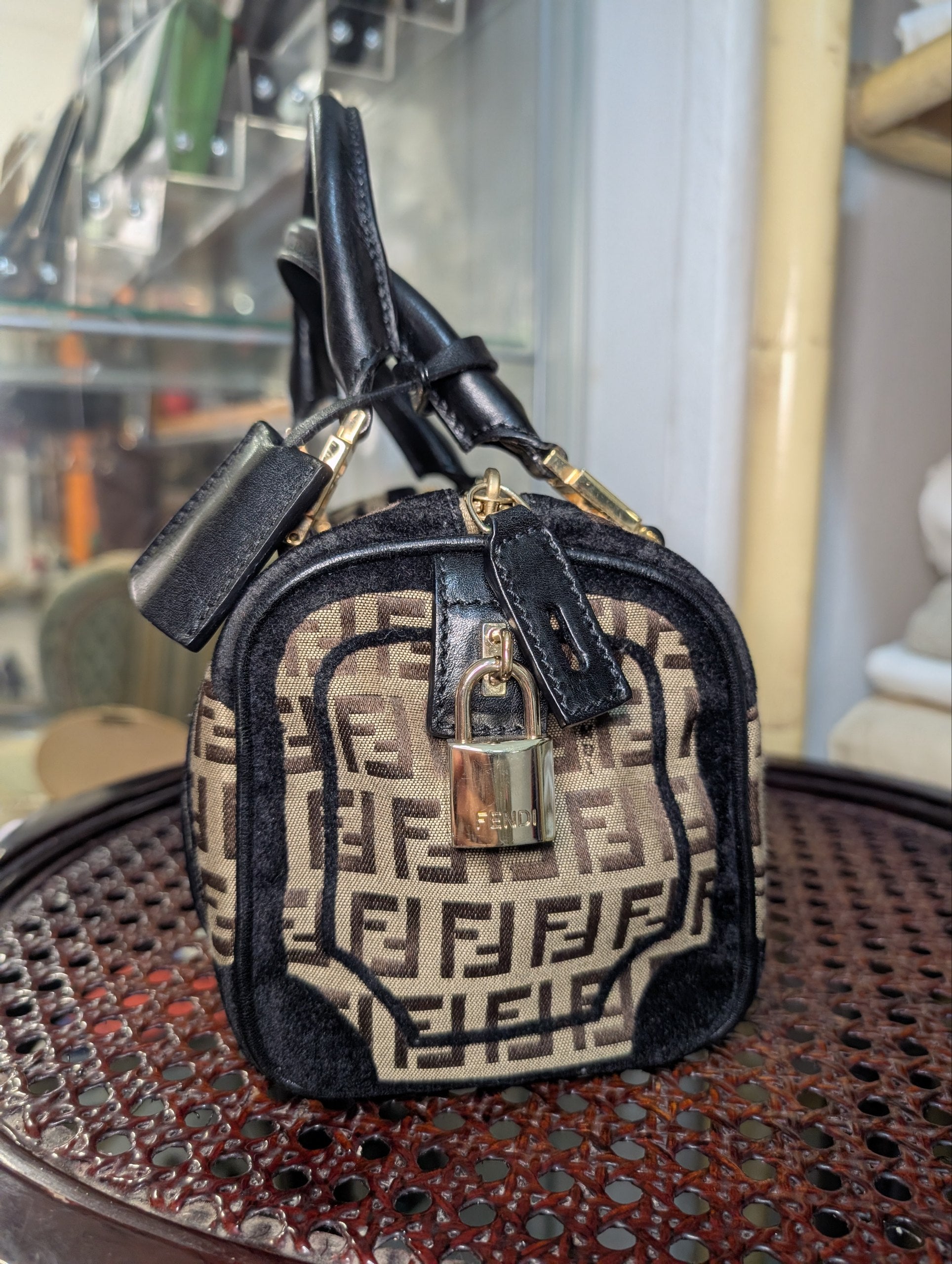 Stupendo bauletto Fendi, in tela zucchino e profili in pelle nera.
