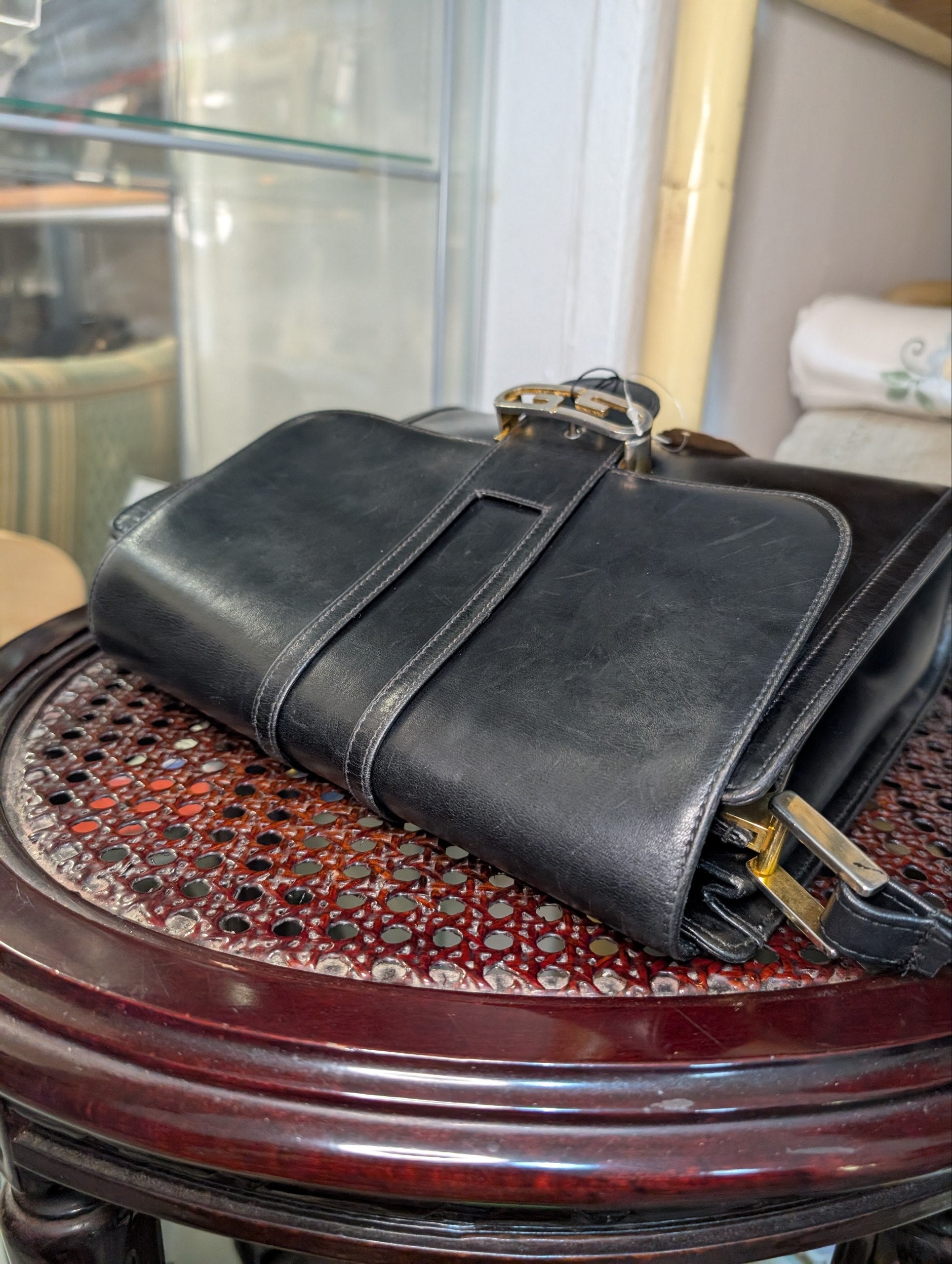 Tracollina più vintage che non si può di Gucci, in pelle liscia nera, chiusura con chiodo e GG.