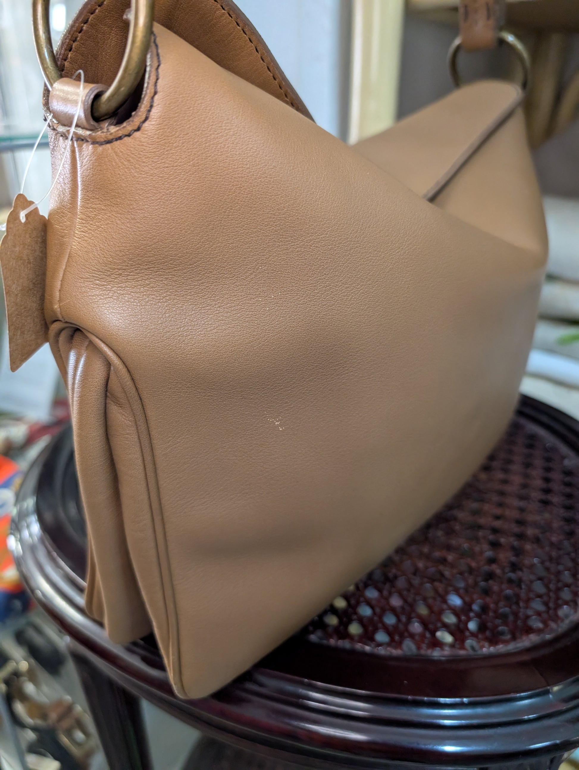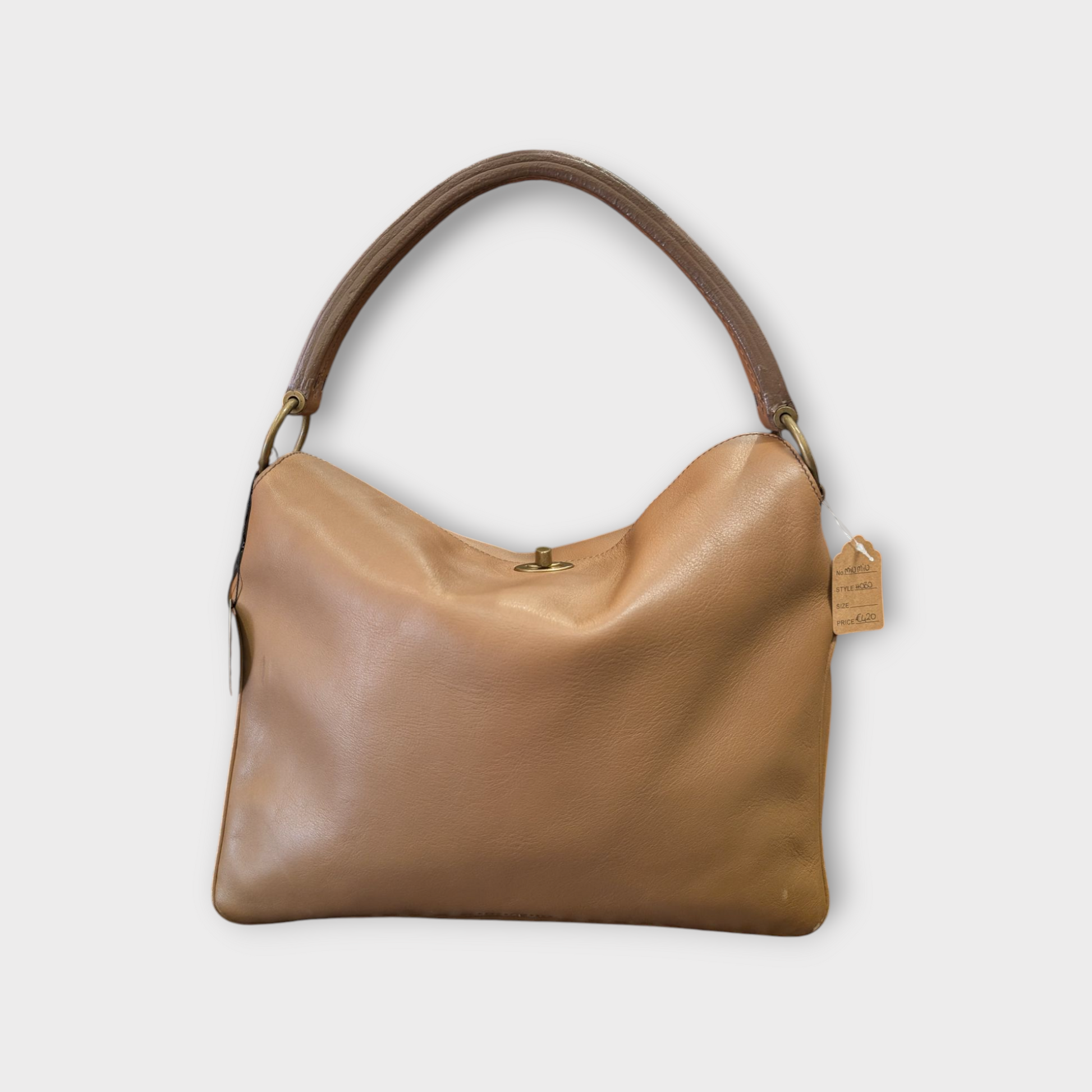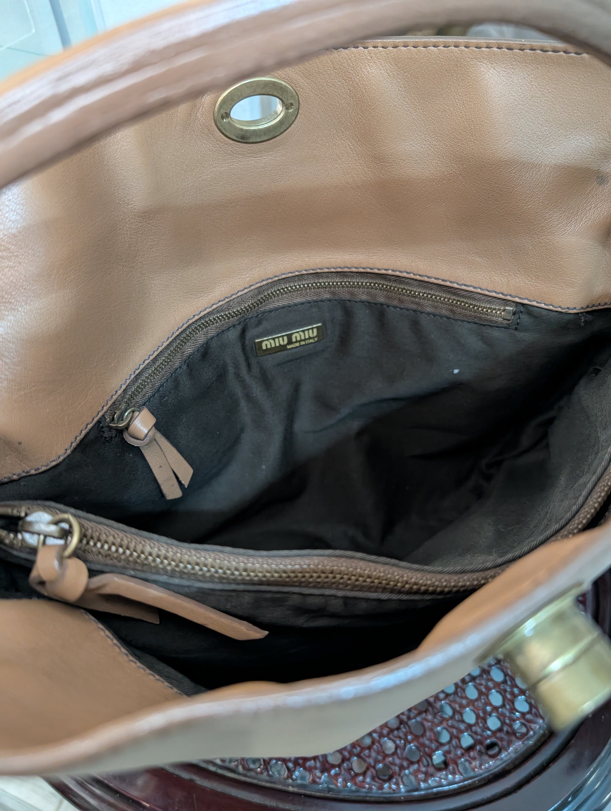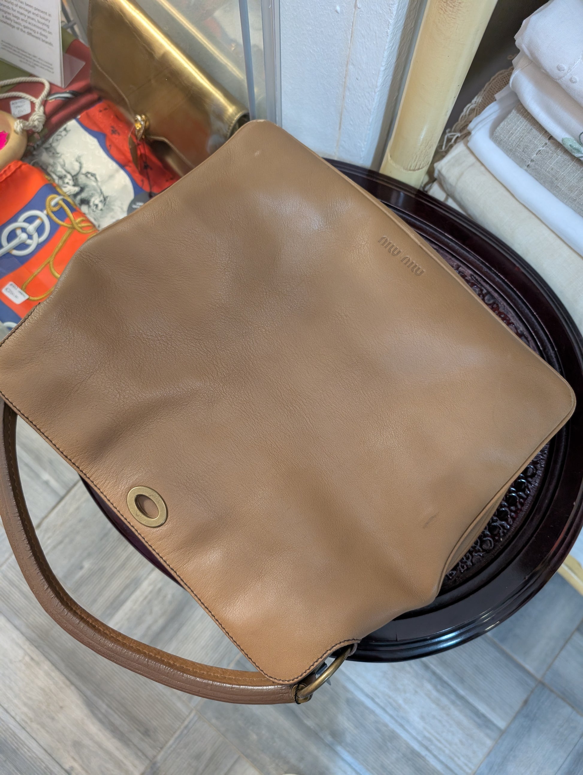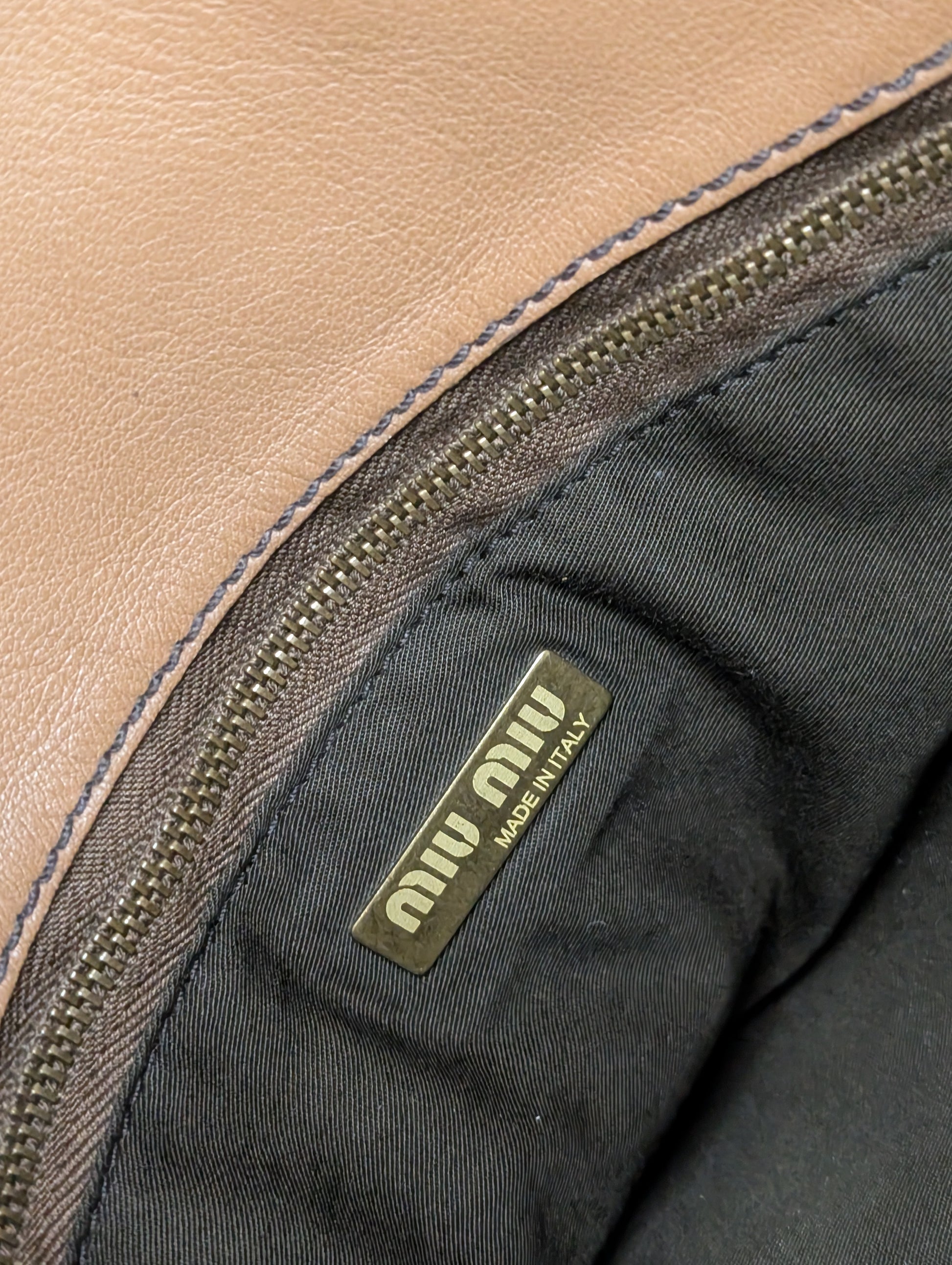 Unico manico, modello a soffietto, chiusura ad incastro, capiente e con vari scomparti interni. Morbidissima pelle beige/cammello. Logo Miu Miu impresso in basso sul fronte della borsa.