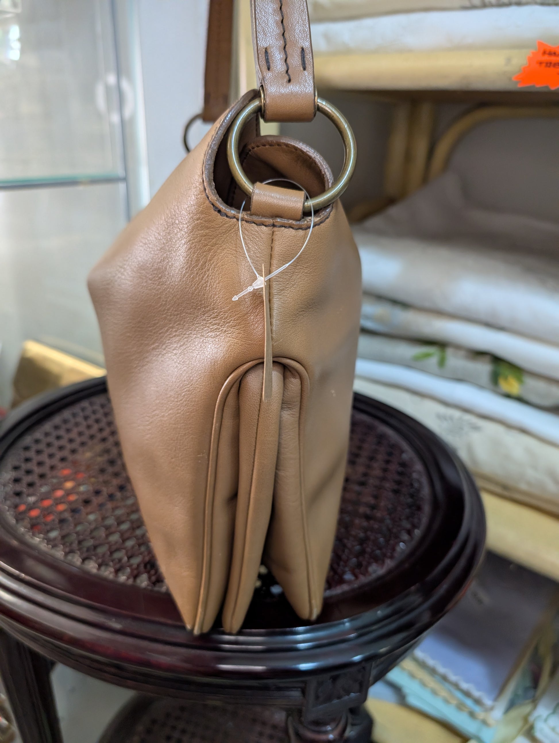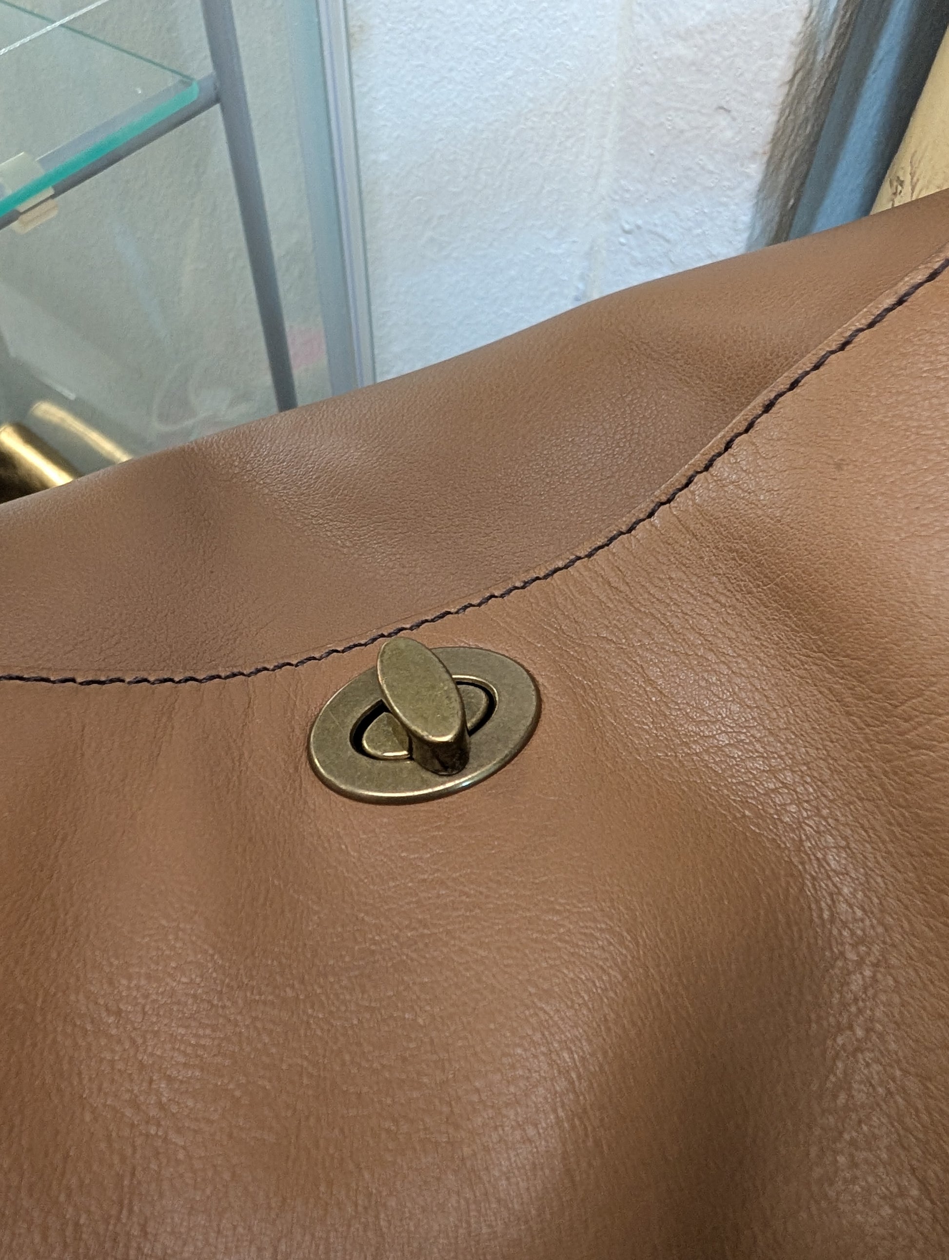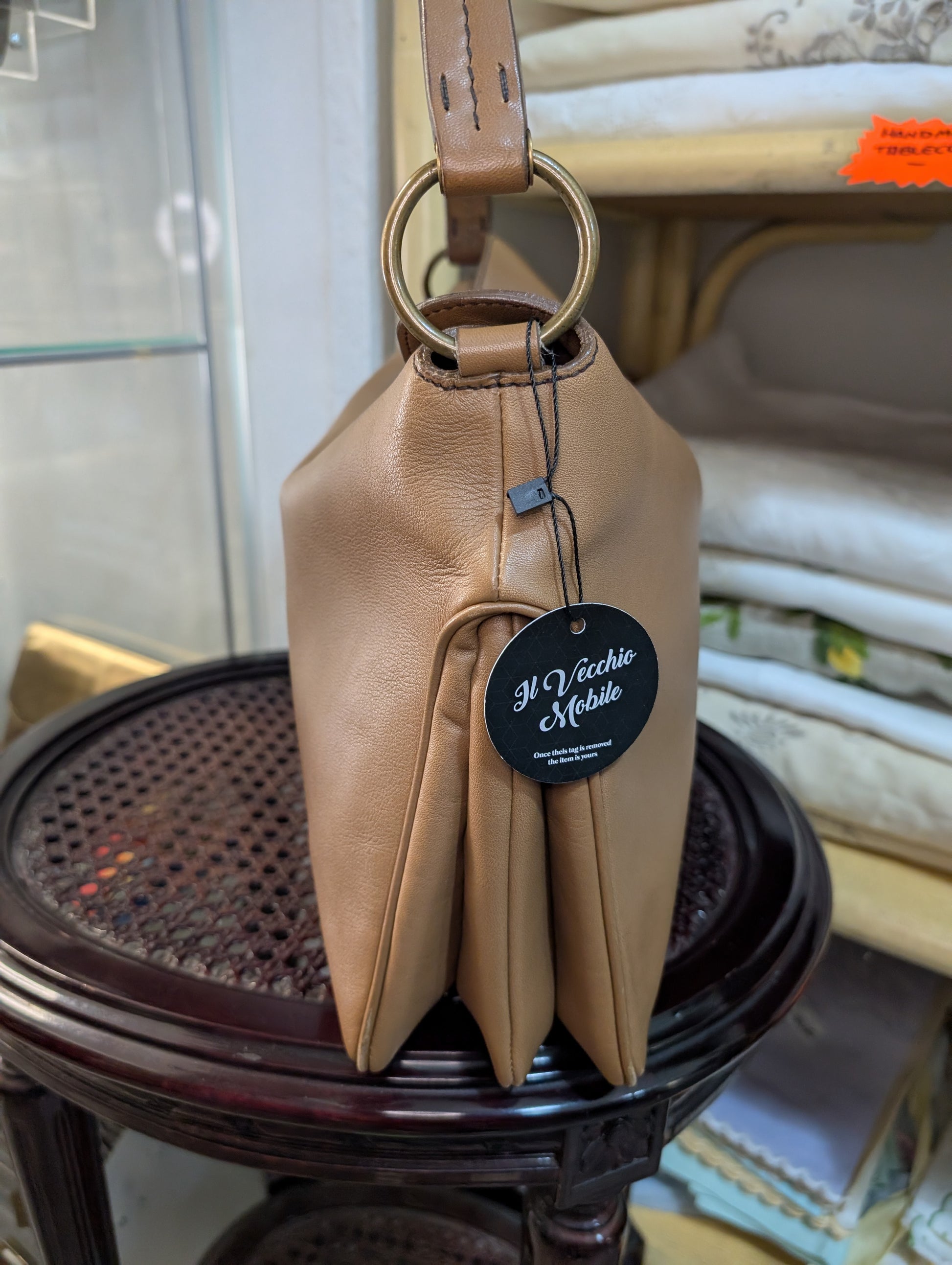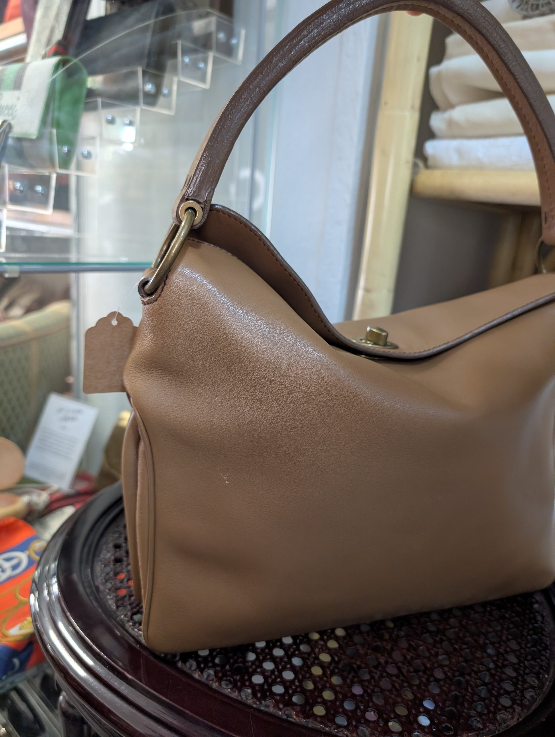 Unico manico, modello a soffietto, chiusura ad incastro, capiente e con vari scomparti interni. Morbidissima pelle beige/cammello. Logo Miu Miu impresso in basso sul fronte della borsa.