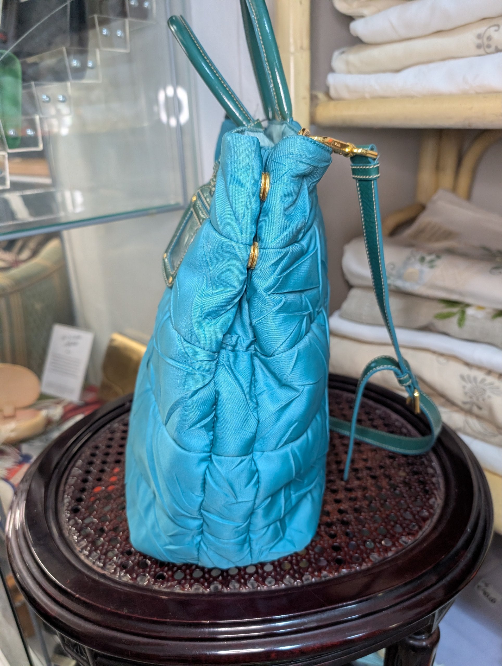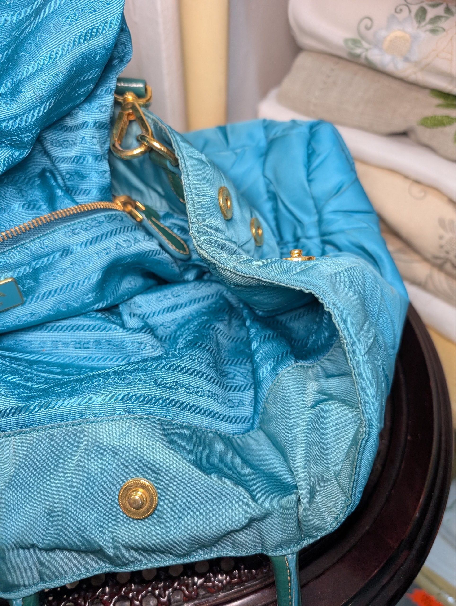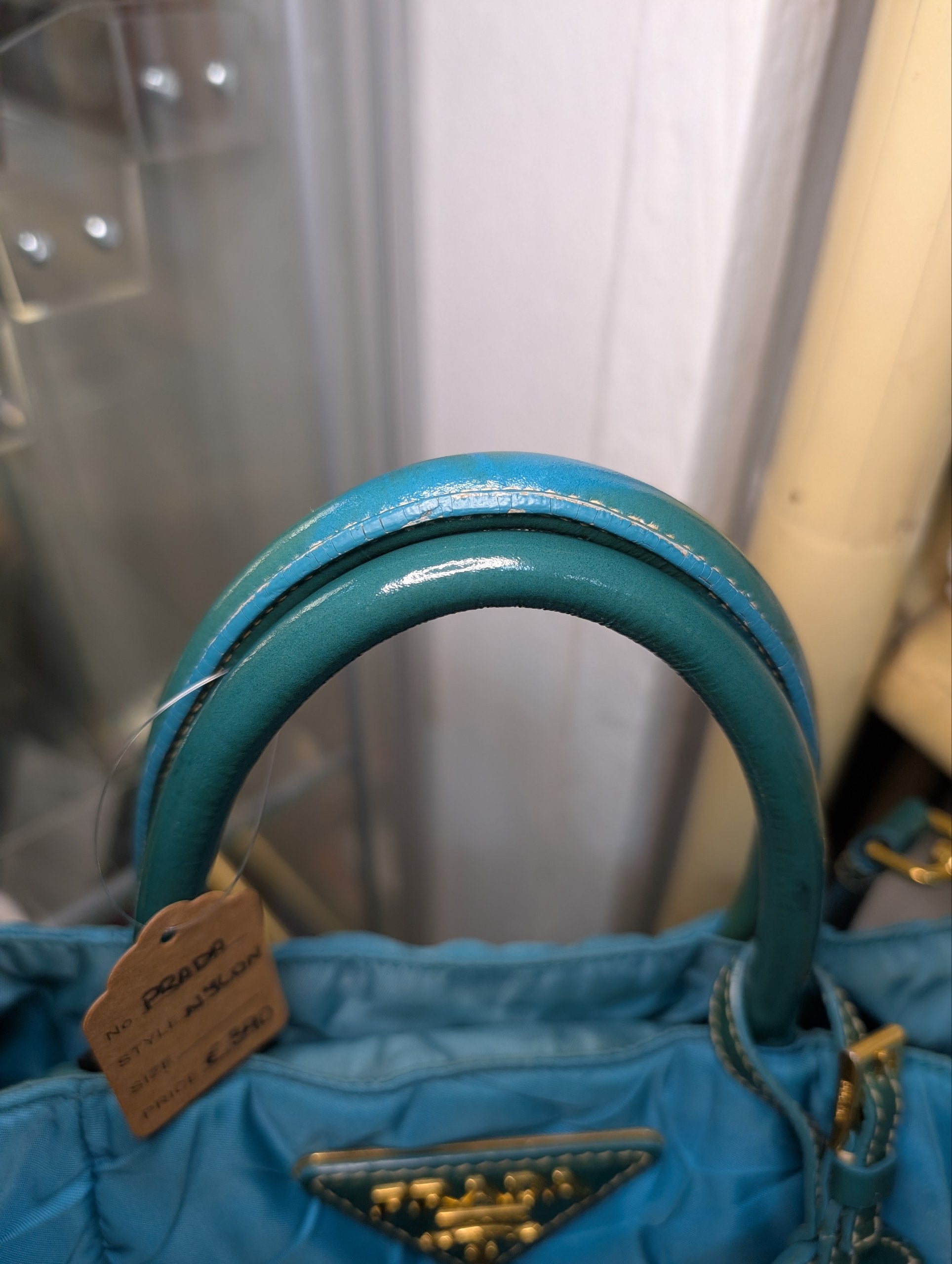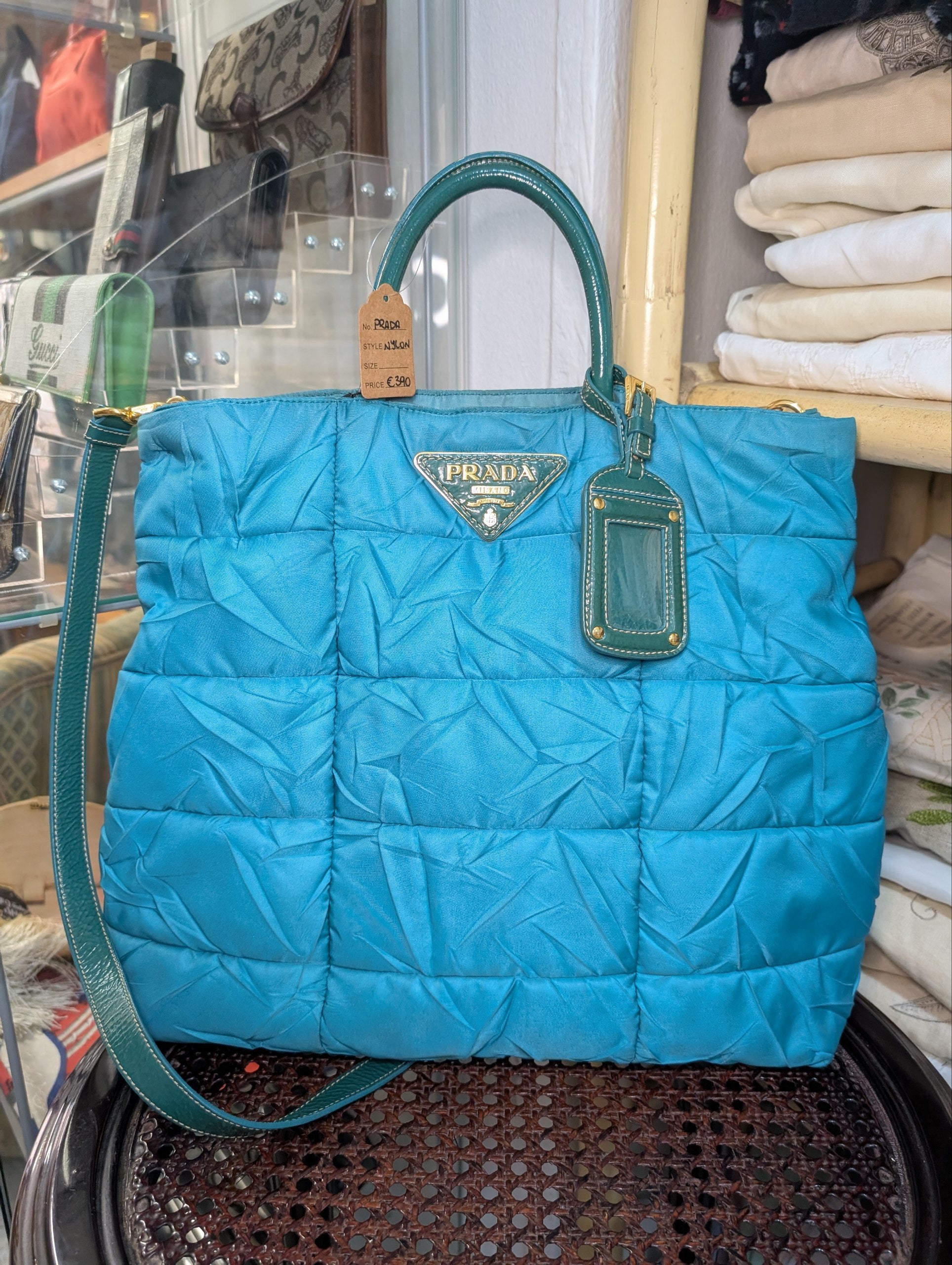 Prada borsa in nylon, effetto stropicciato, colore verde acqua. Completa di tracolla regolabile, doppi manici, tag removibile.