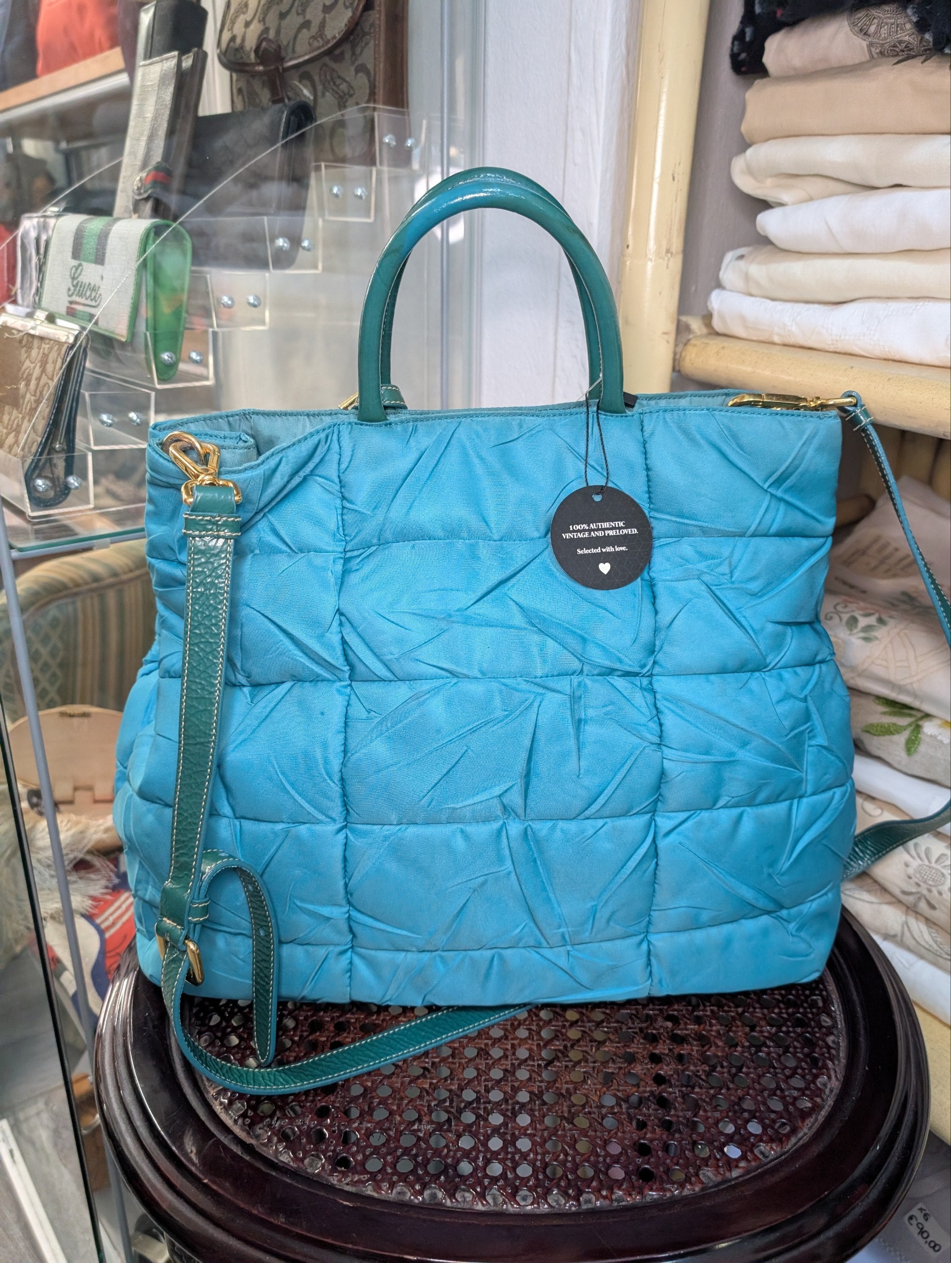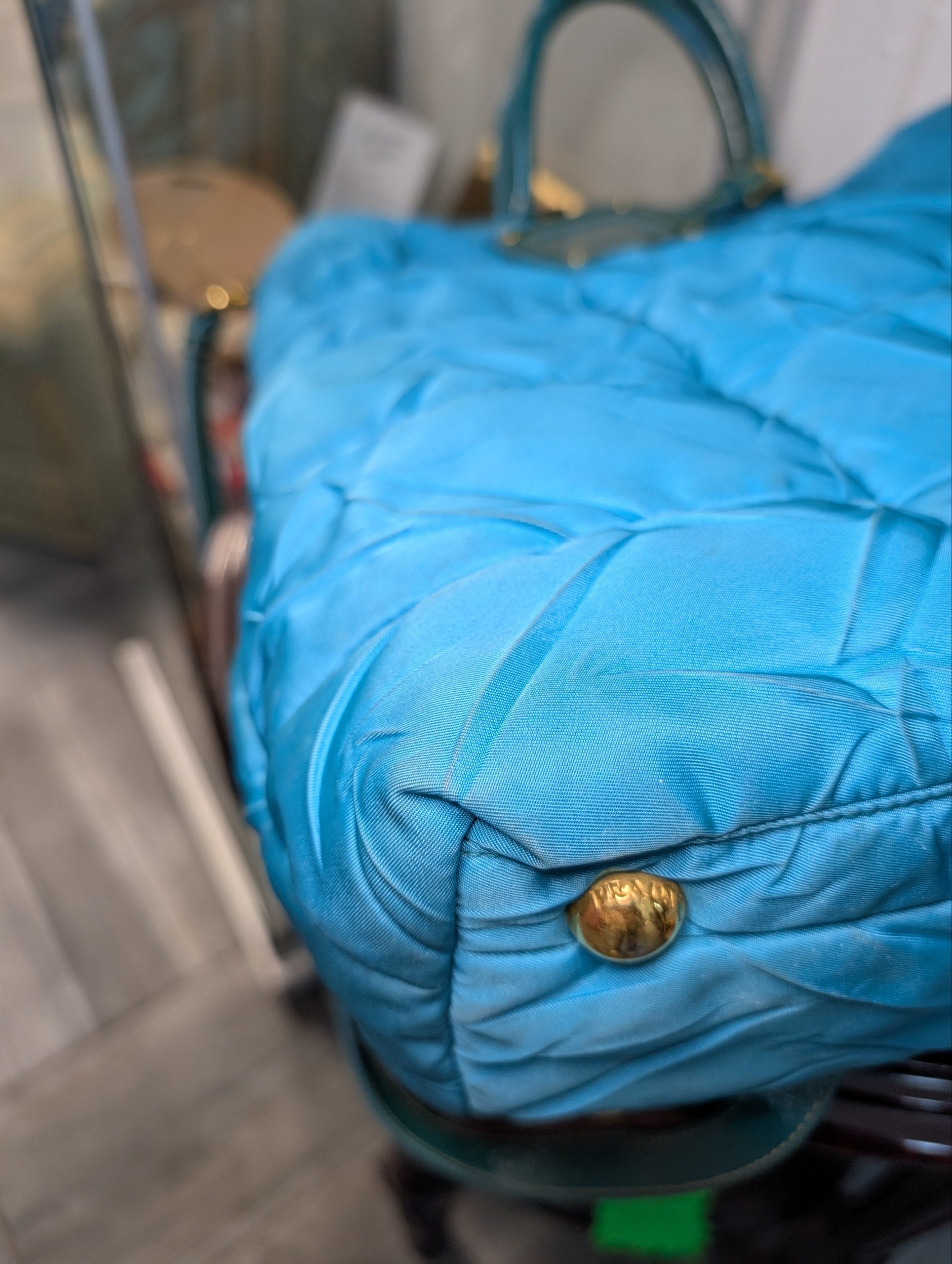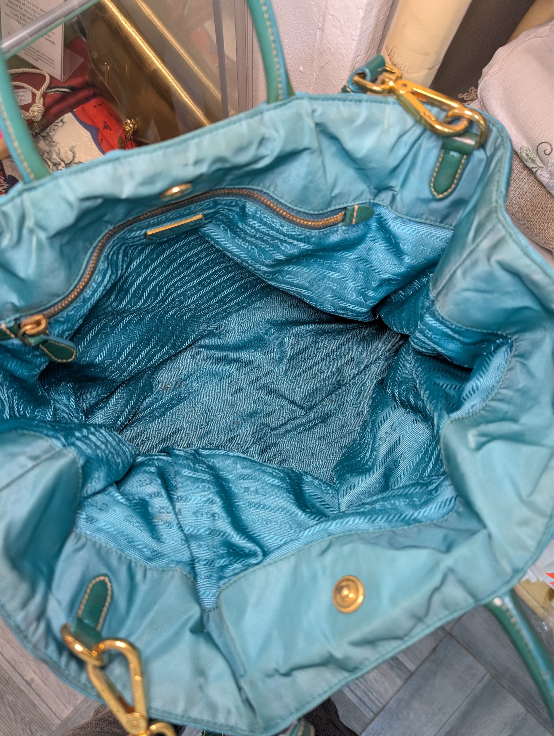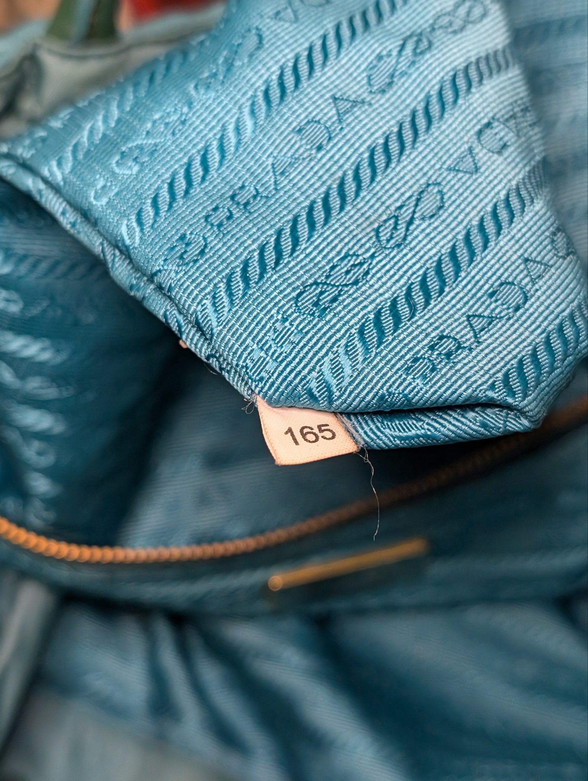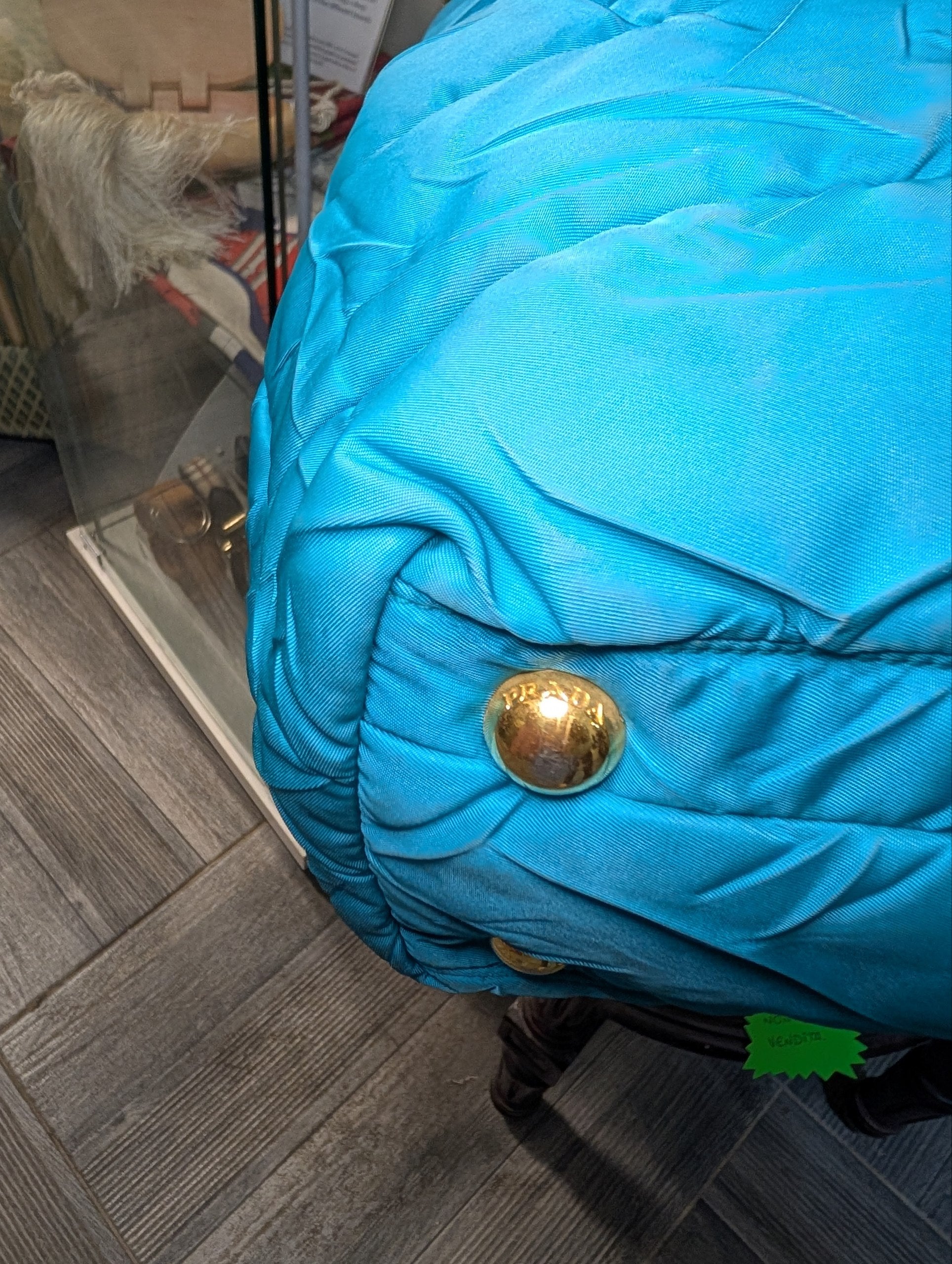 Prada borsa in nylon, effetto stropicciato, colore verde acqua. Completa di tracolla regolabile, doppi manici, tag removibile.