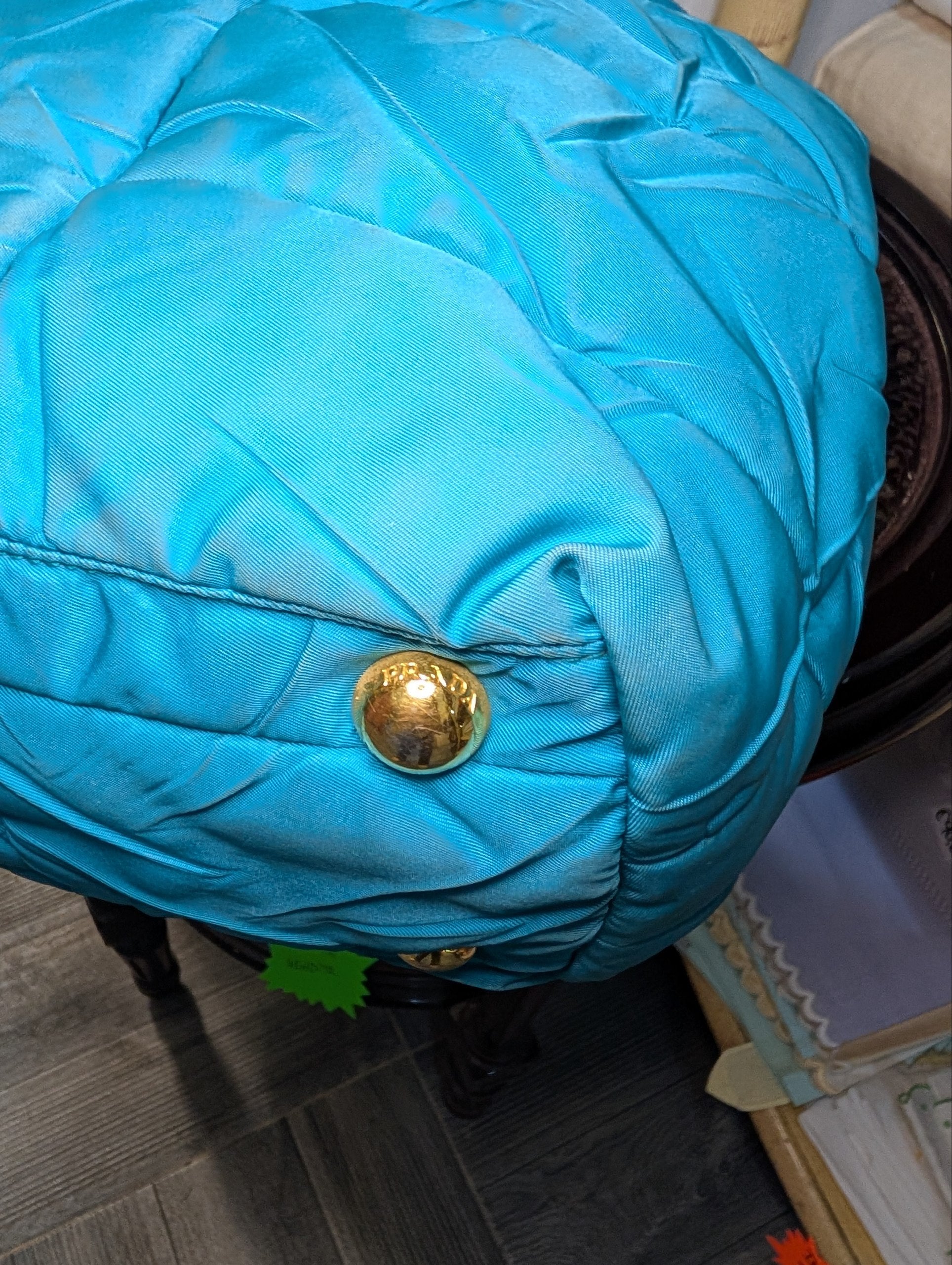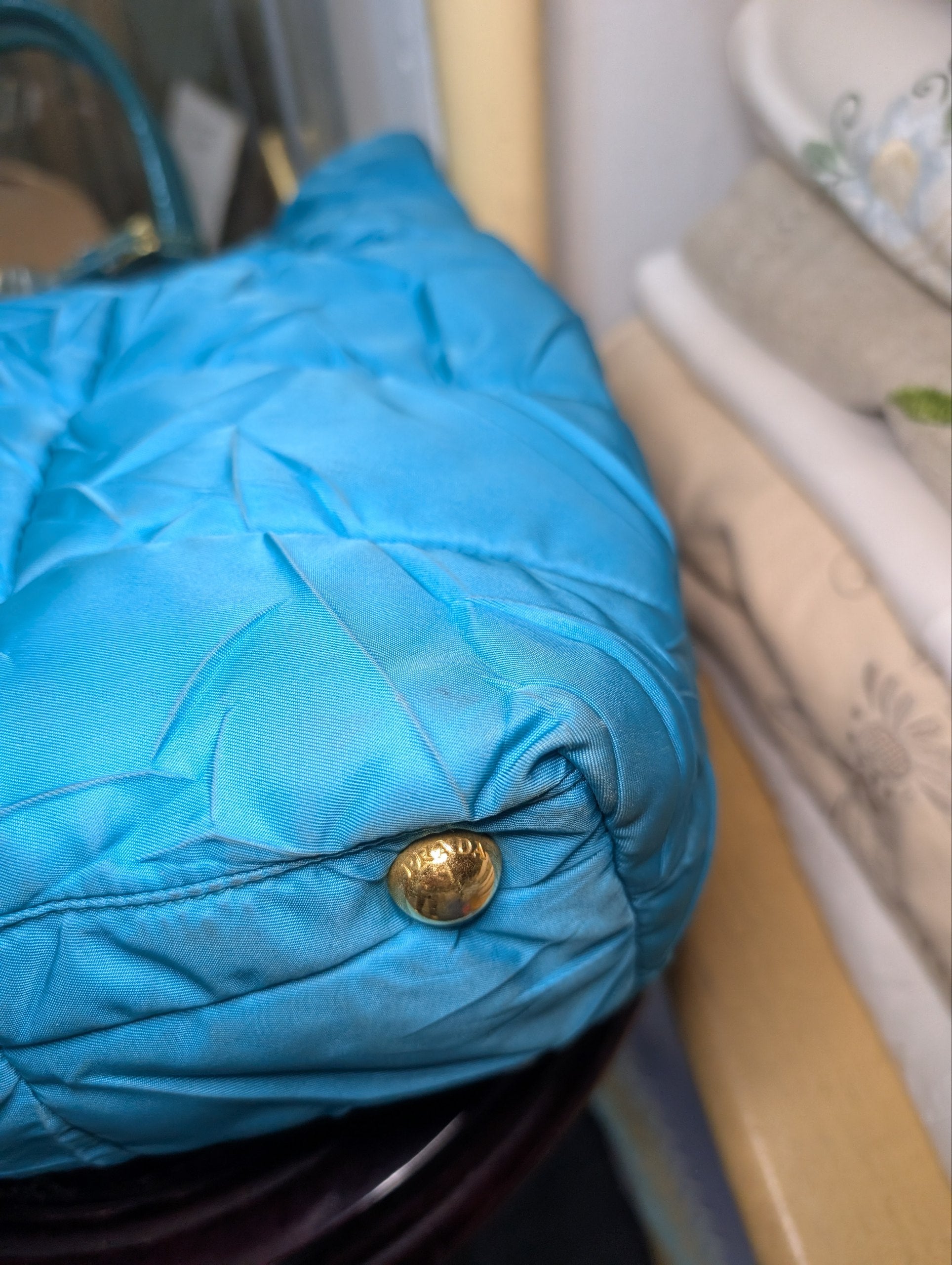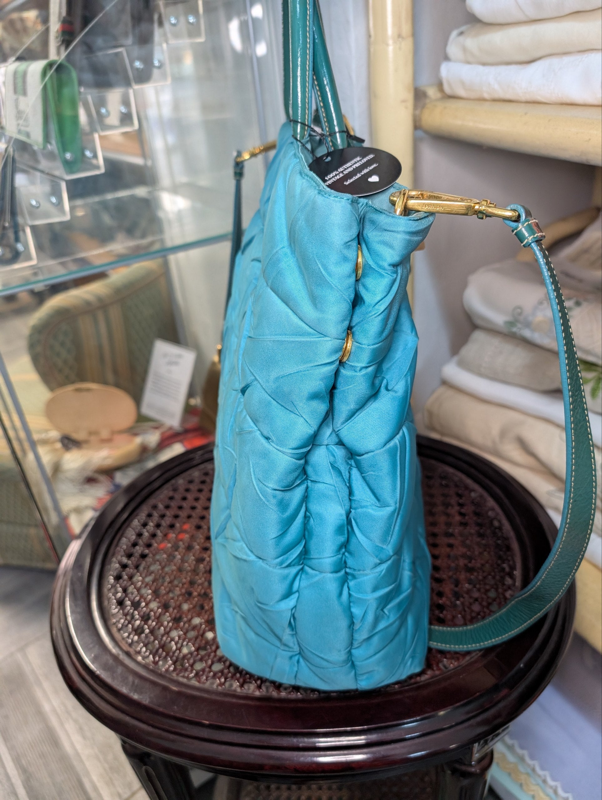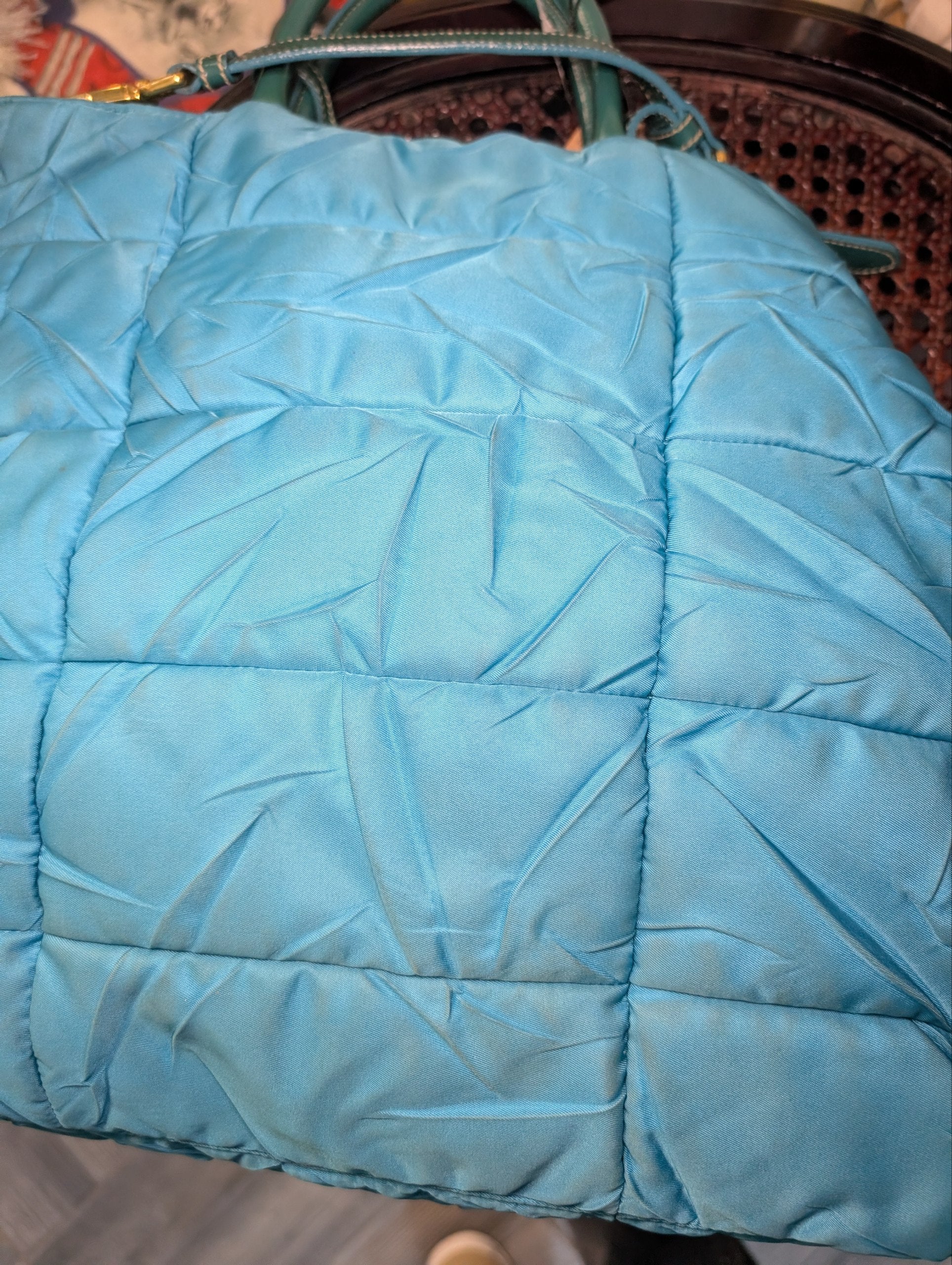Prada borsa in nylon, effetto stropicciato, colore verde acqua. Completa di tracolla regolabile, doppi manici, tag removibile.