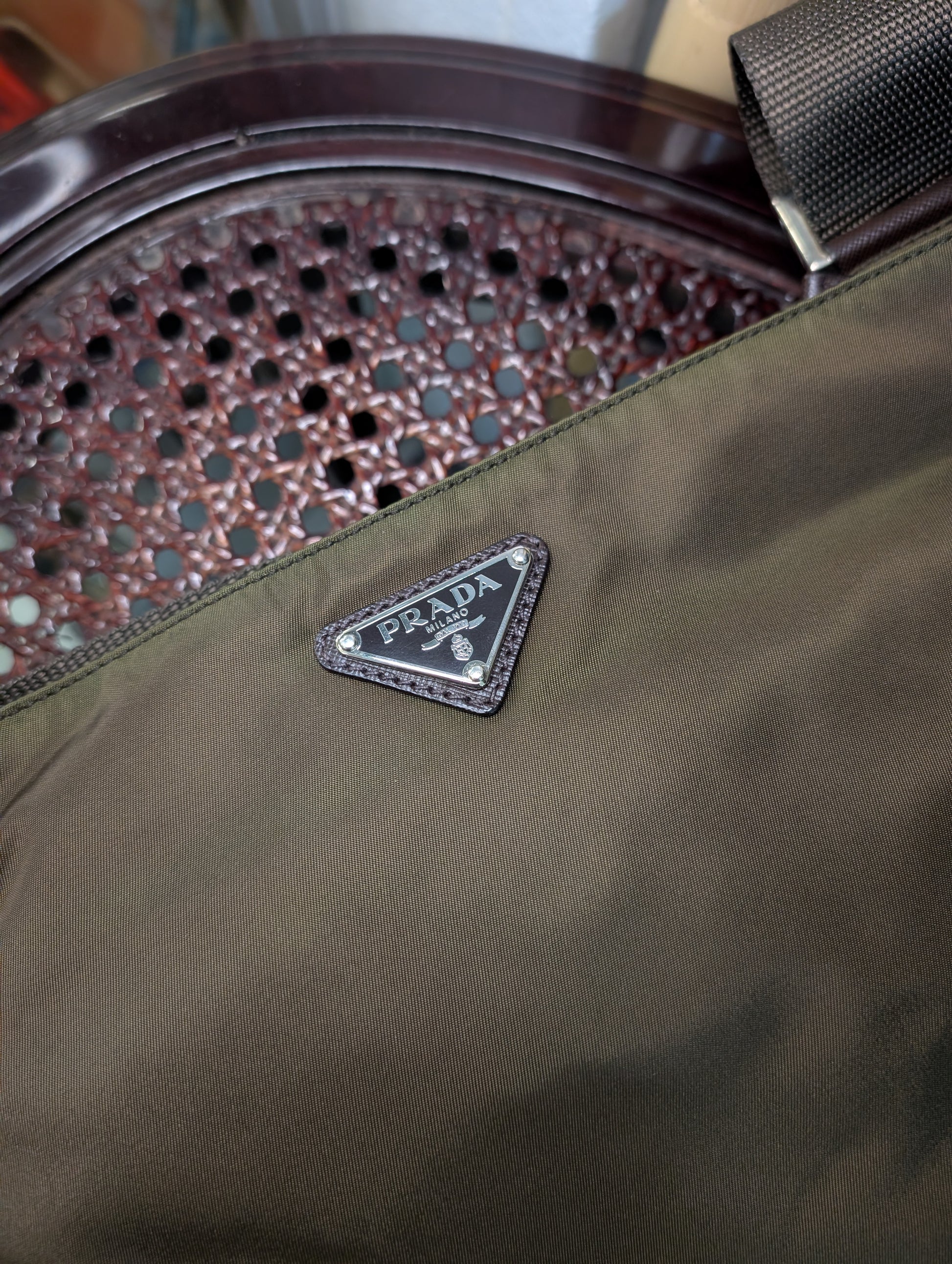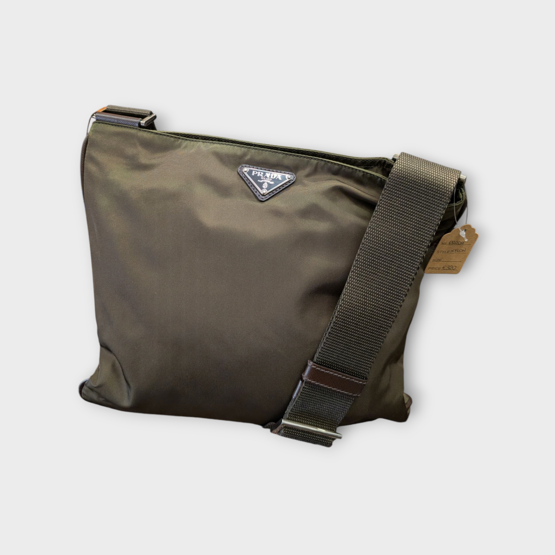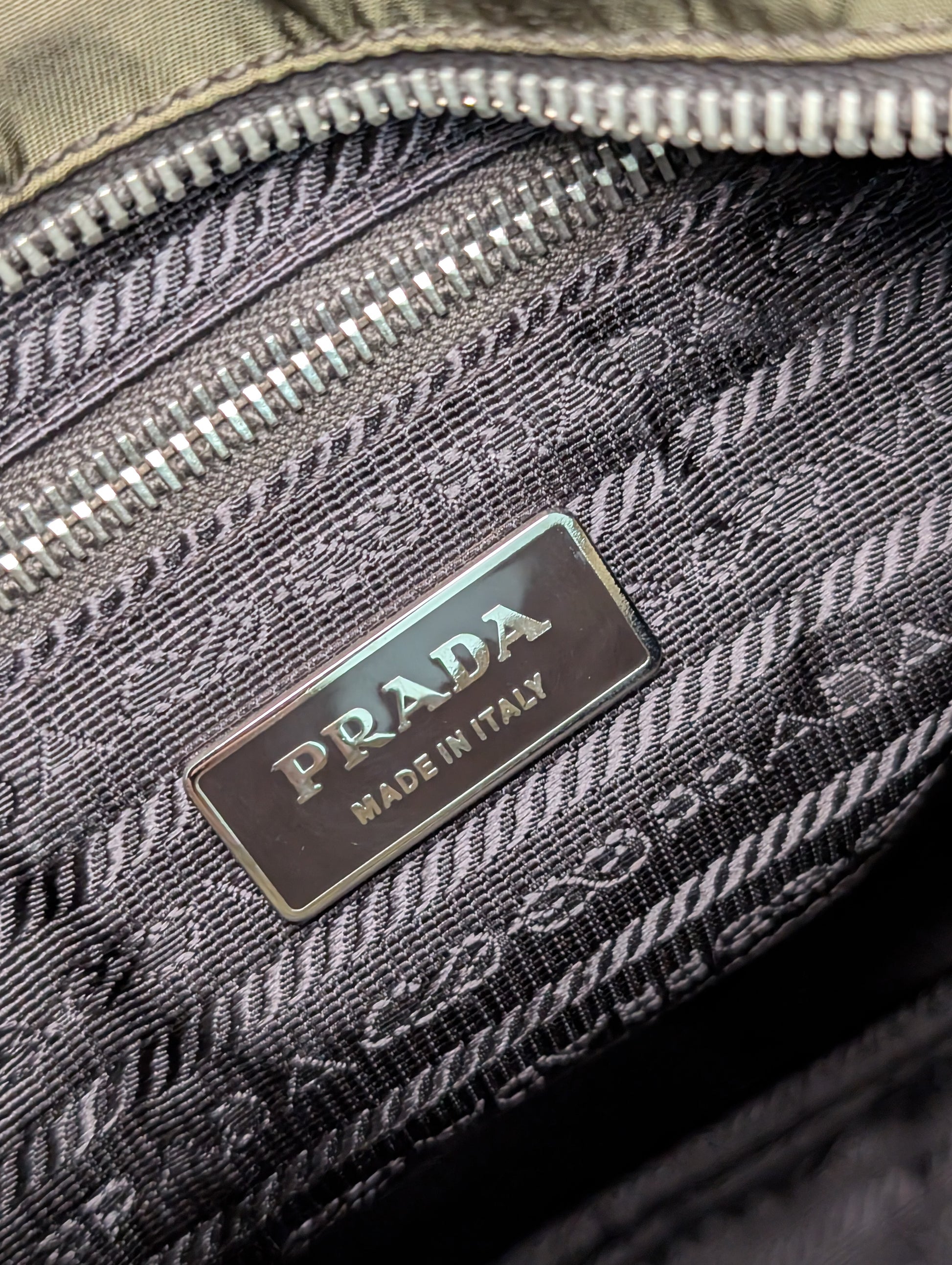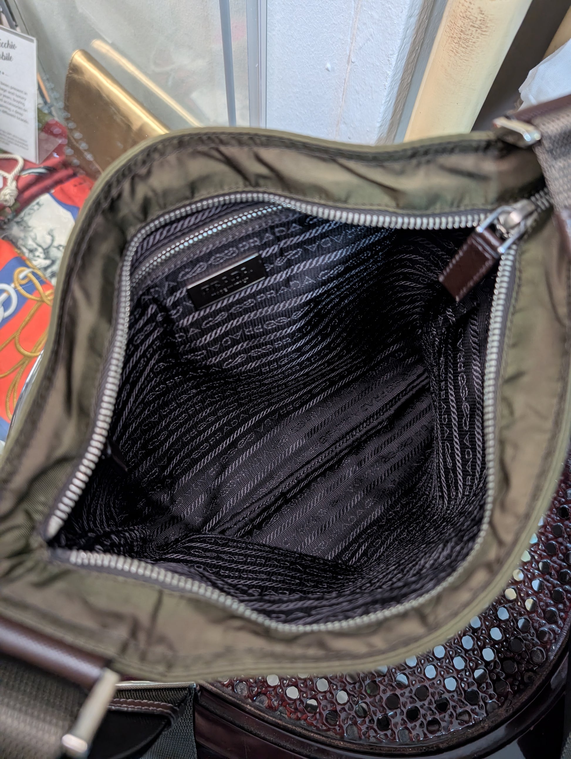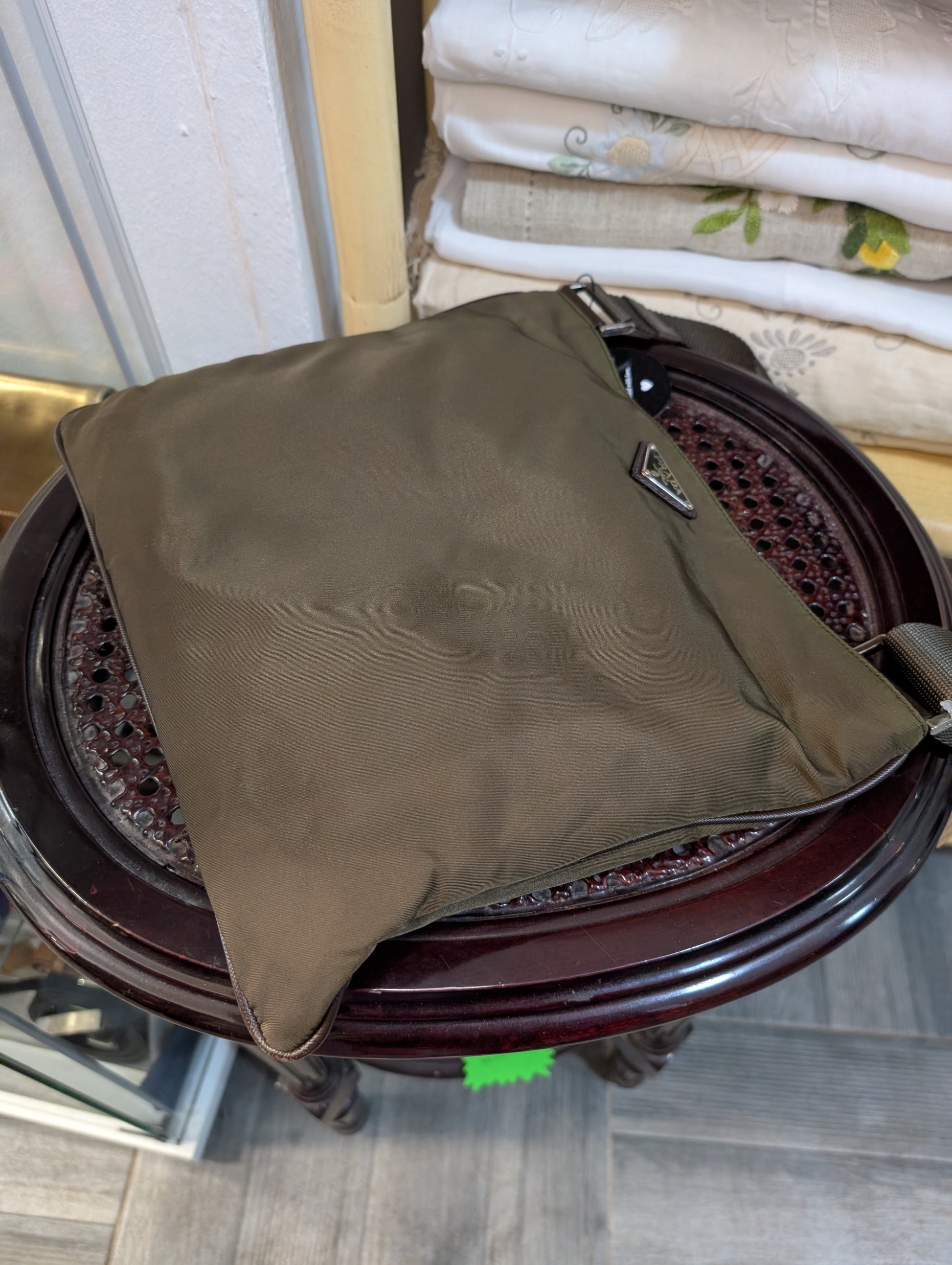 Tracolla di nylon verde cangiante vintage di Prada, unisex, leggera e comoda. Chiusura con cerniera, ottime condizioni generali, qualche segnetto d'uso poco visibile.