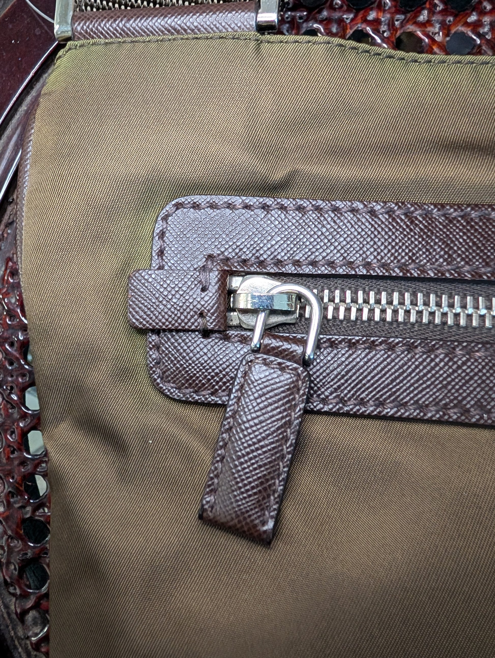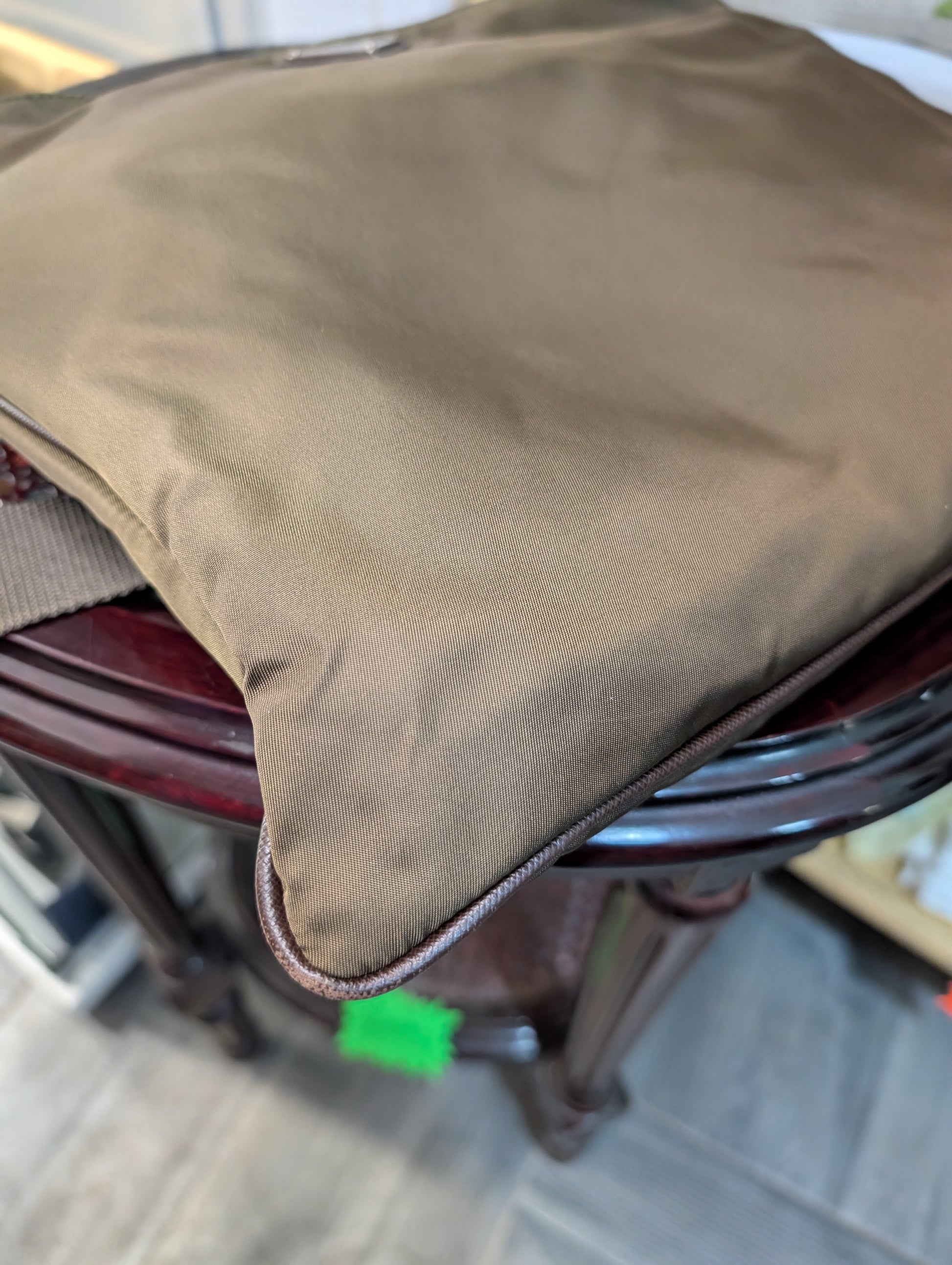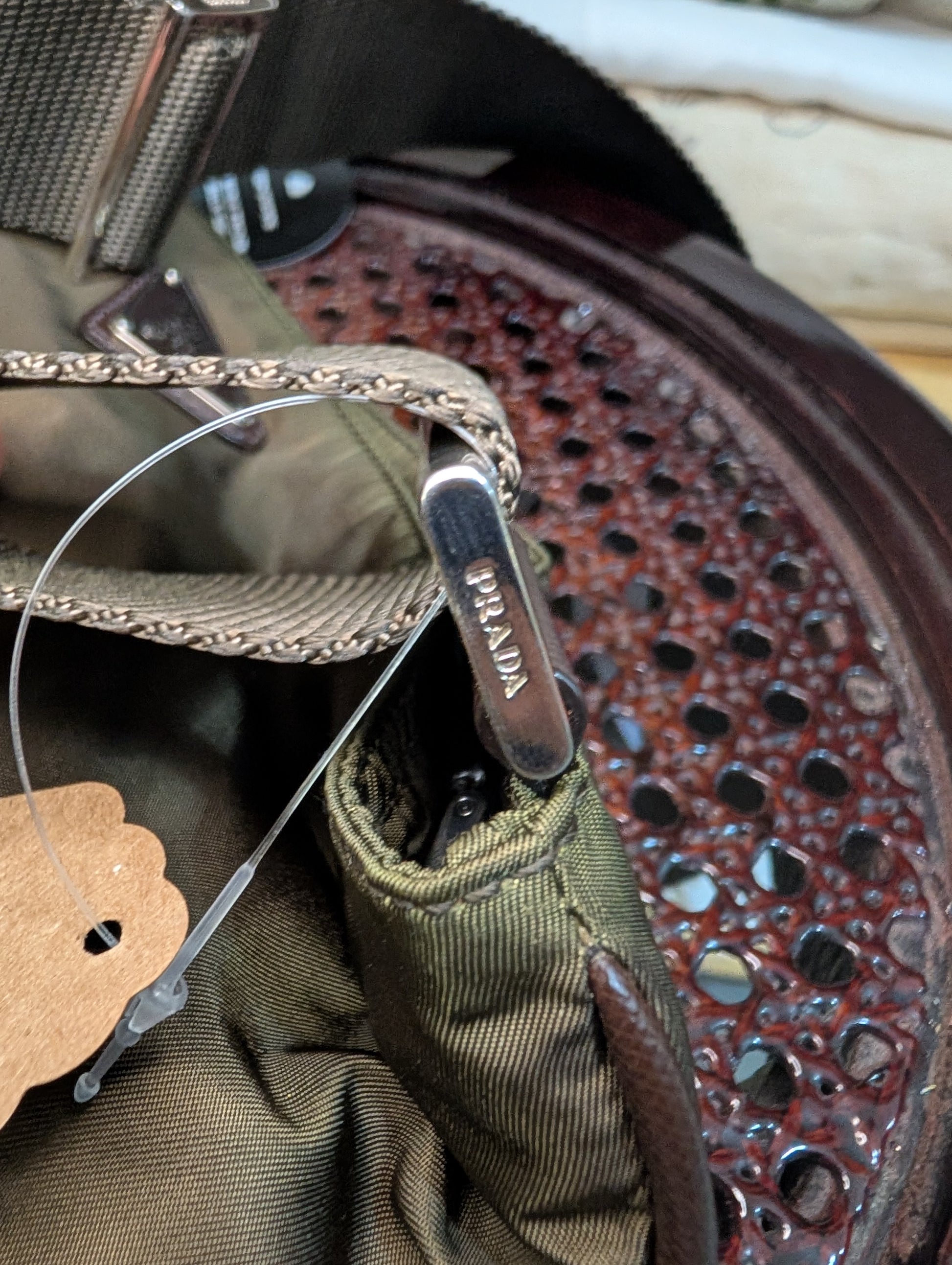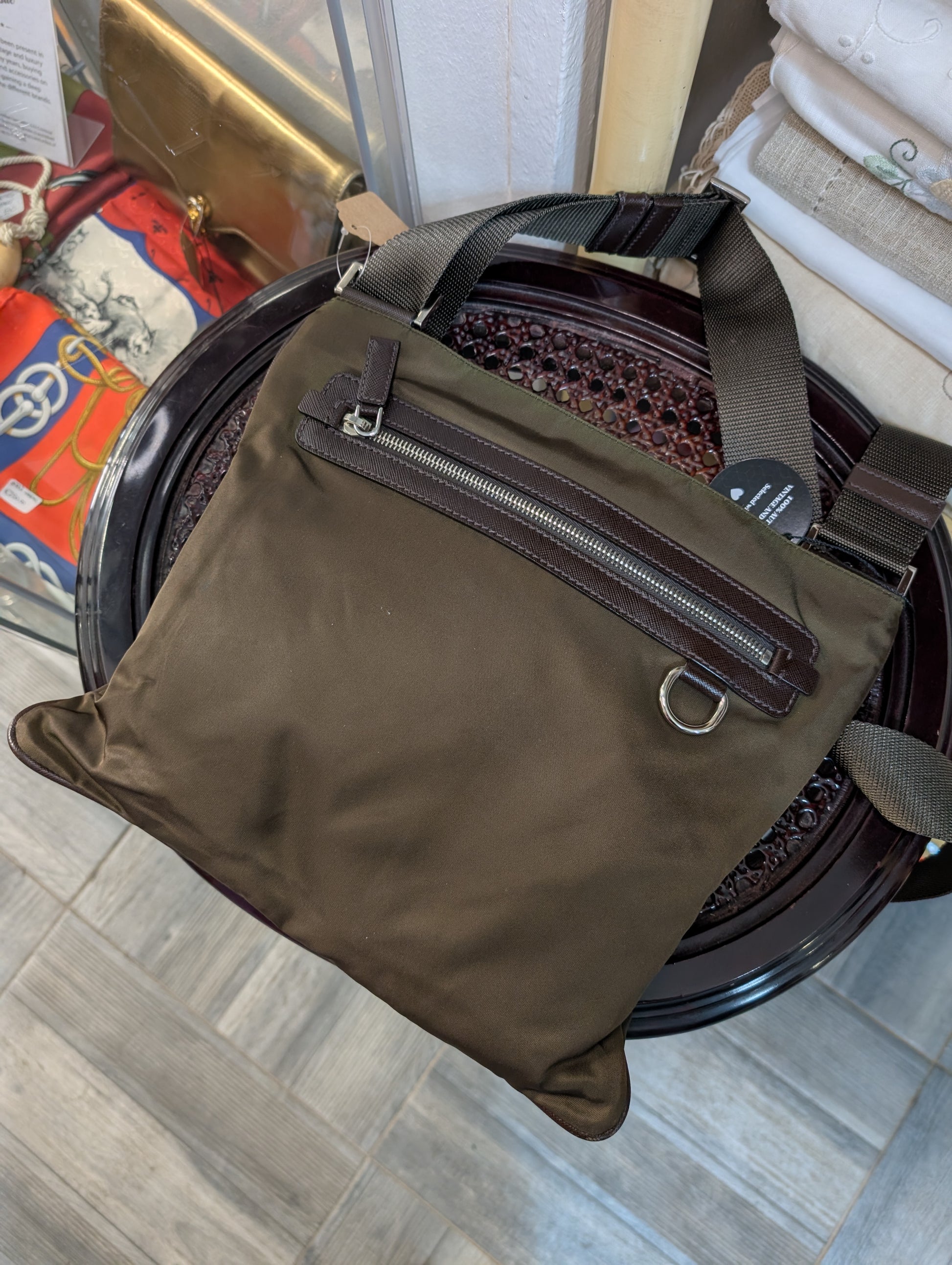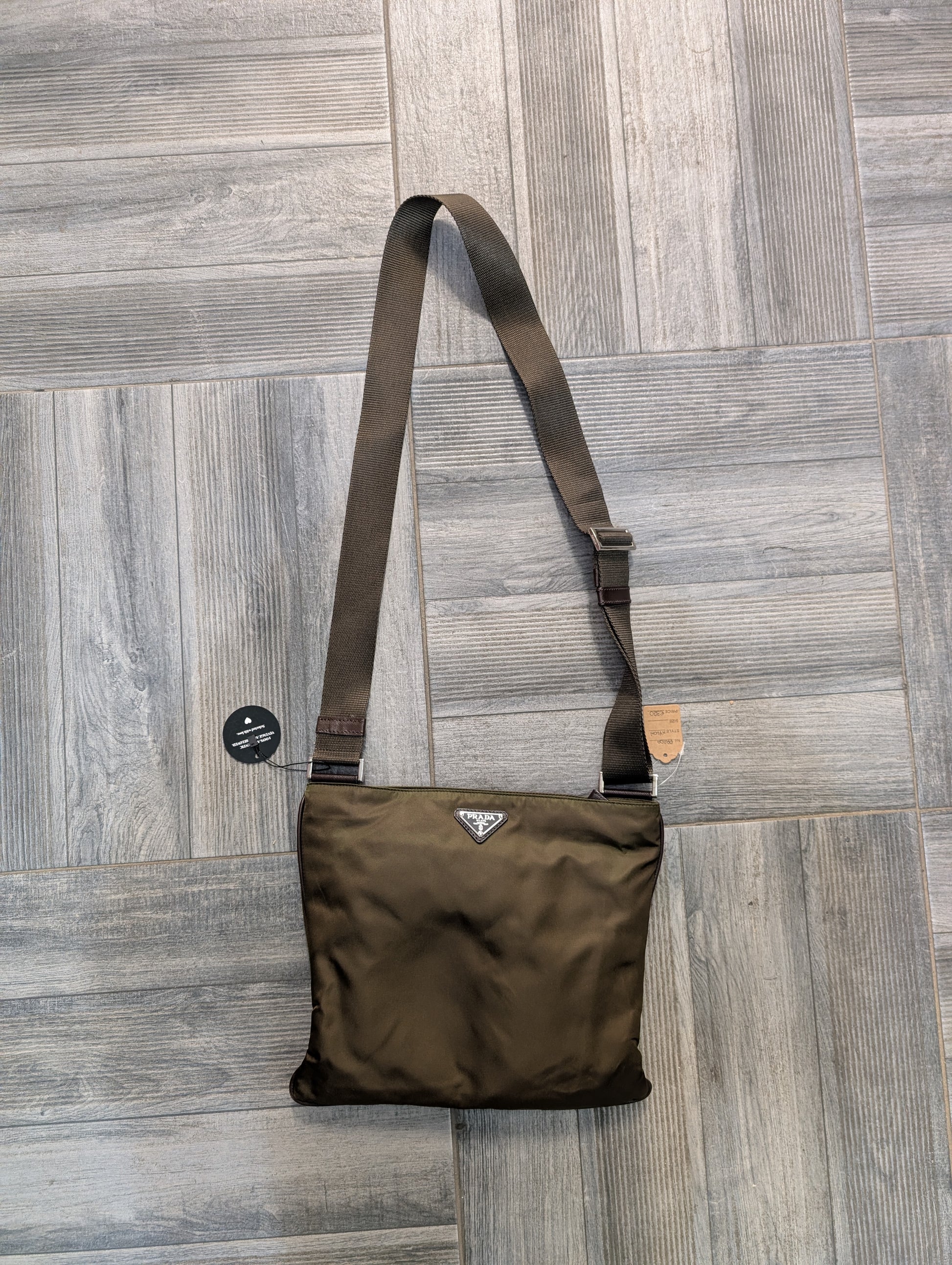 Tracolla di nylon verde cangiante vintage di Prada, unisex, leggera e comoda. Chiusura con cerniera, ottime condizioni generali, qualche segnetto d'uso poco visibile.