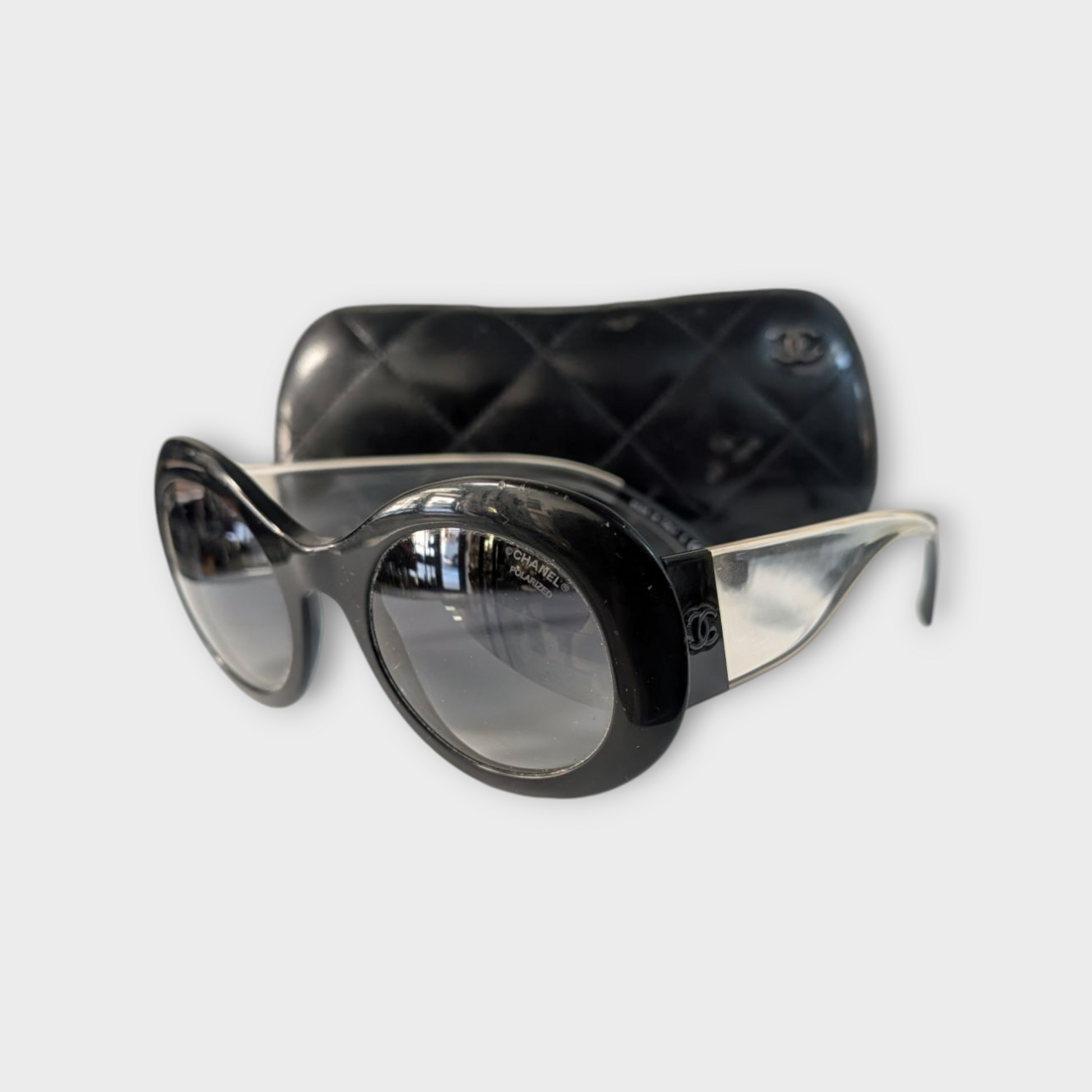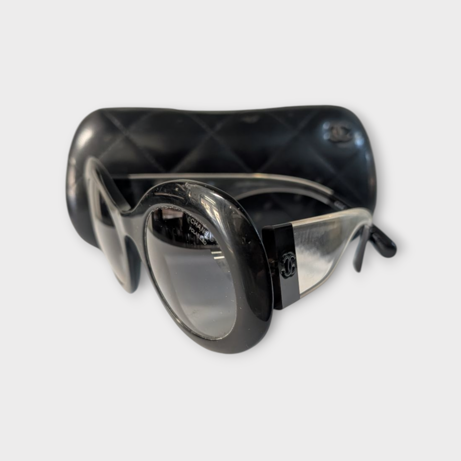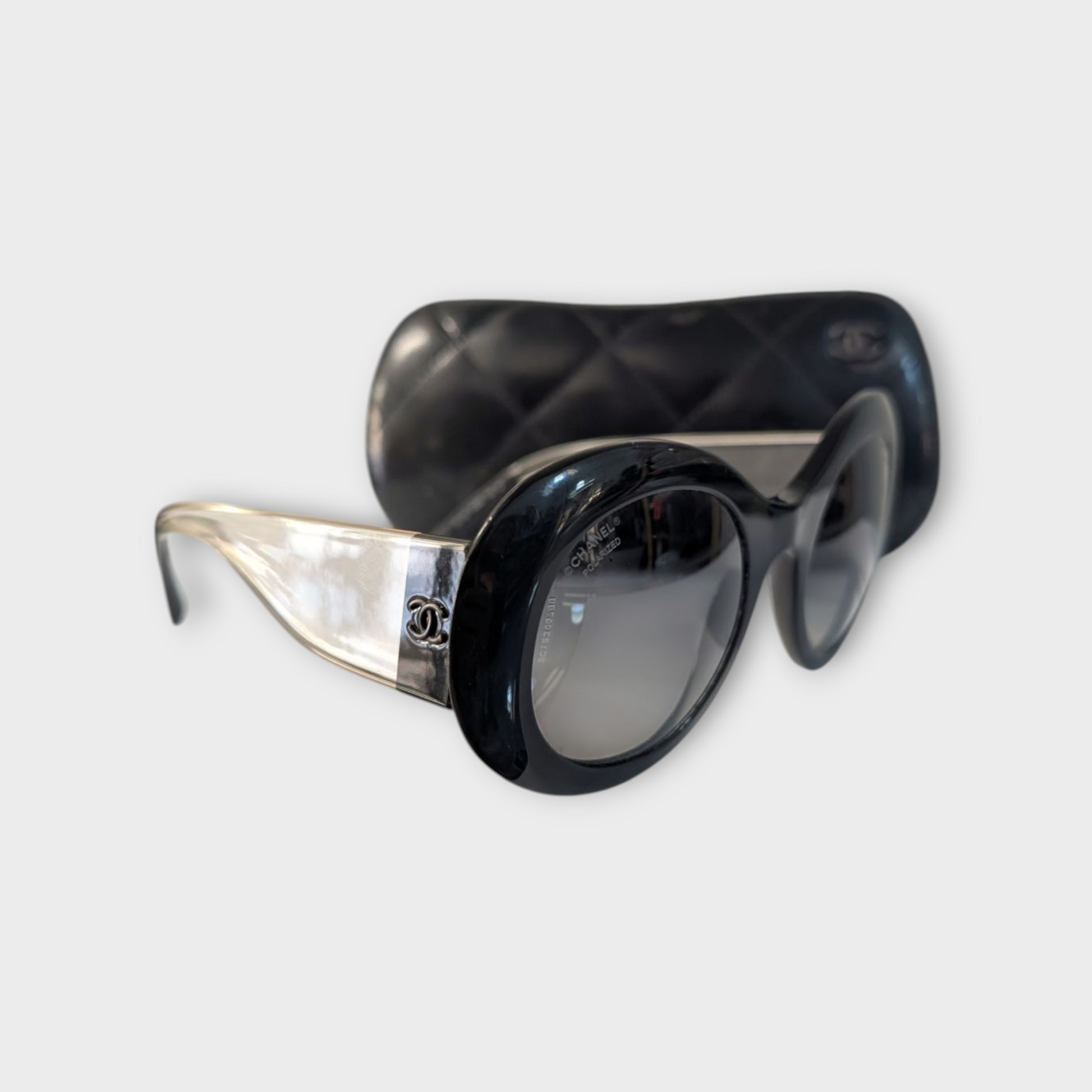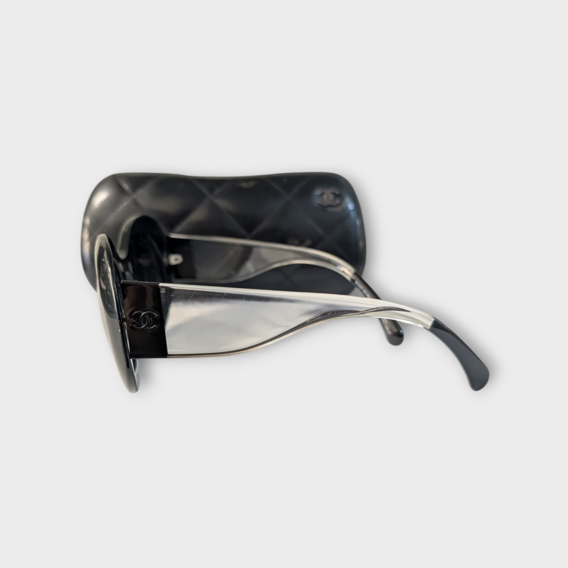 Occhiali da sole vintage di Chanel, completi di custodia con qualche segno esterno, bicolore nero e trasparente.