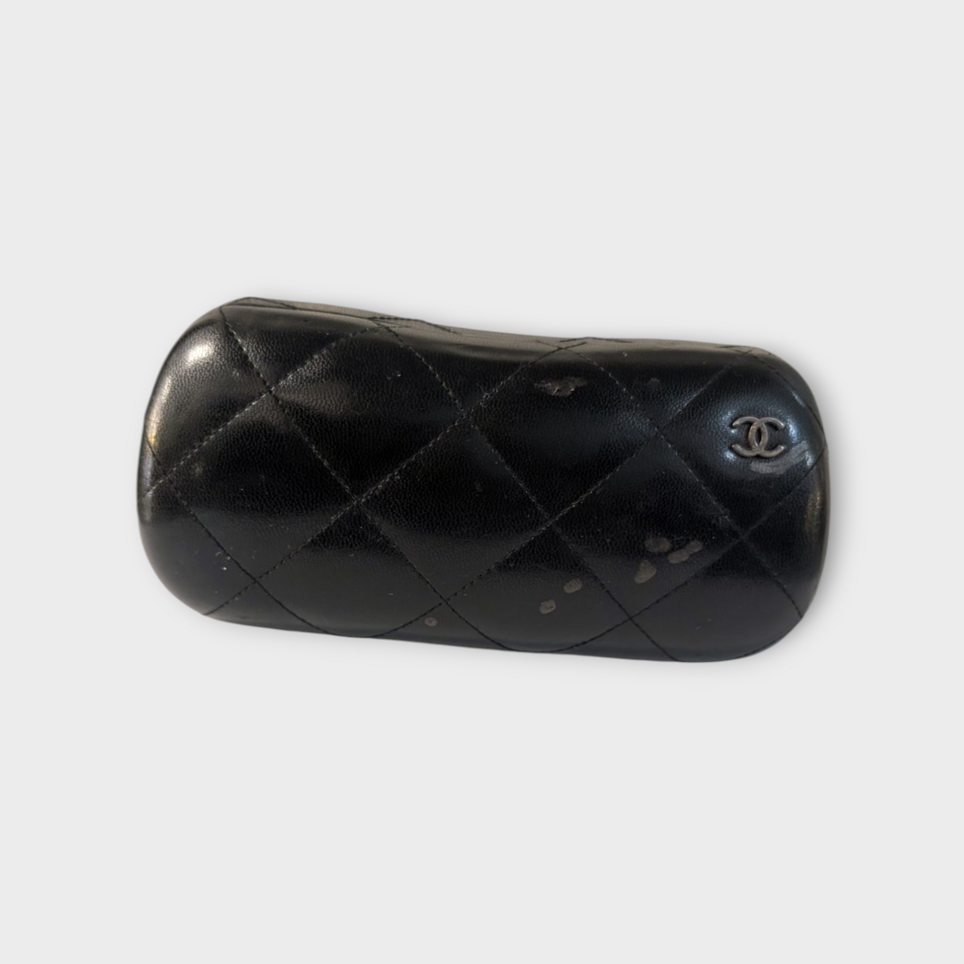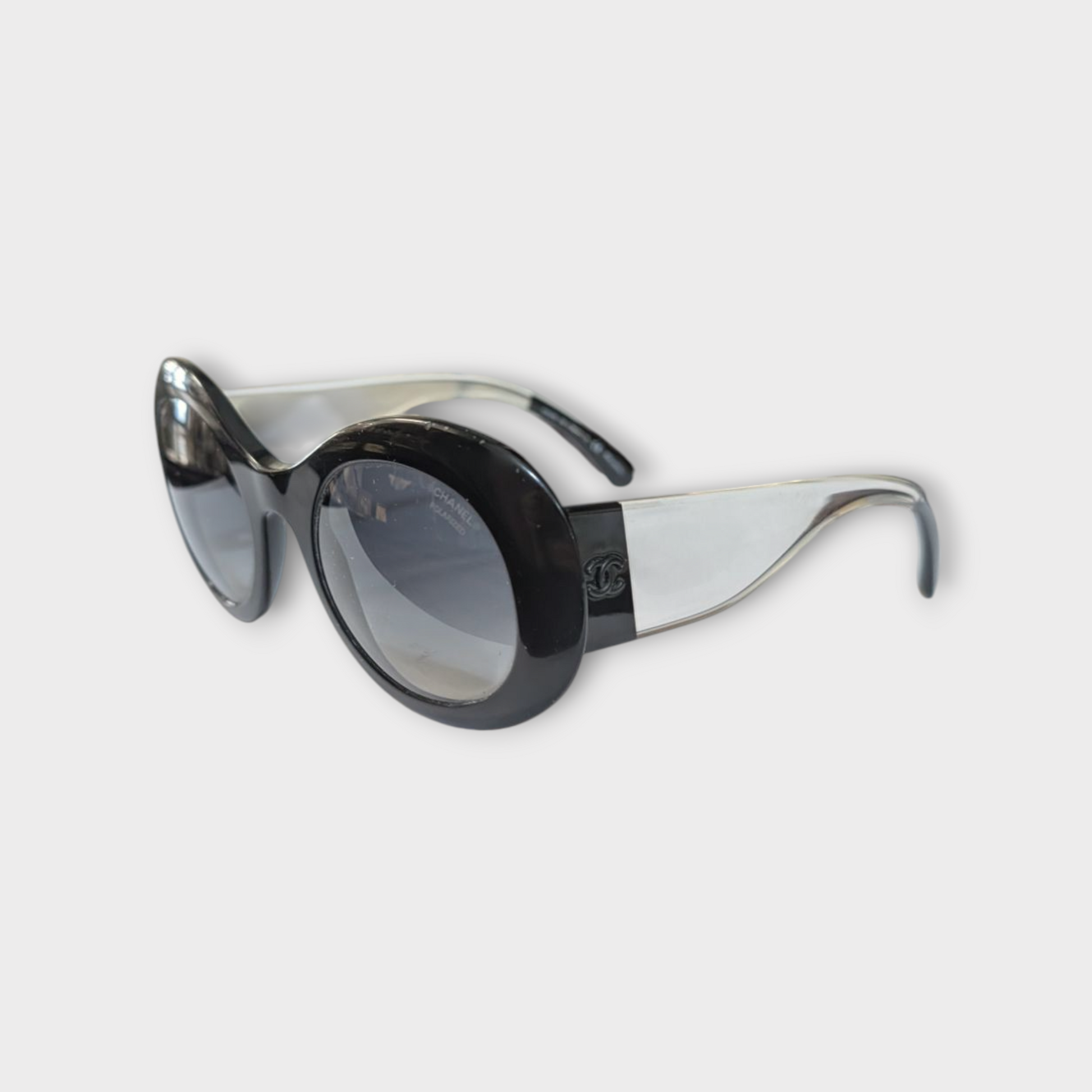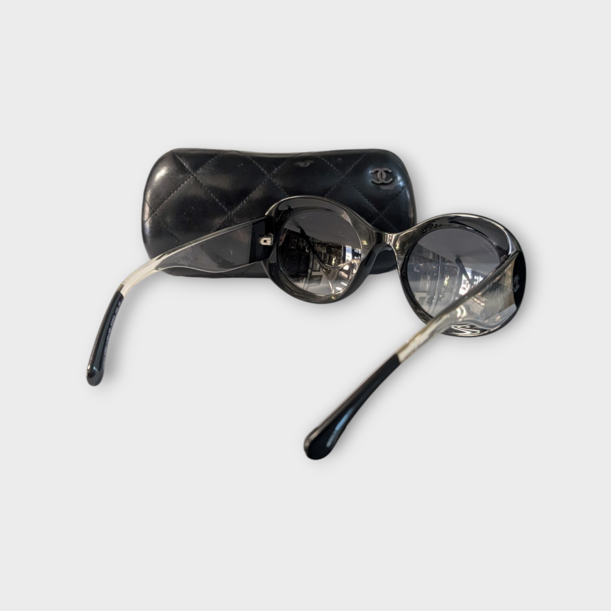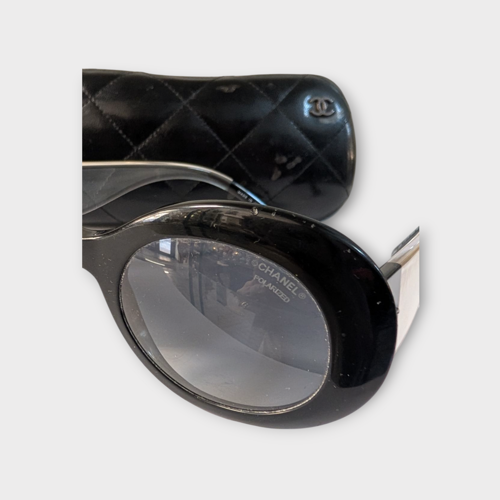 Occhiali da sole vintage di Chanel, completi di custodia con qualche segno esterno, bicolore nero e trasparente.