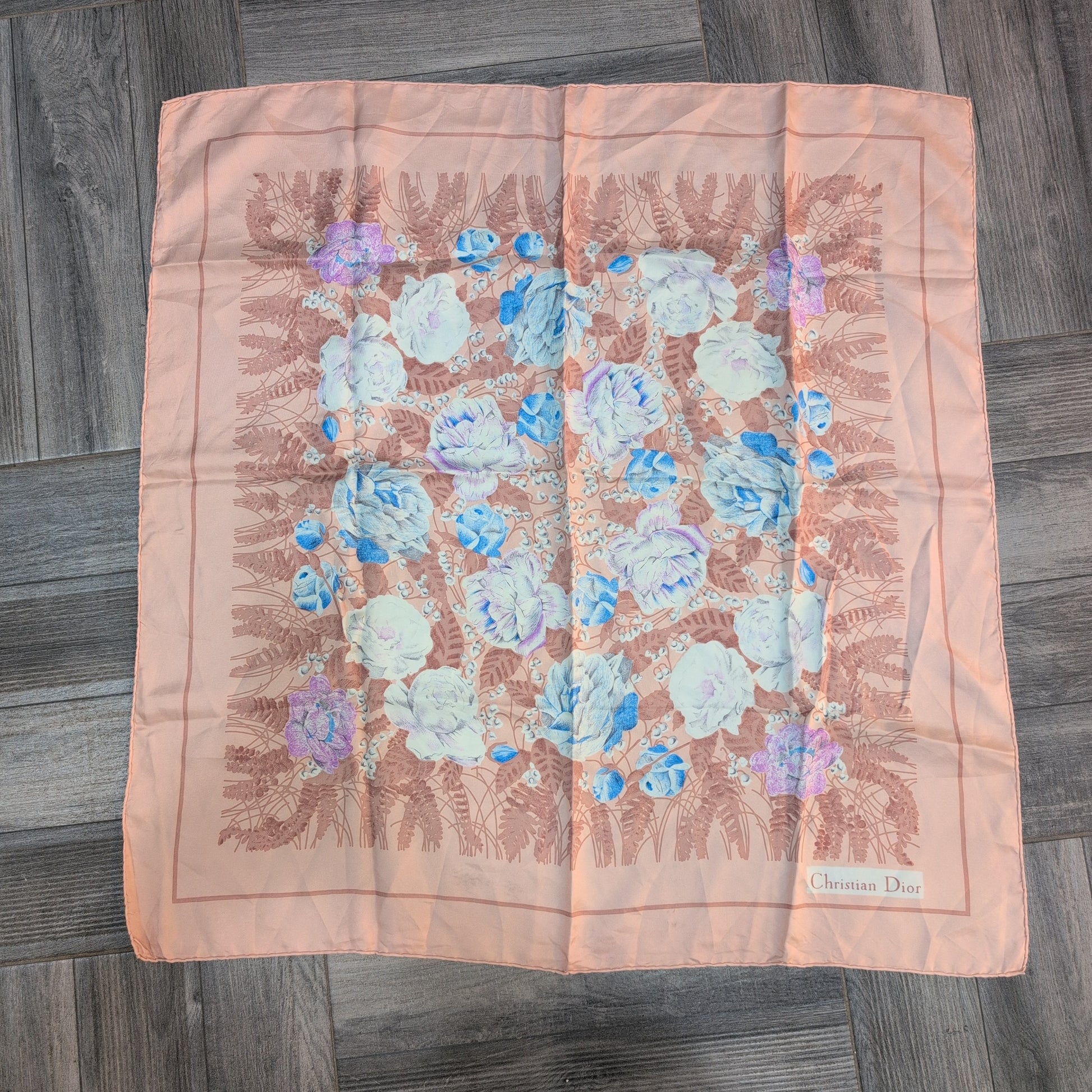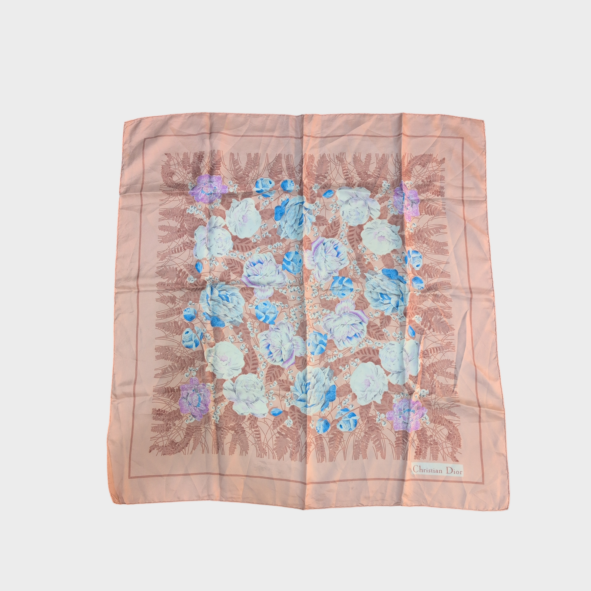 Foulard vintage di Christian Dior in seta, etichetta di composizione mancante. Buone condizioni generali, qualche segno presente.