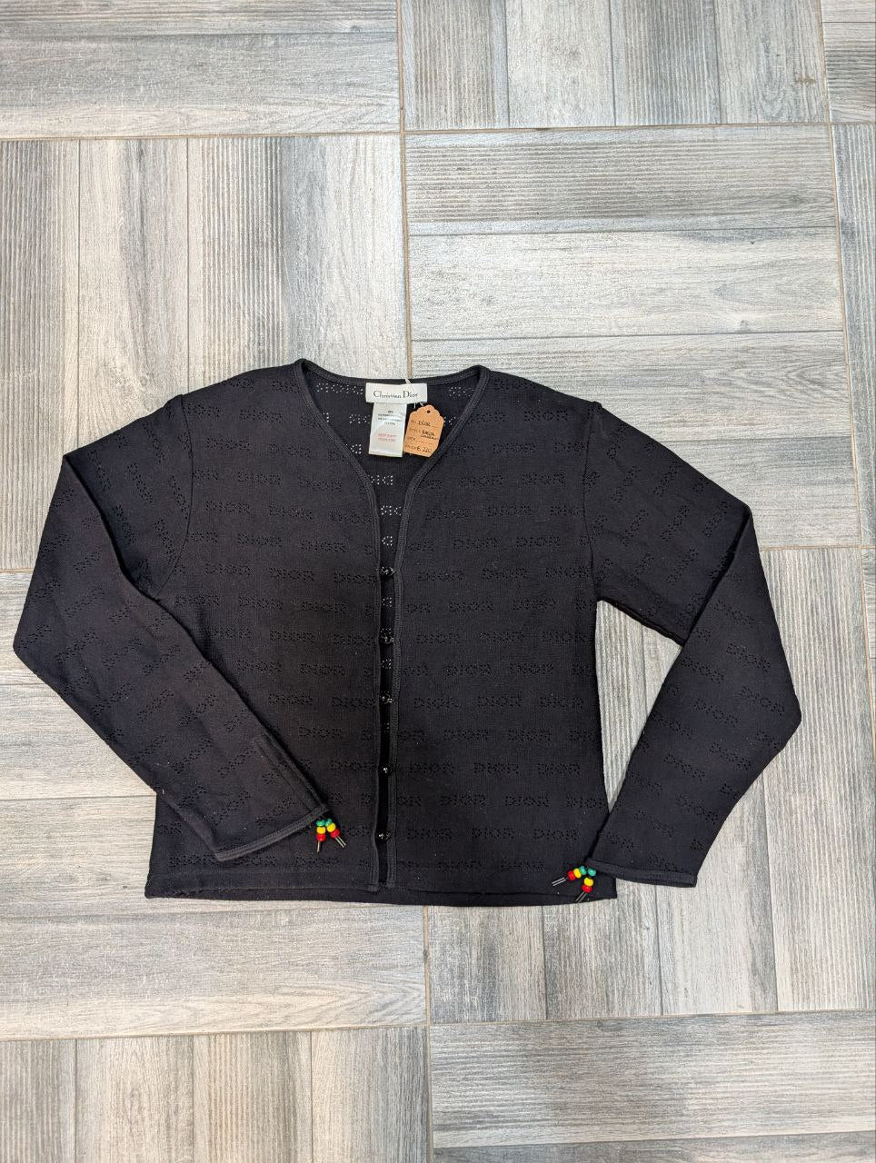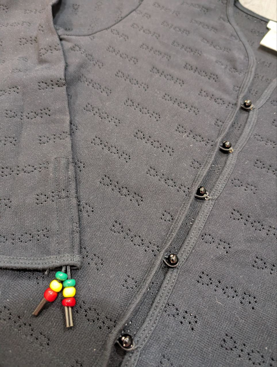 Chiusura con bottoncini, dettagli con perline sulle maniche, e logo Dior su tutto il cardigan traforato.