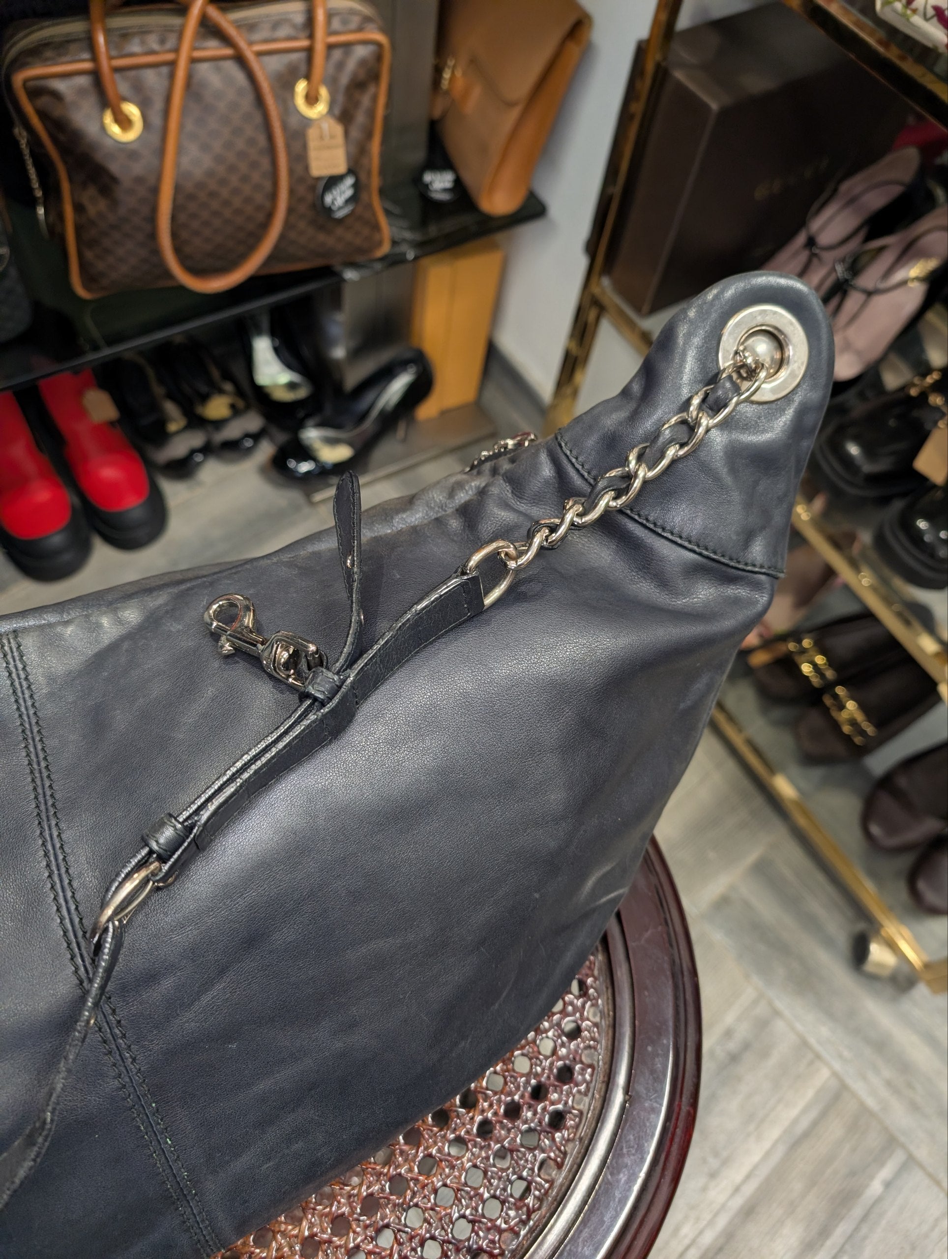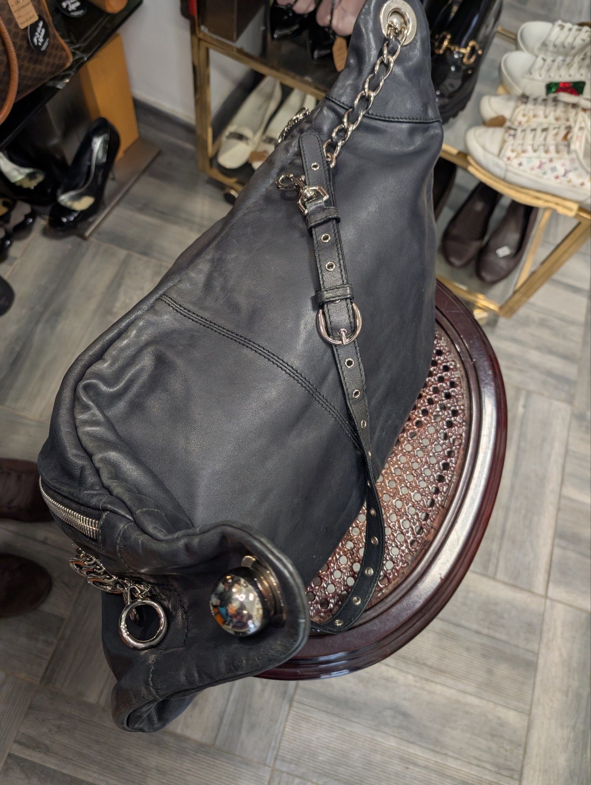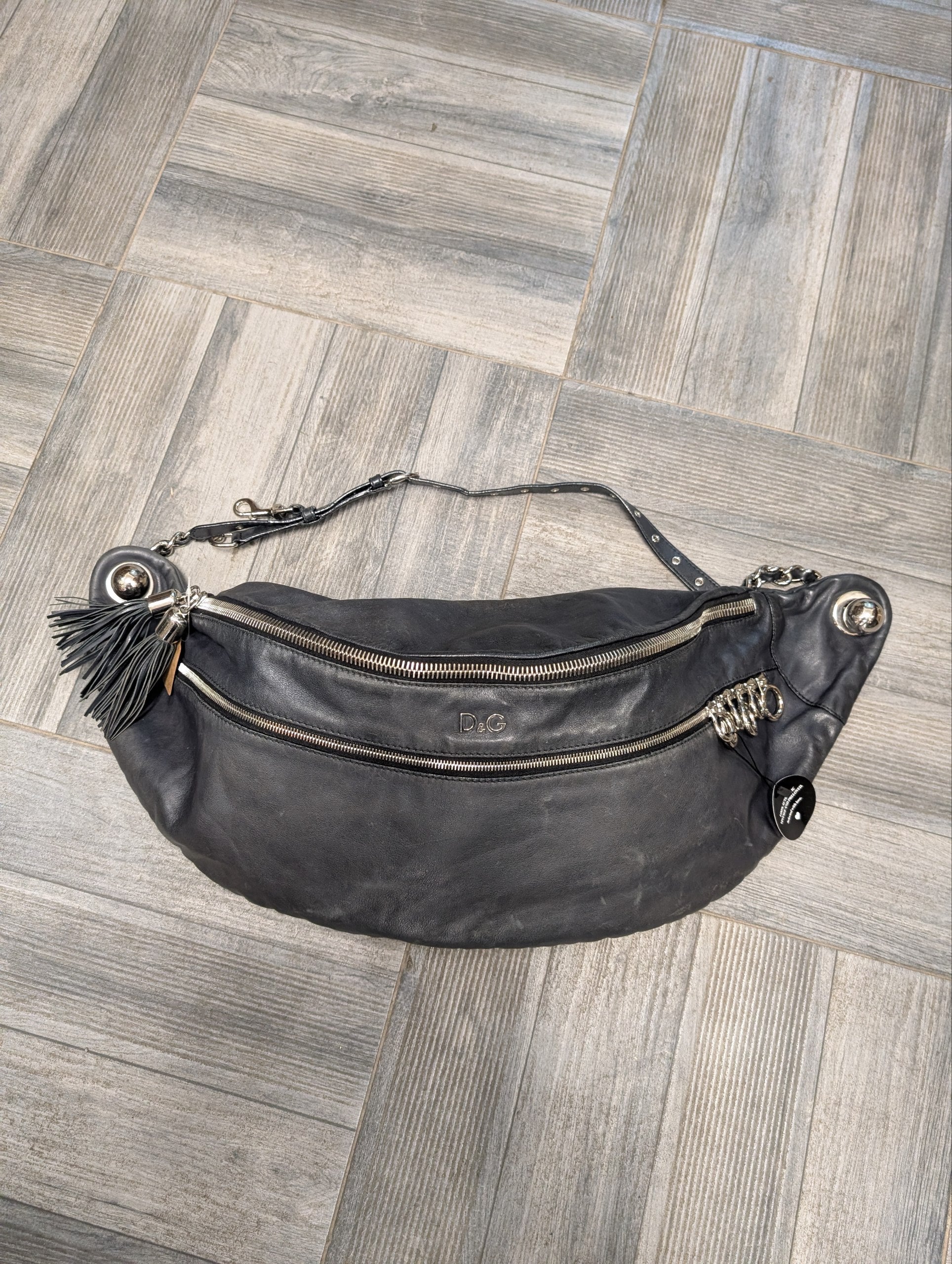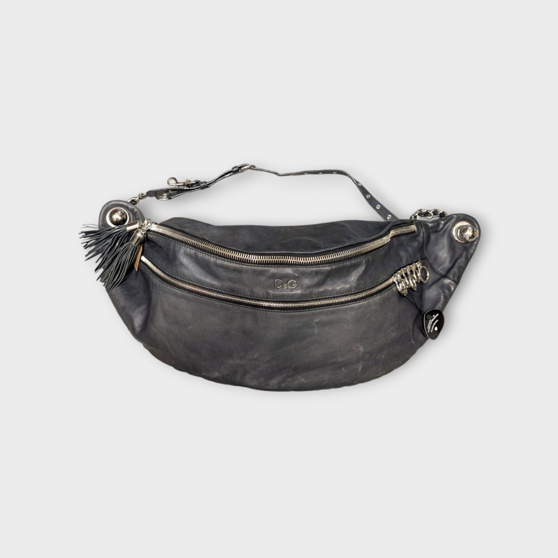 Borsa vintage primi anni 2000 di Dolce & Gabbana, modello Jeri, in pelle liscia nera. Portabile come monospalla, davvero capiente, comoda e d'effetto. Presenta il logo D&G sul fronte della borsa in metalleria argentata, e varie cerniere, principalmente per abbellimento.