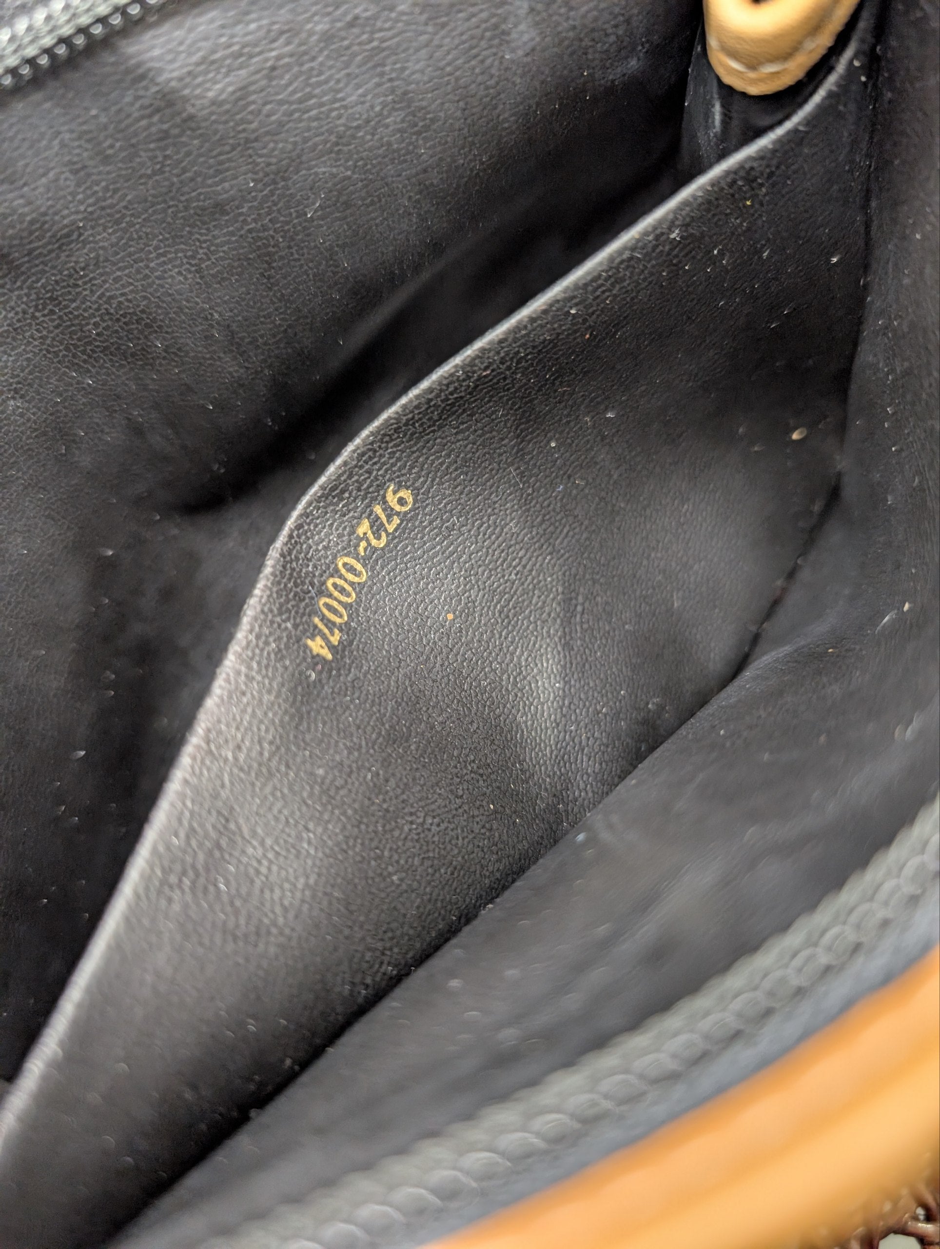 Pelle color miele, tela Pequin. Interno in pelle nera, chiusura con cerniera.