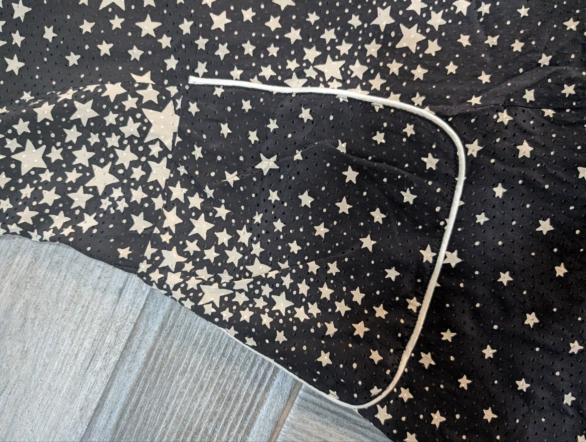 Stupendo, ricco di stelline e con delle graziose tasche sul davanti.