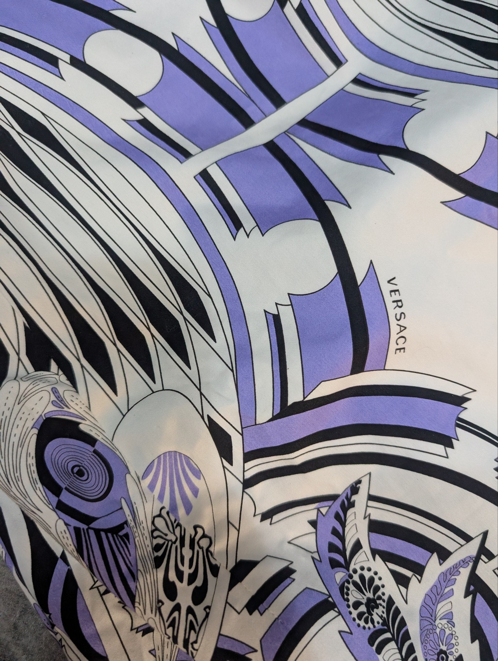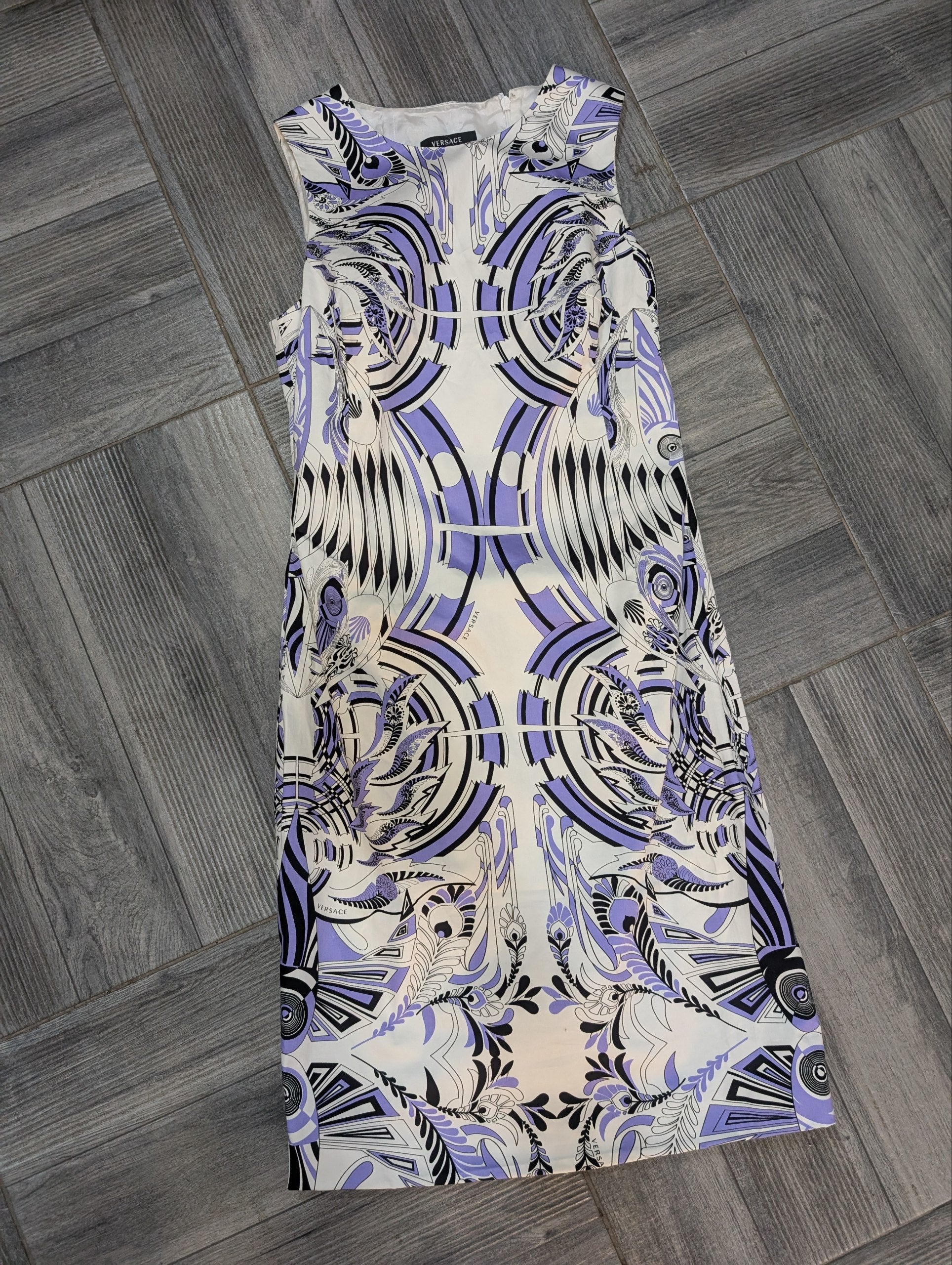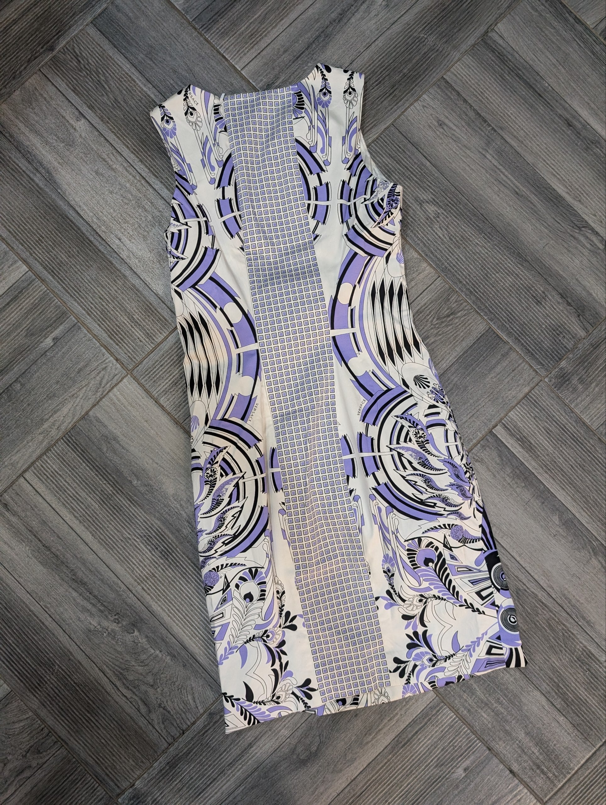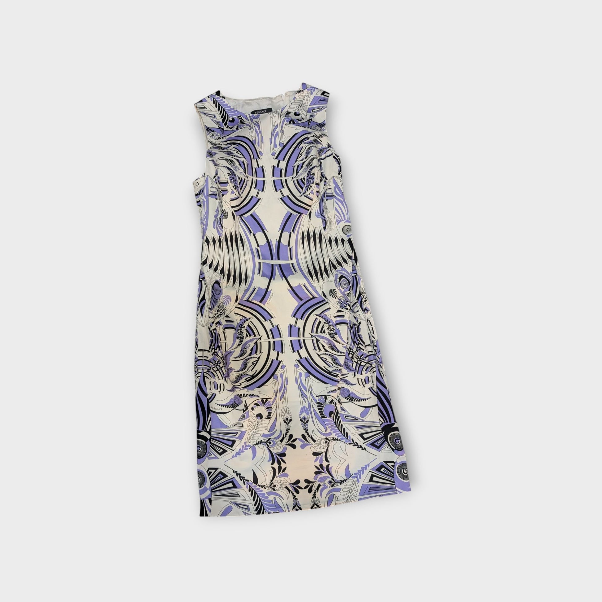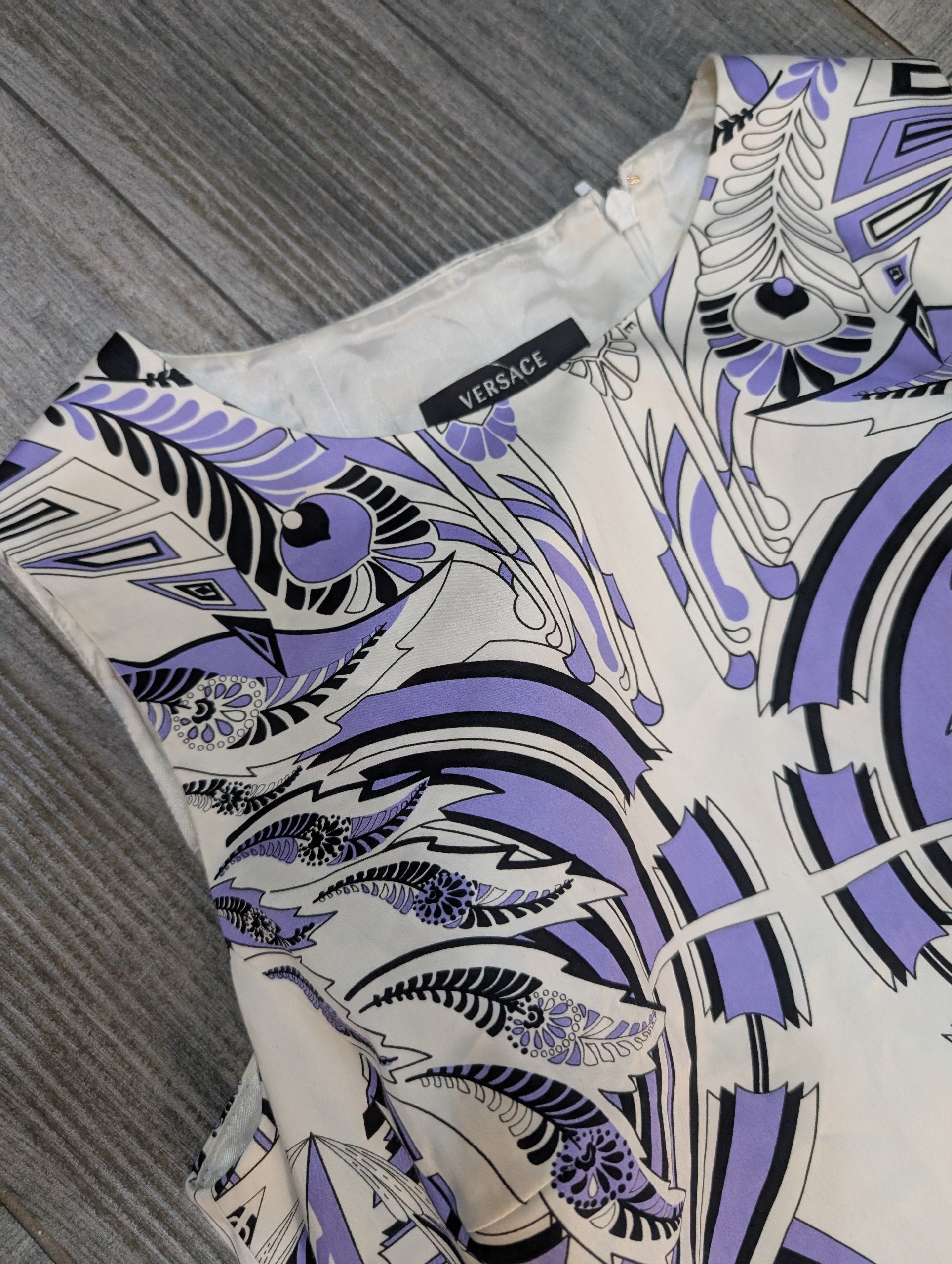 Abitino vintage di Versace, con fantasia astratta sui toni del bianco, lilla e nero, con logo Versace sul disegno.