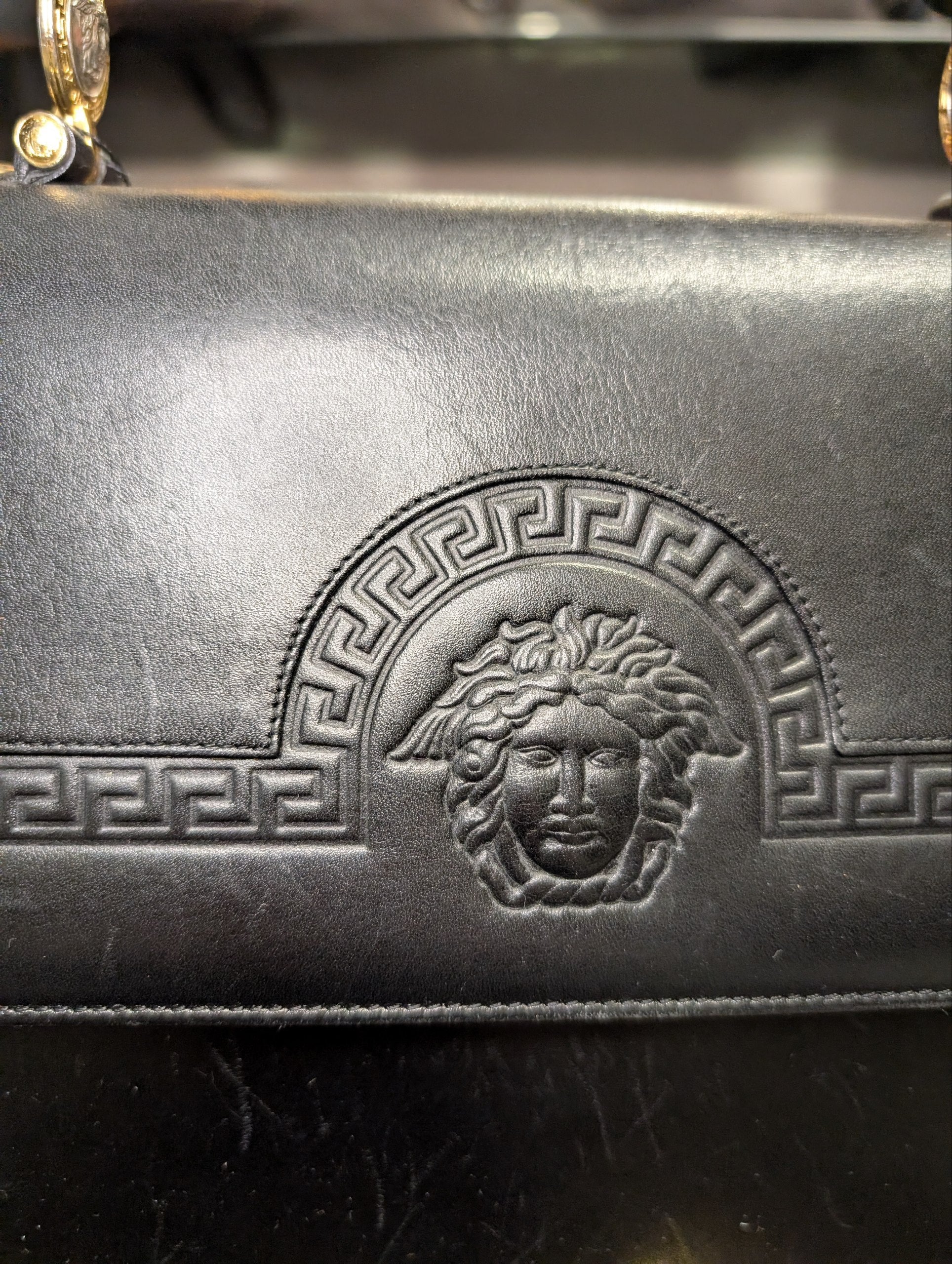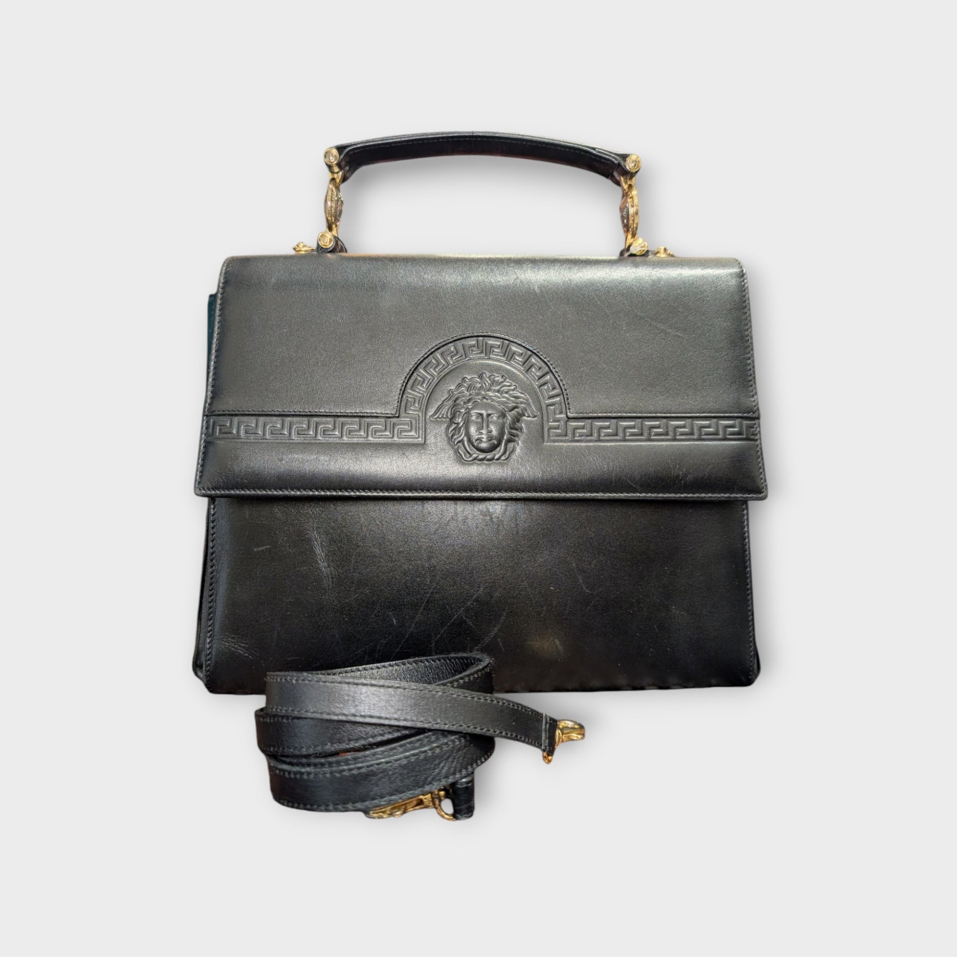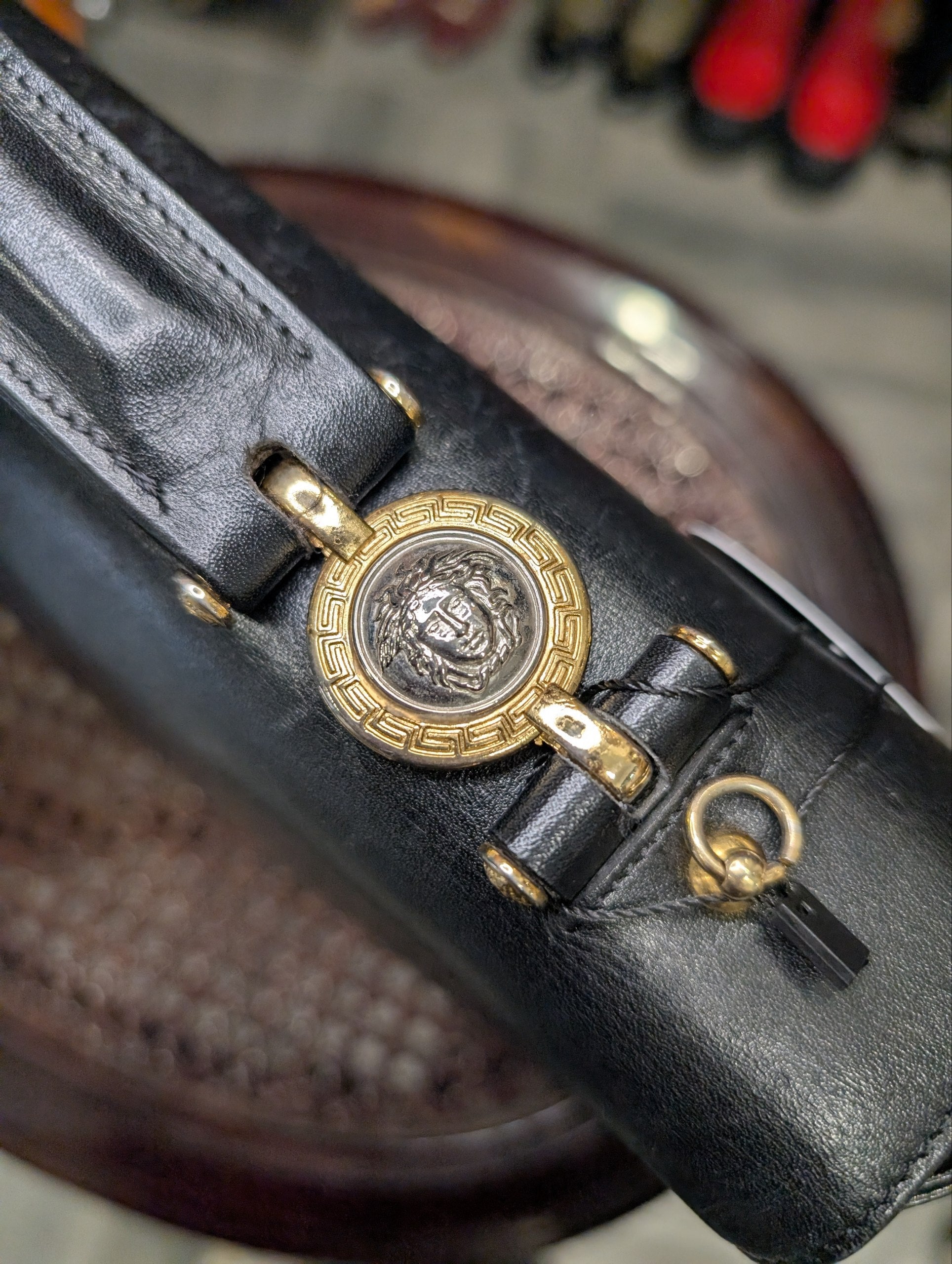 Iconica borsa Medusa Bag, vintage, anni 90 di Gianni Versace, con dettagli sul fronte impressa a fuoco, e dettagli colore argento e oro sul manico. Possiede la sua tracolla removibile.