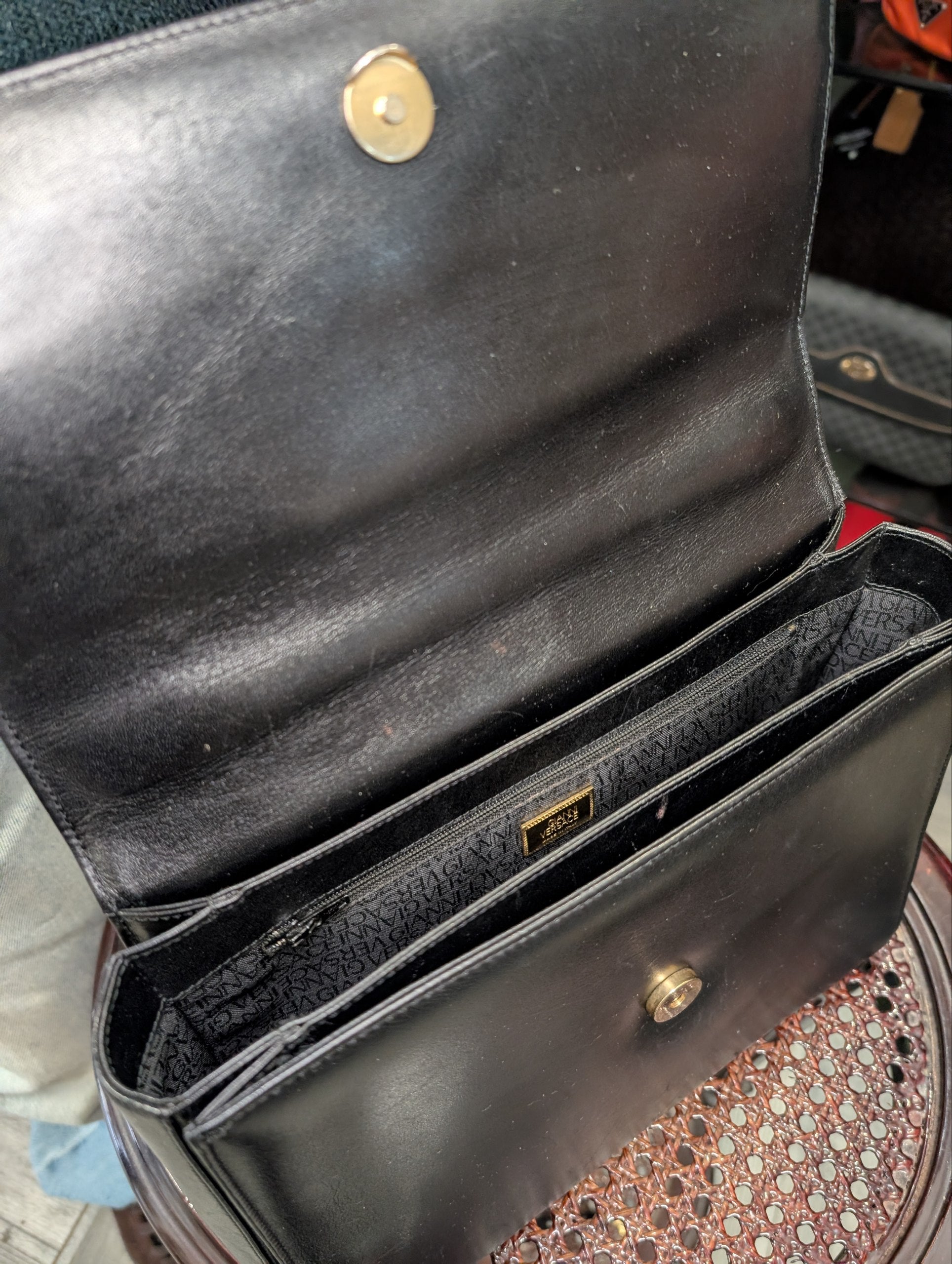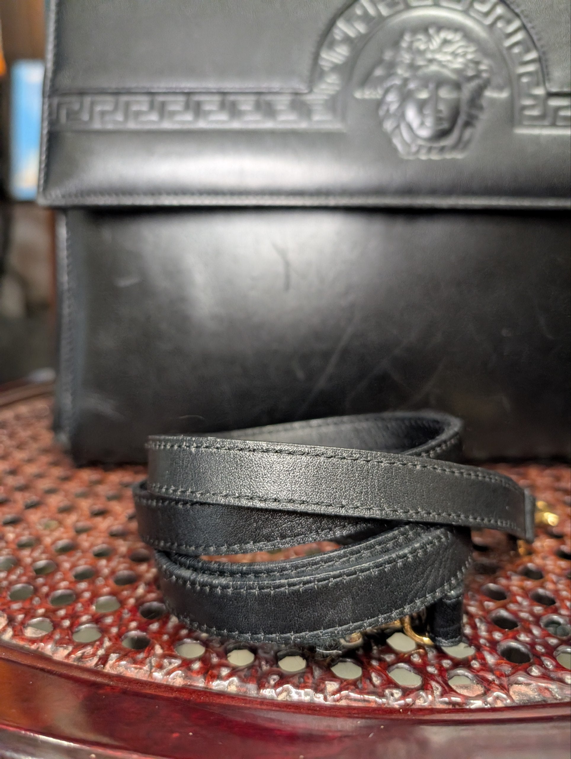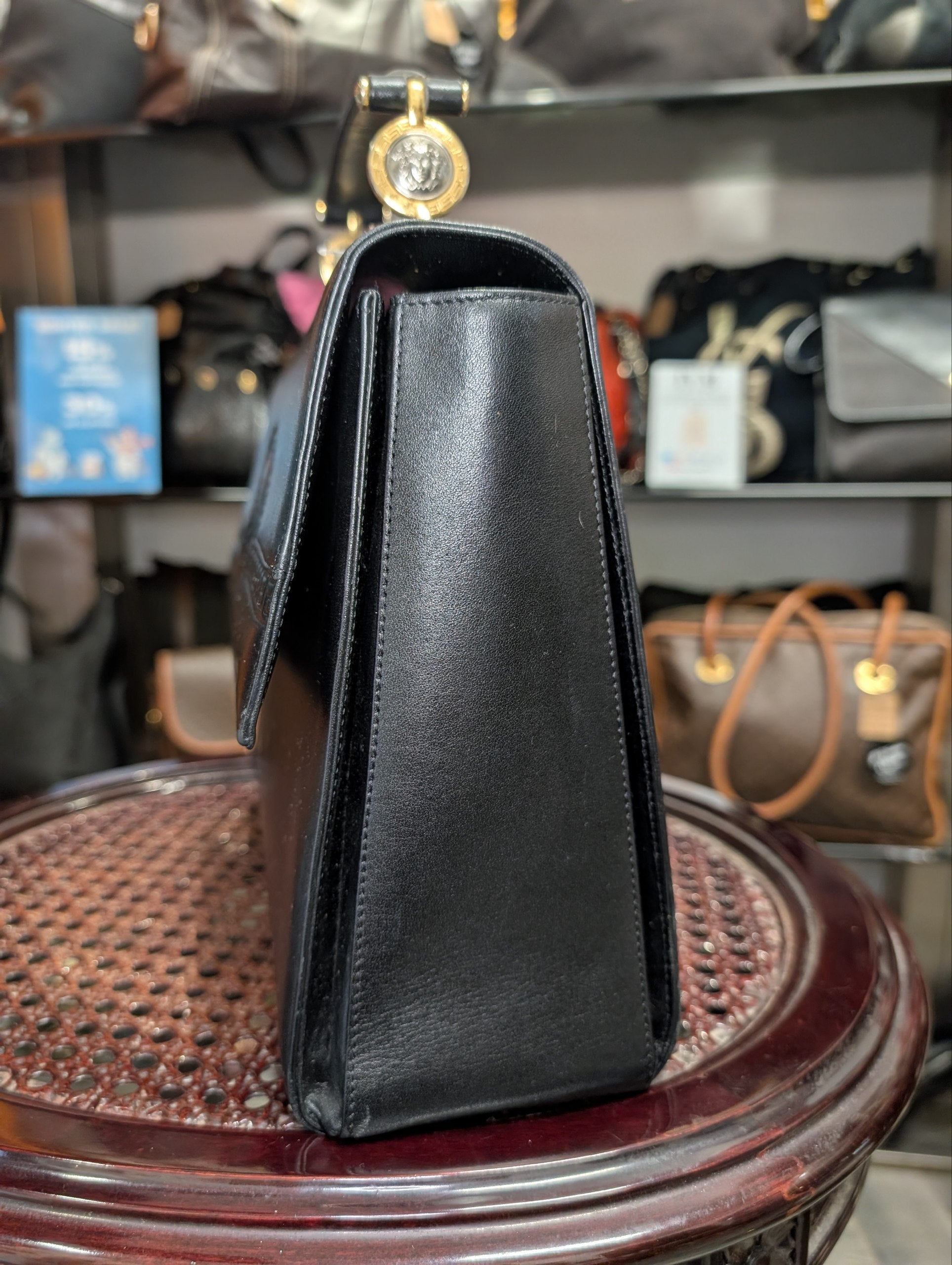 Iconica borsa Medusa Bag, vintage, anni 90 di Gianni Versace, con dettagli sul fronte impressa a fuoco, e dettagli colore argento e oro sul manico. Possiede la sua tracolla removibile.