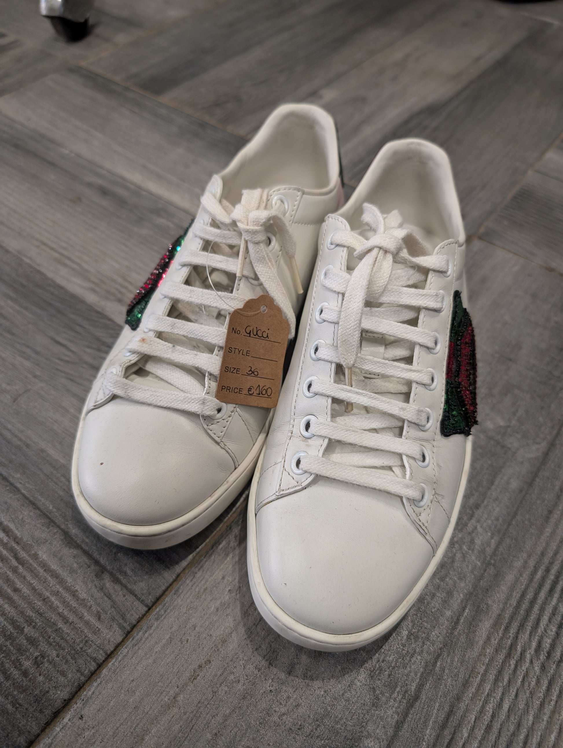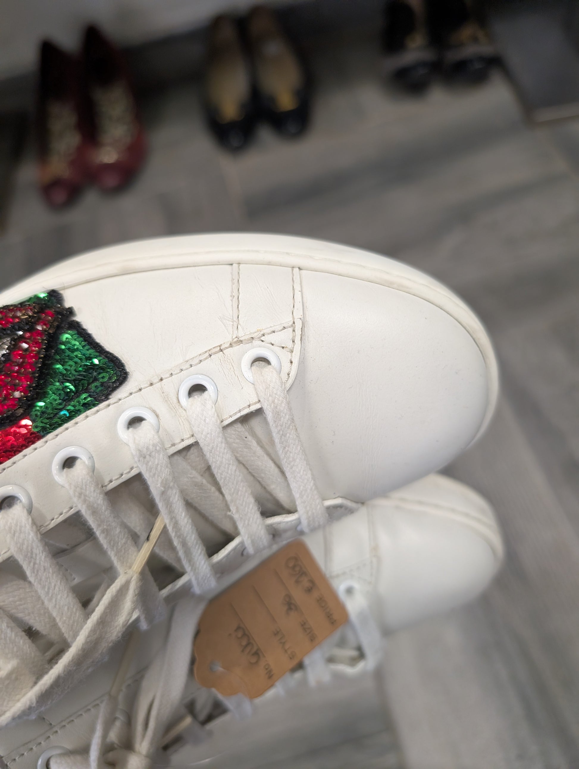 Sneakers di Gucci, modello Ace, in pelle liscia bianca, laterali impreziositi con paillettes e cristalli che disegnano delle labbra.
