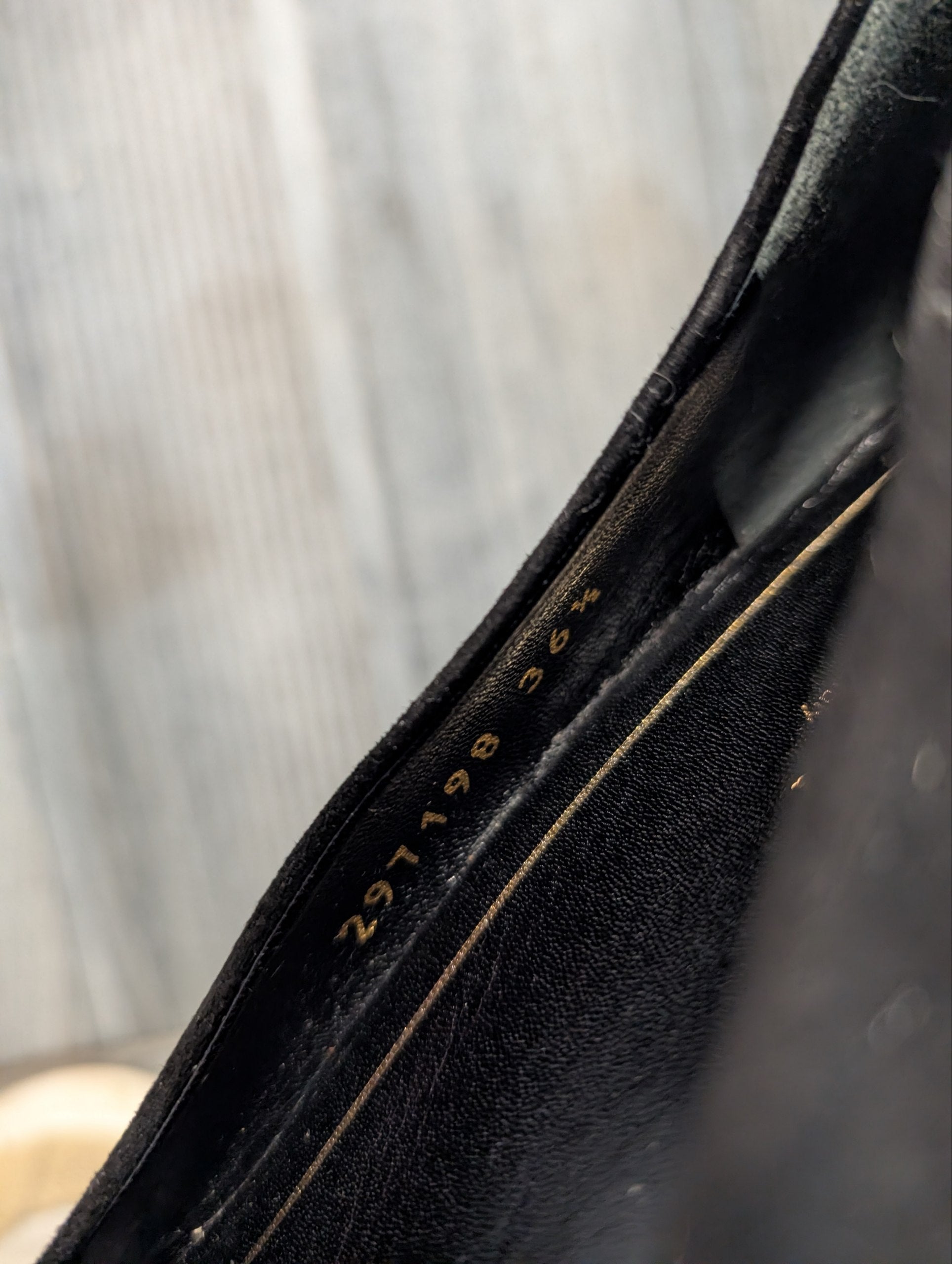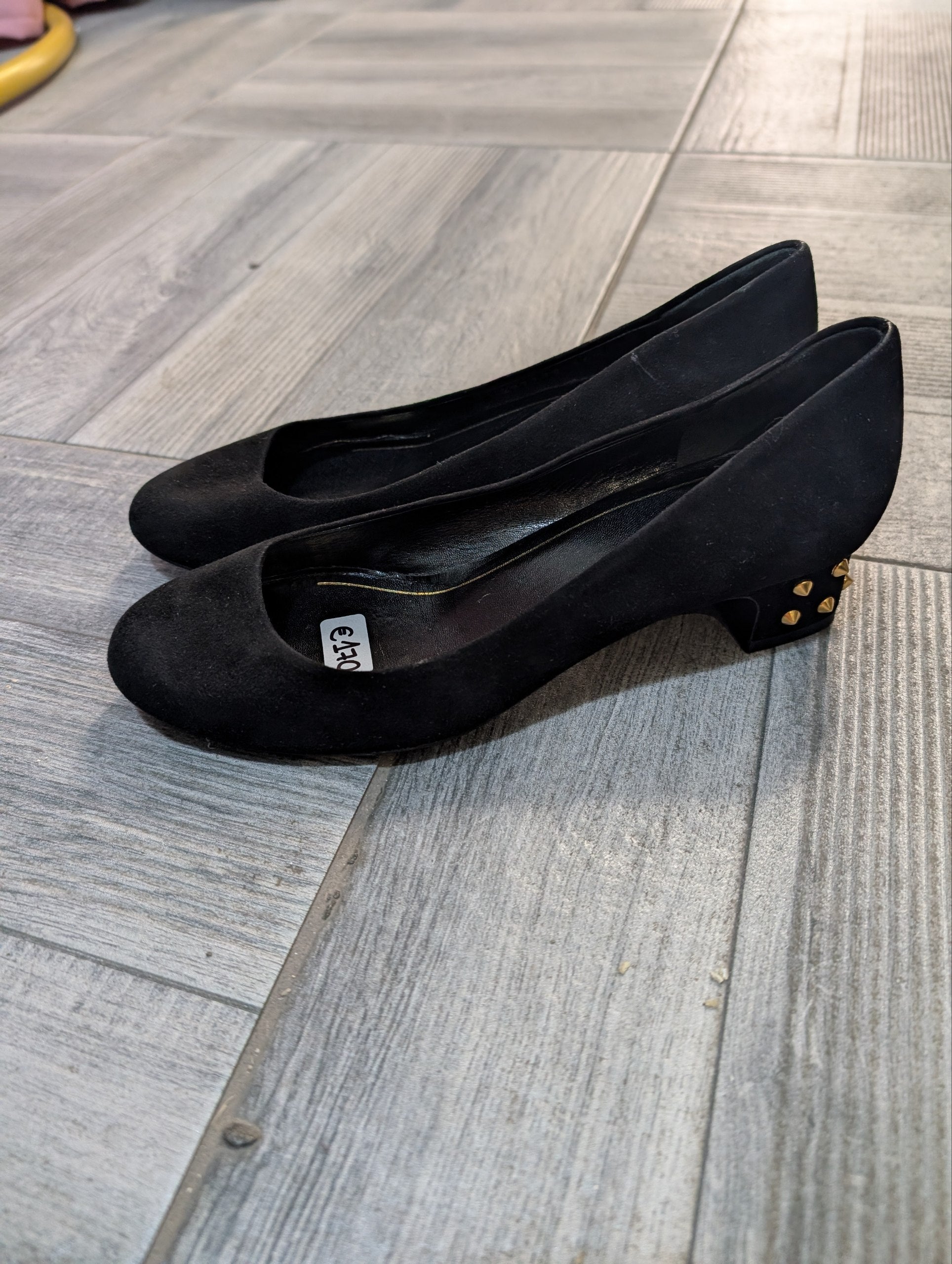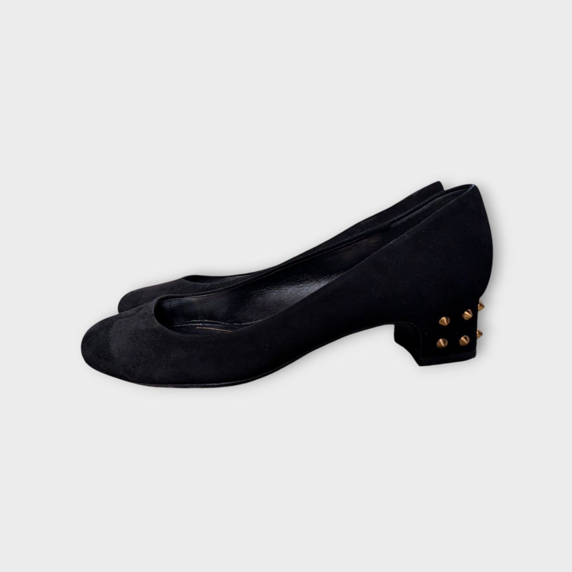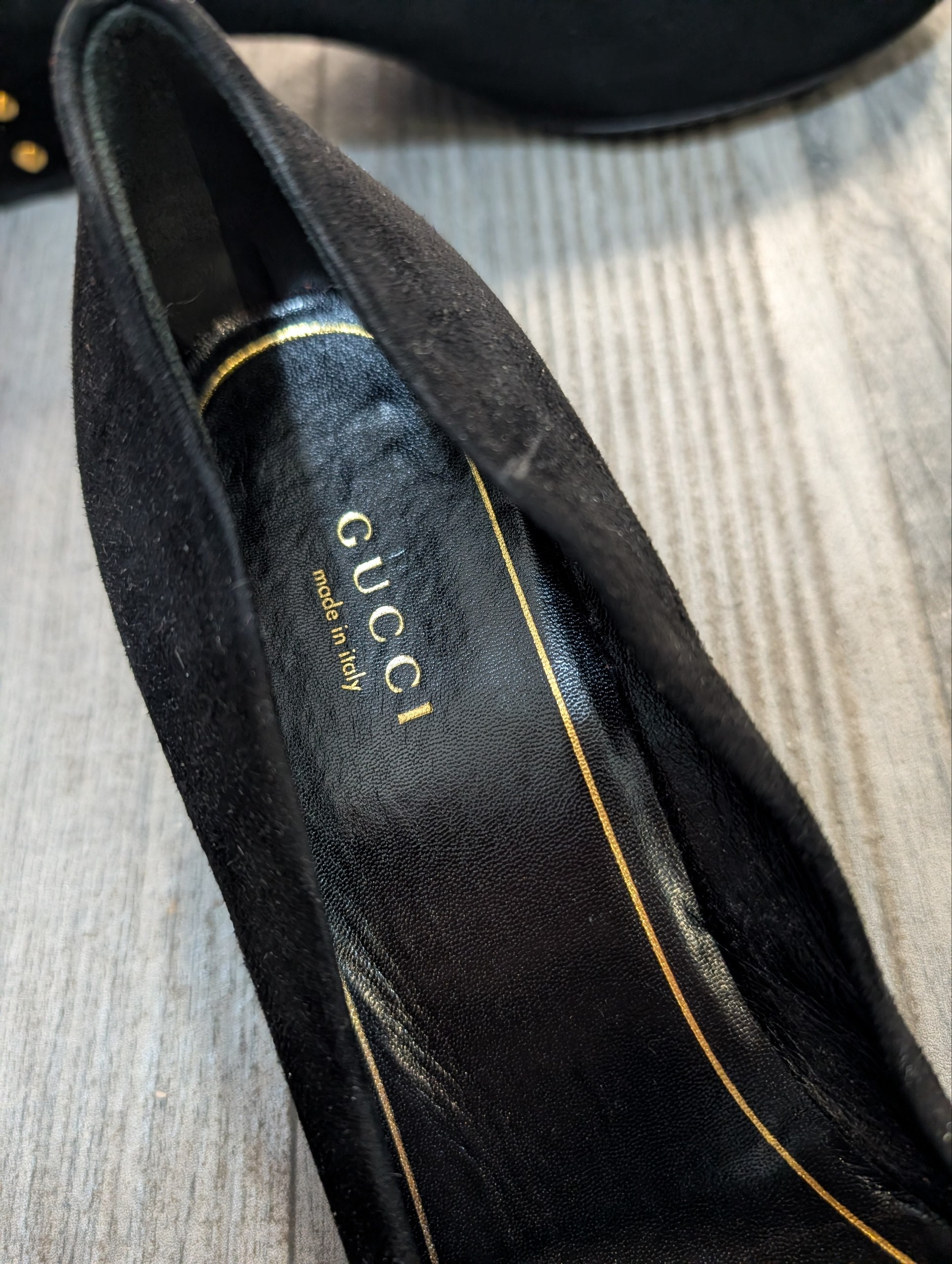 Ballerine Gucci con tacchetto, in pelle scamosciata nera, e borchie colore oro.Β