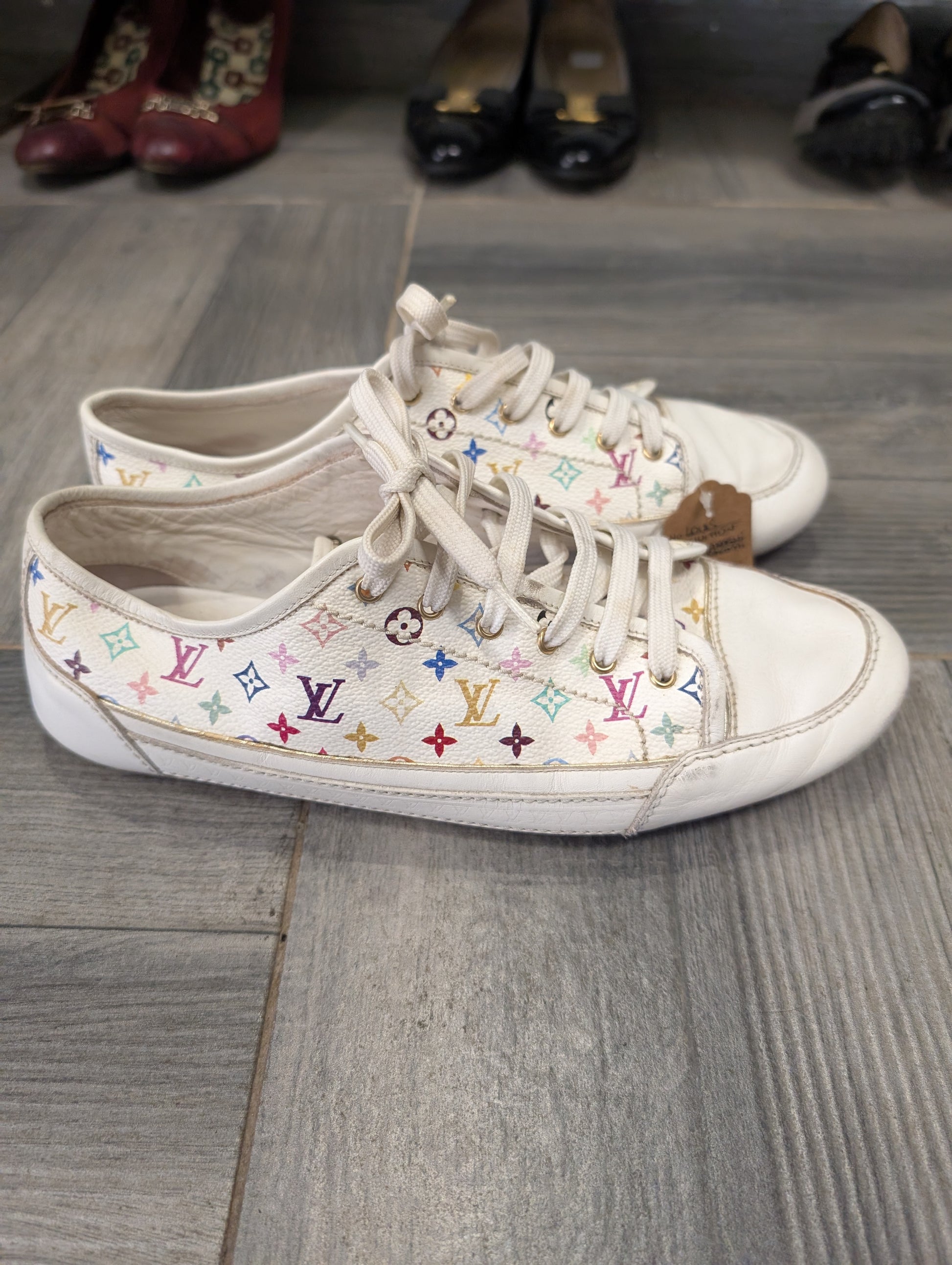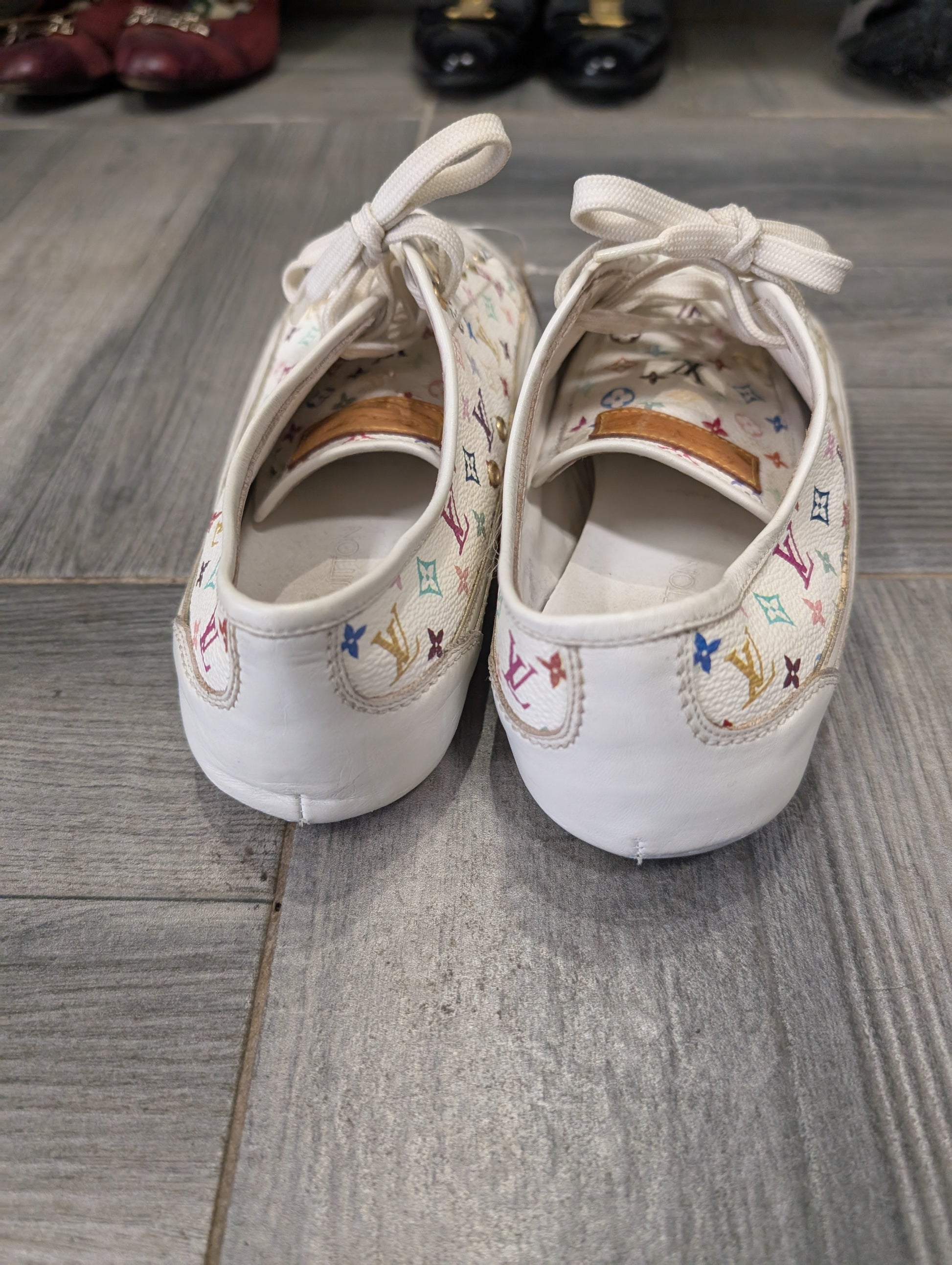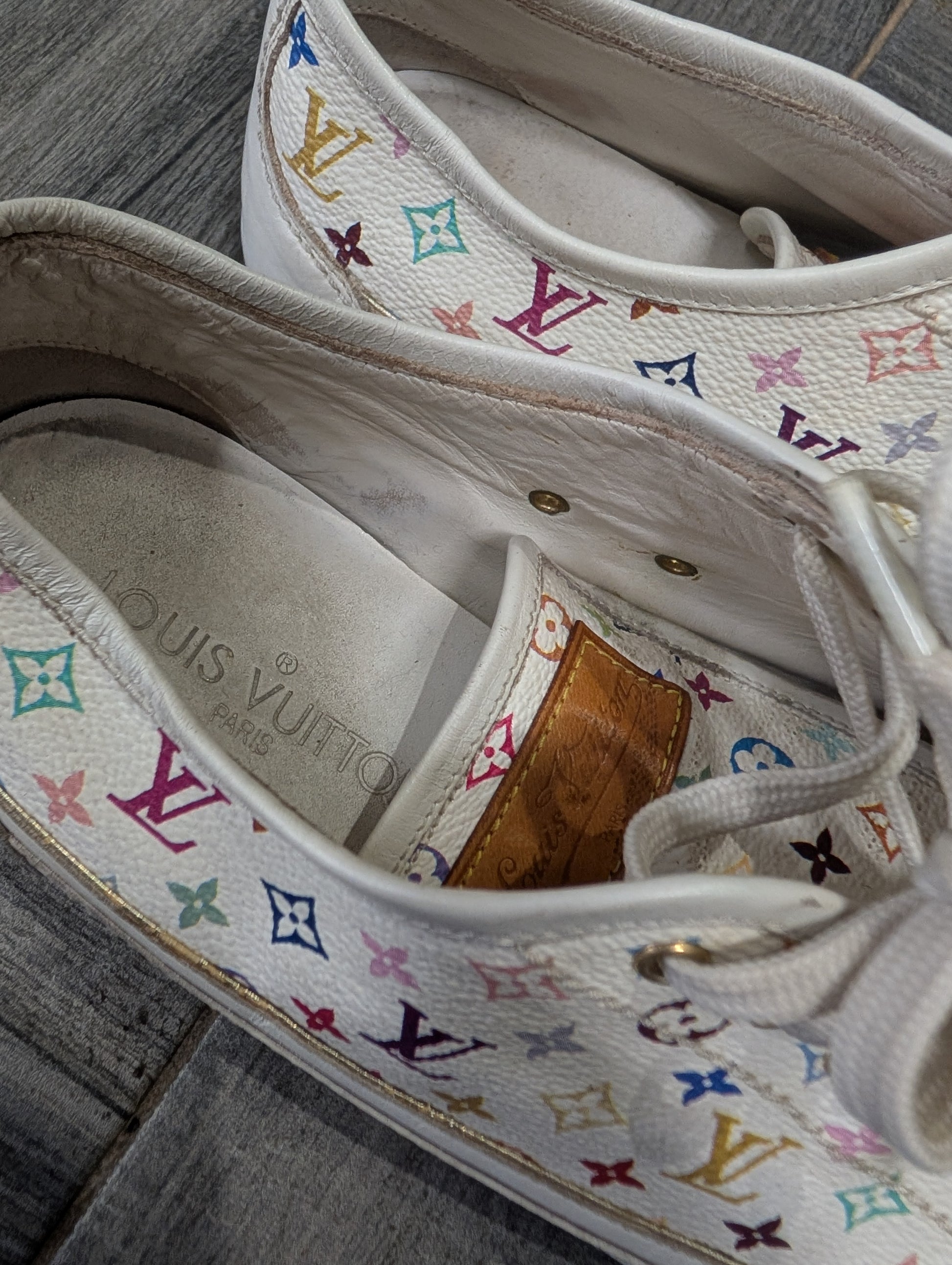 Iconiche sneakers ormai vintage di Louis Vuitton, dalla collezione di Takashi Murakami, anno 2007, base bianca e monogram coloratissimo.