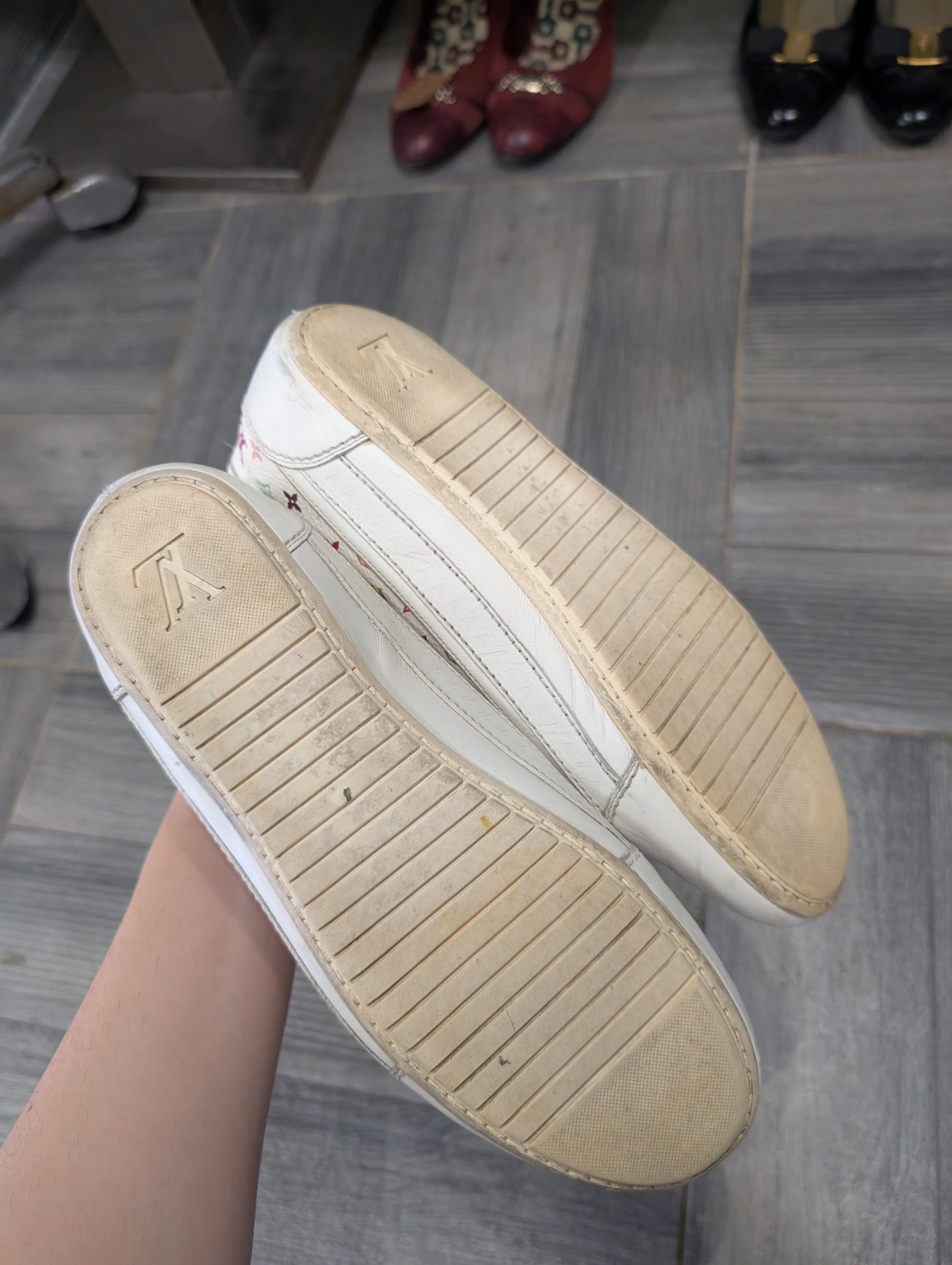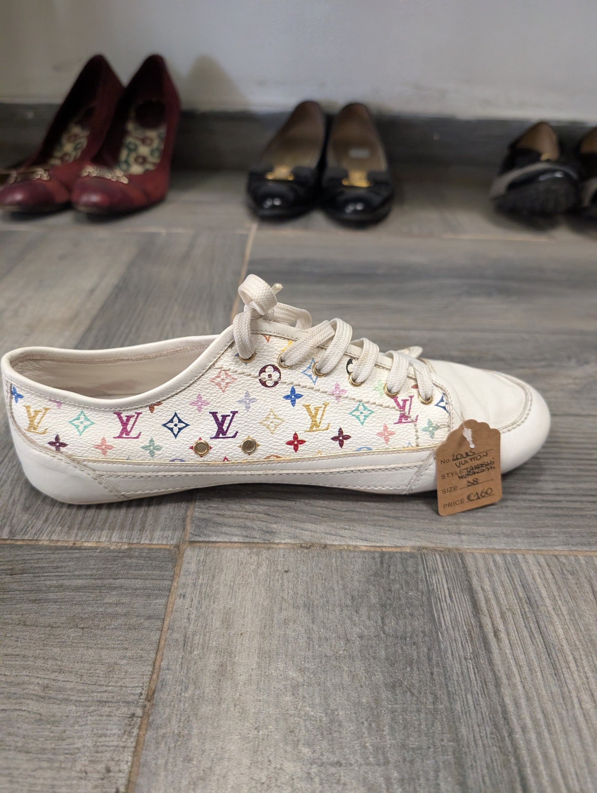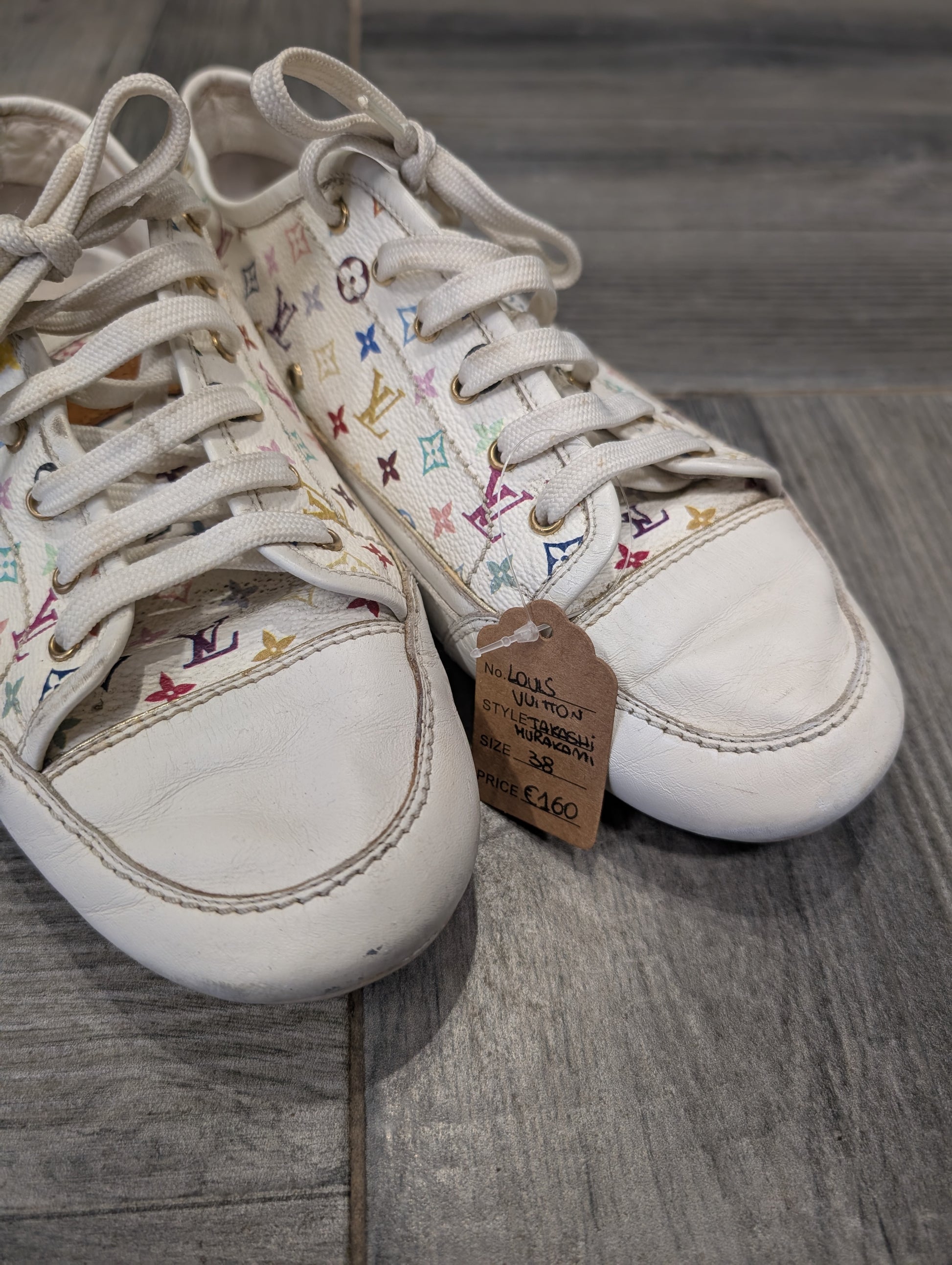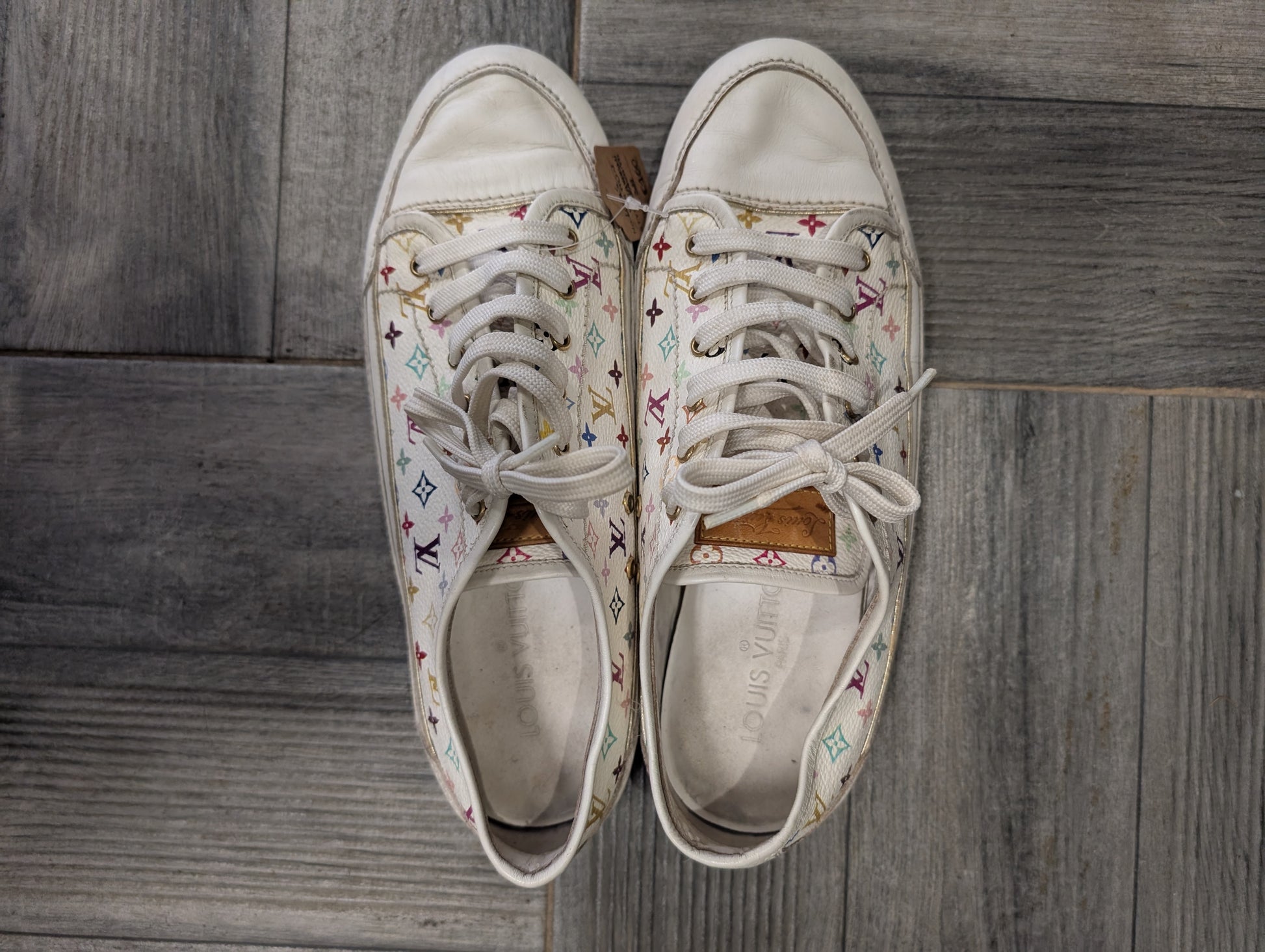 Iconiche sneakers ormai vintage di Louis Vuitton, dalla collezione di Takashi Murakami, anno 2007, base bianca e monogram coloratissimo.