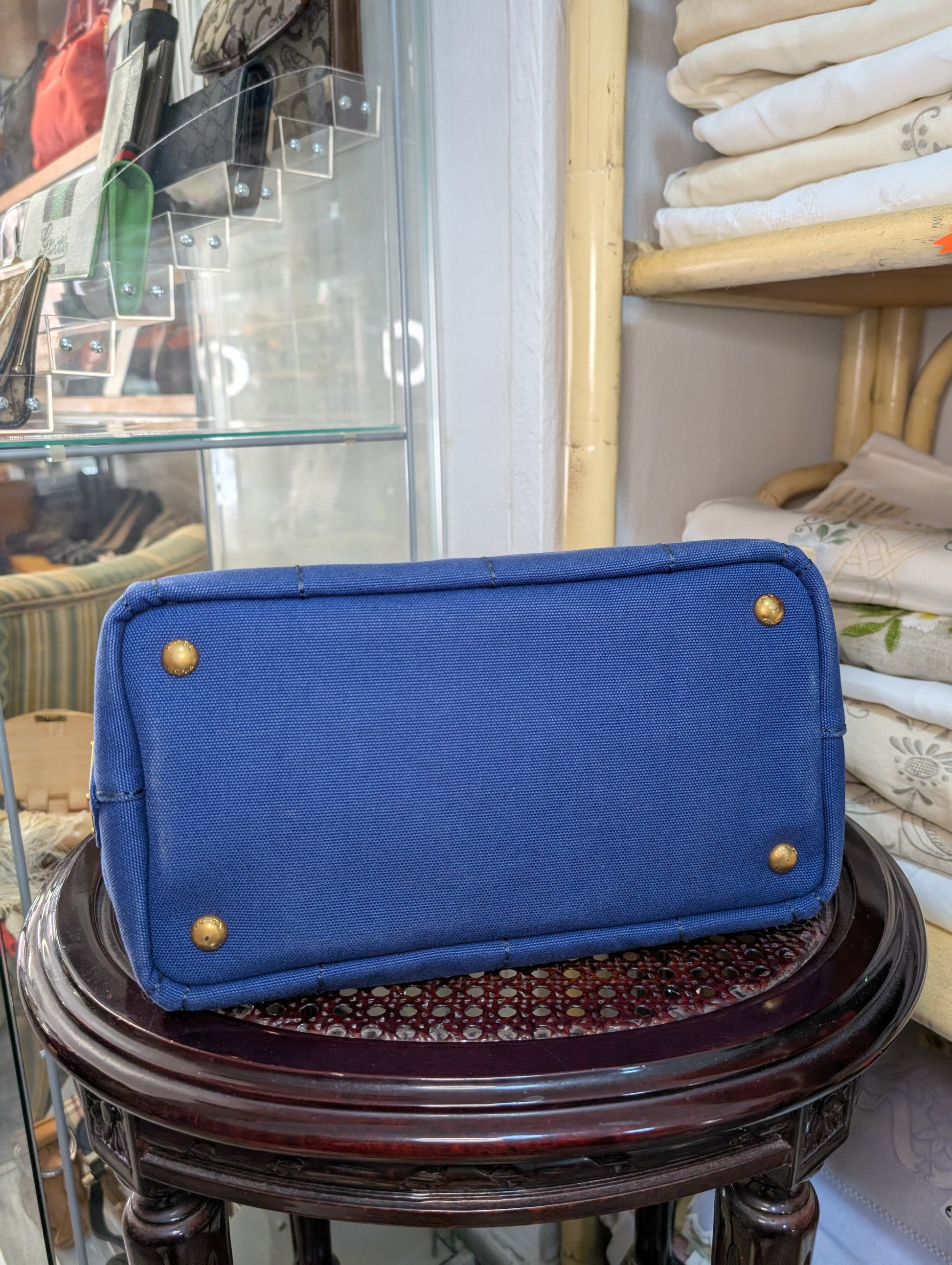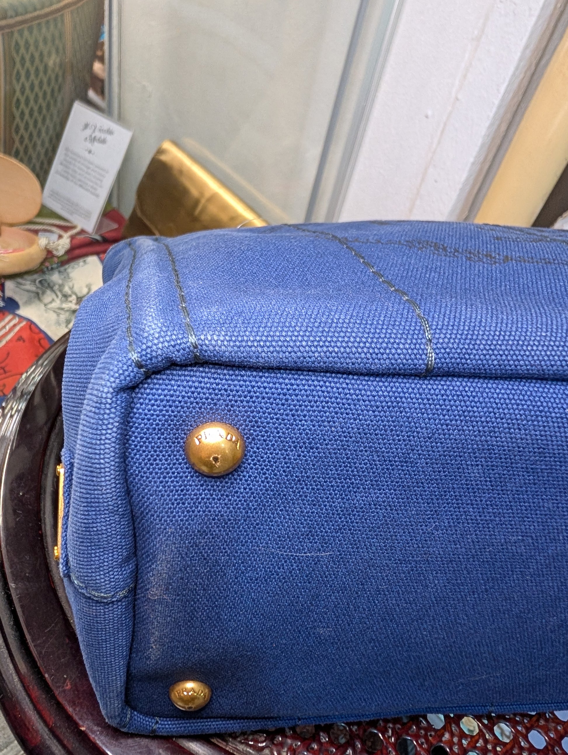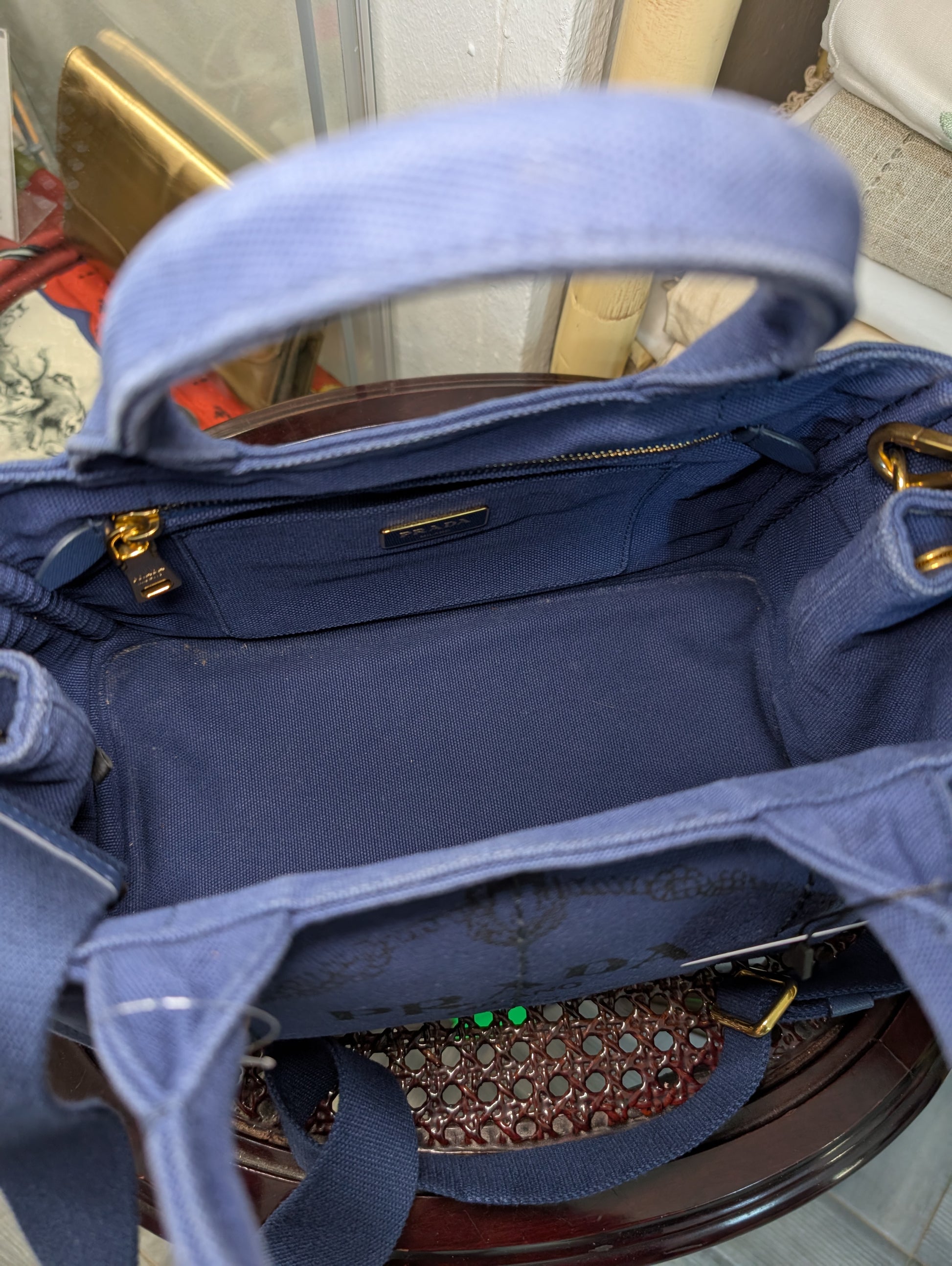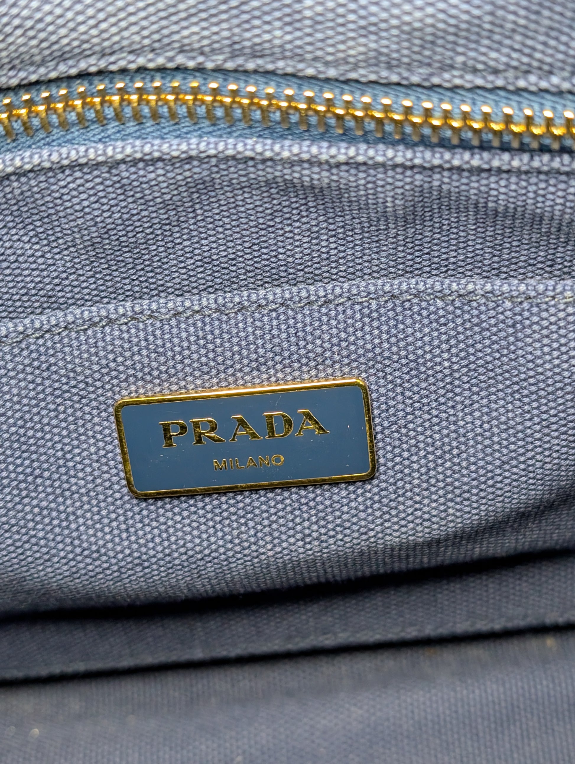 Borsa di Prada, modello Jardiniere, in tela denim blu, doppi manici, clip laterali e tracolla regolabile.