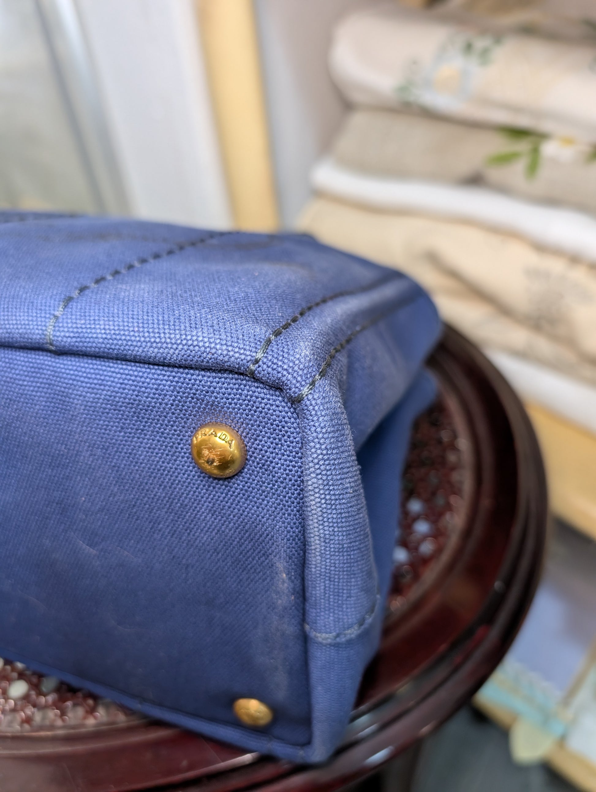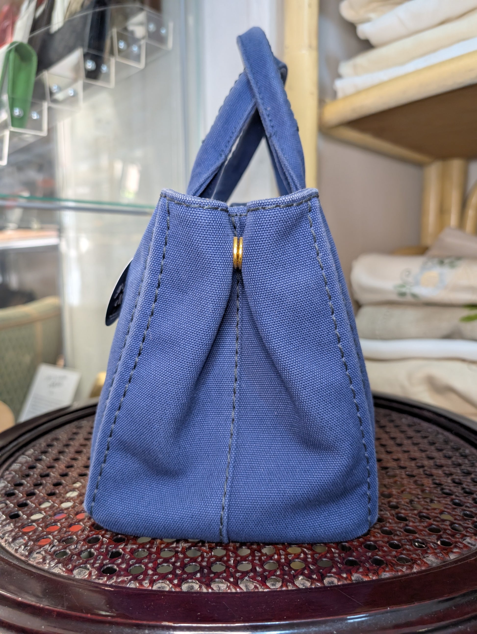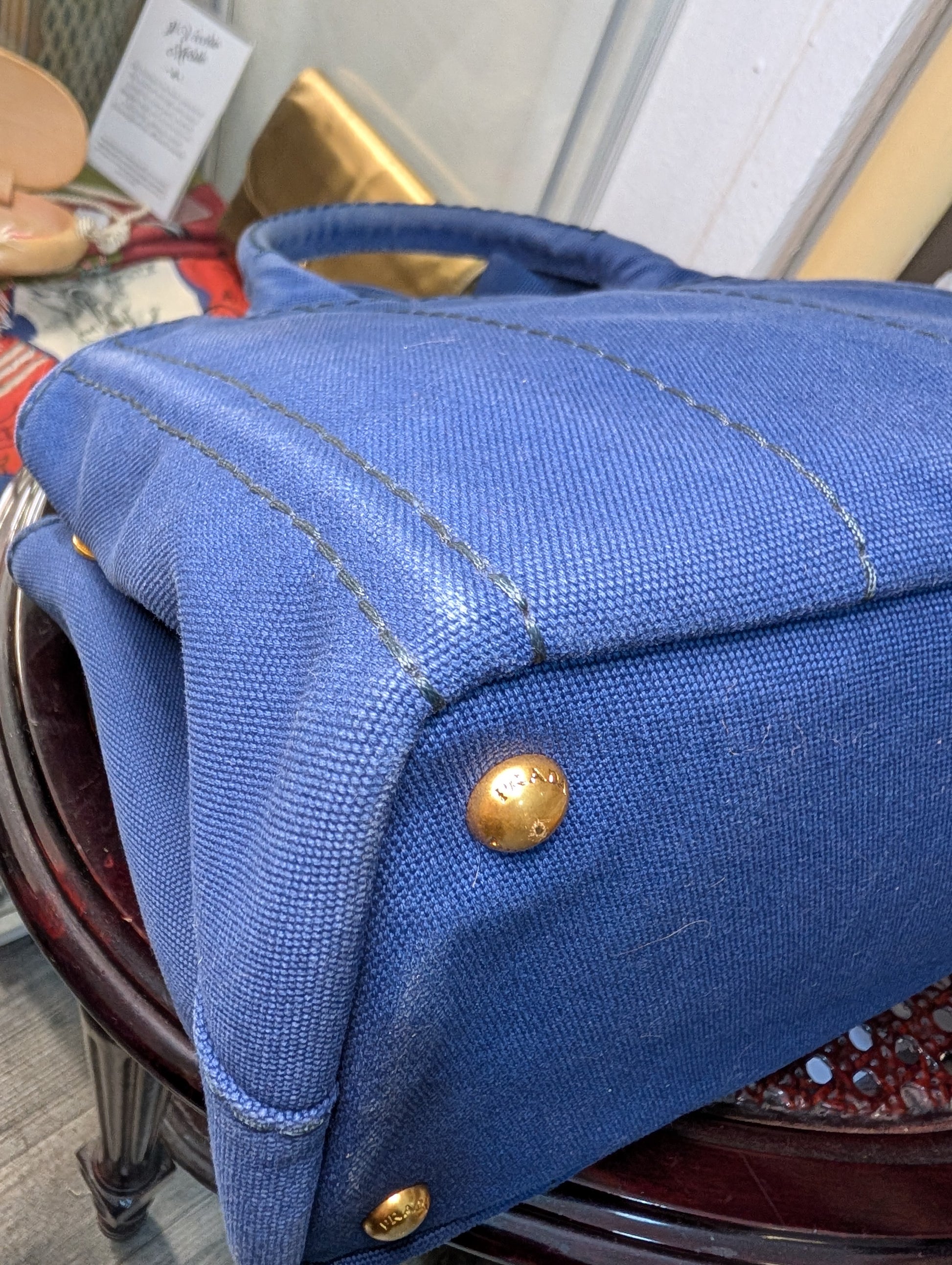 Borsa di Prada, modello Jardiniere, in tela denim blu, doppi manici, clip laterali e tracolla regolabile.