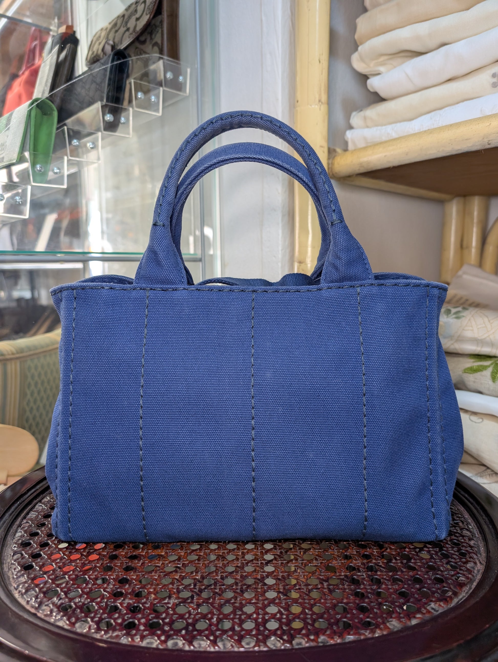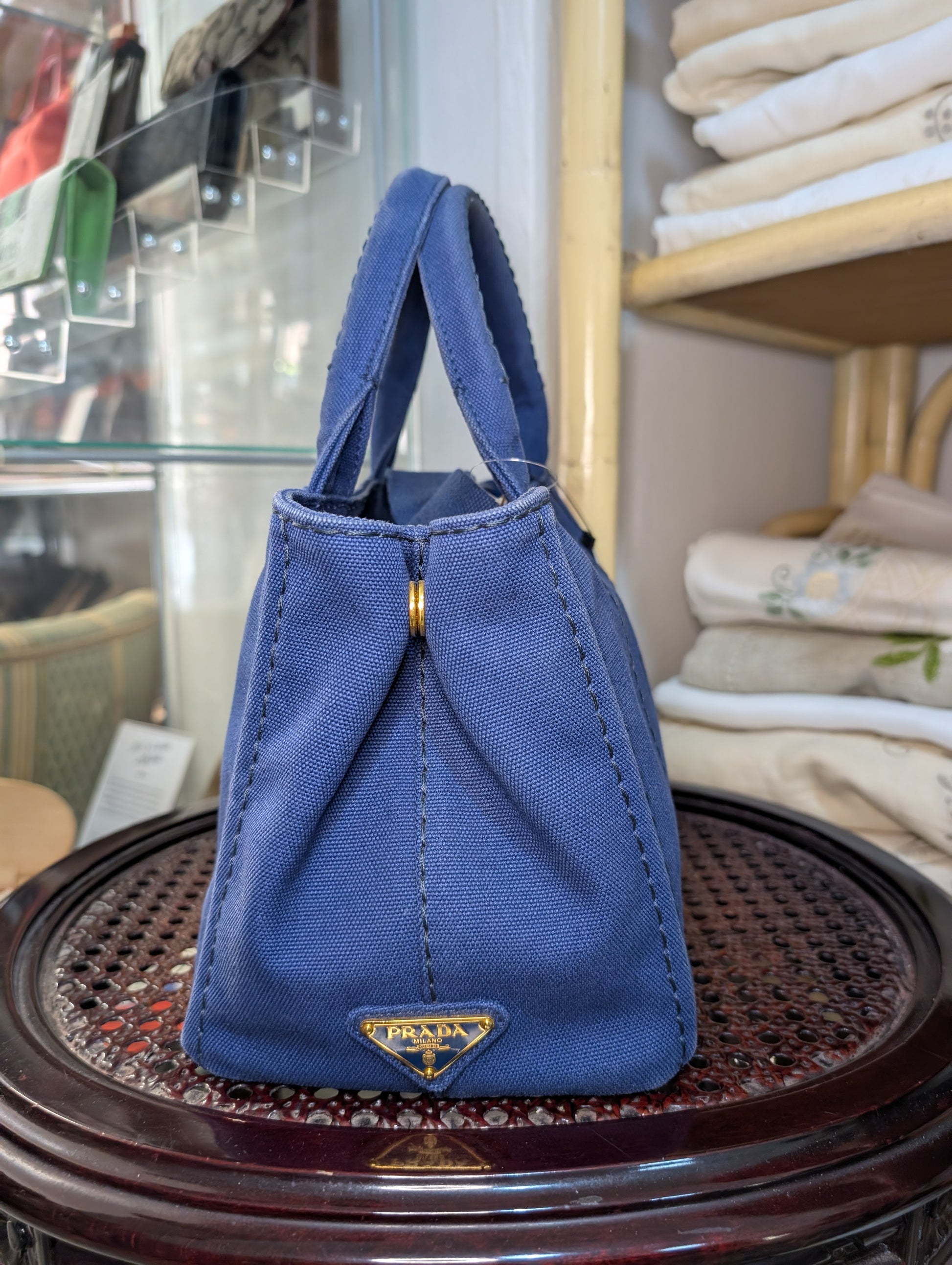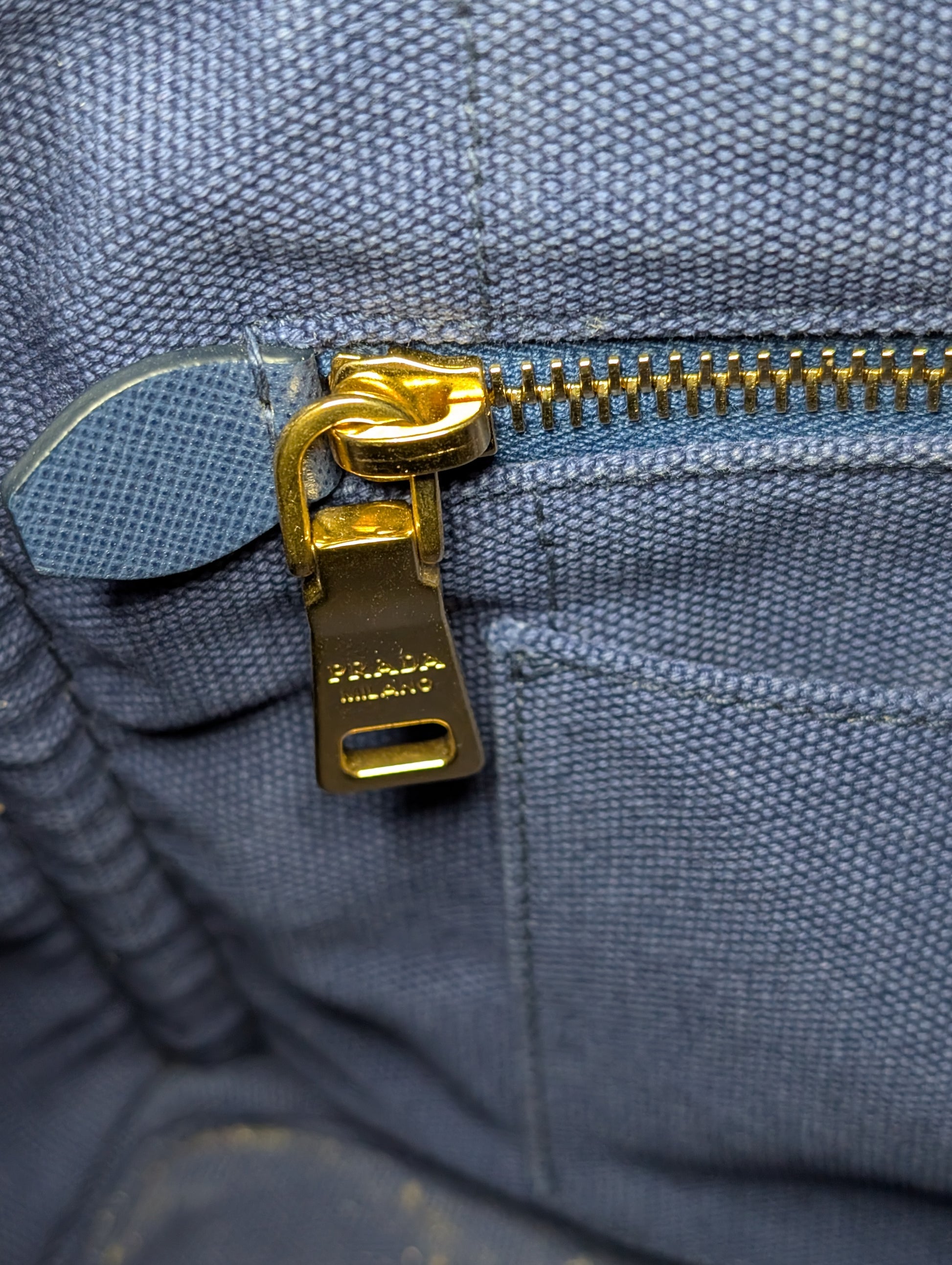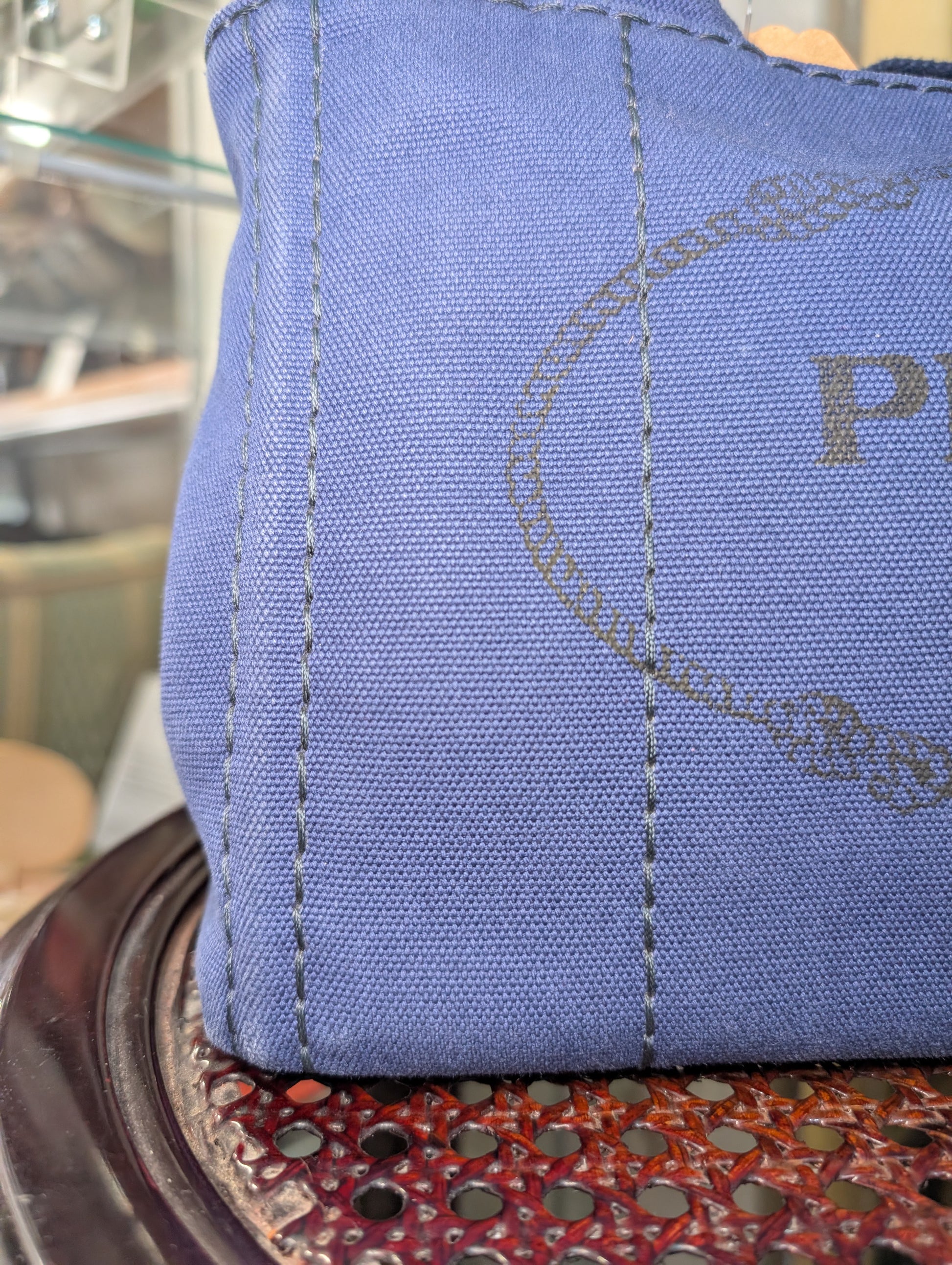 Borsa di Prada, modello Jardiniere, in tela denim blu, doppi manici, clip laterali e tracolla regolabile.