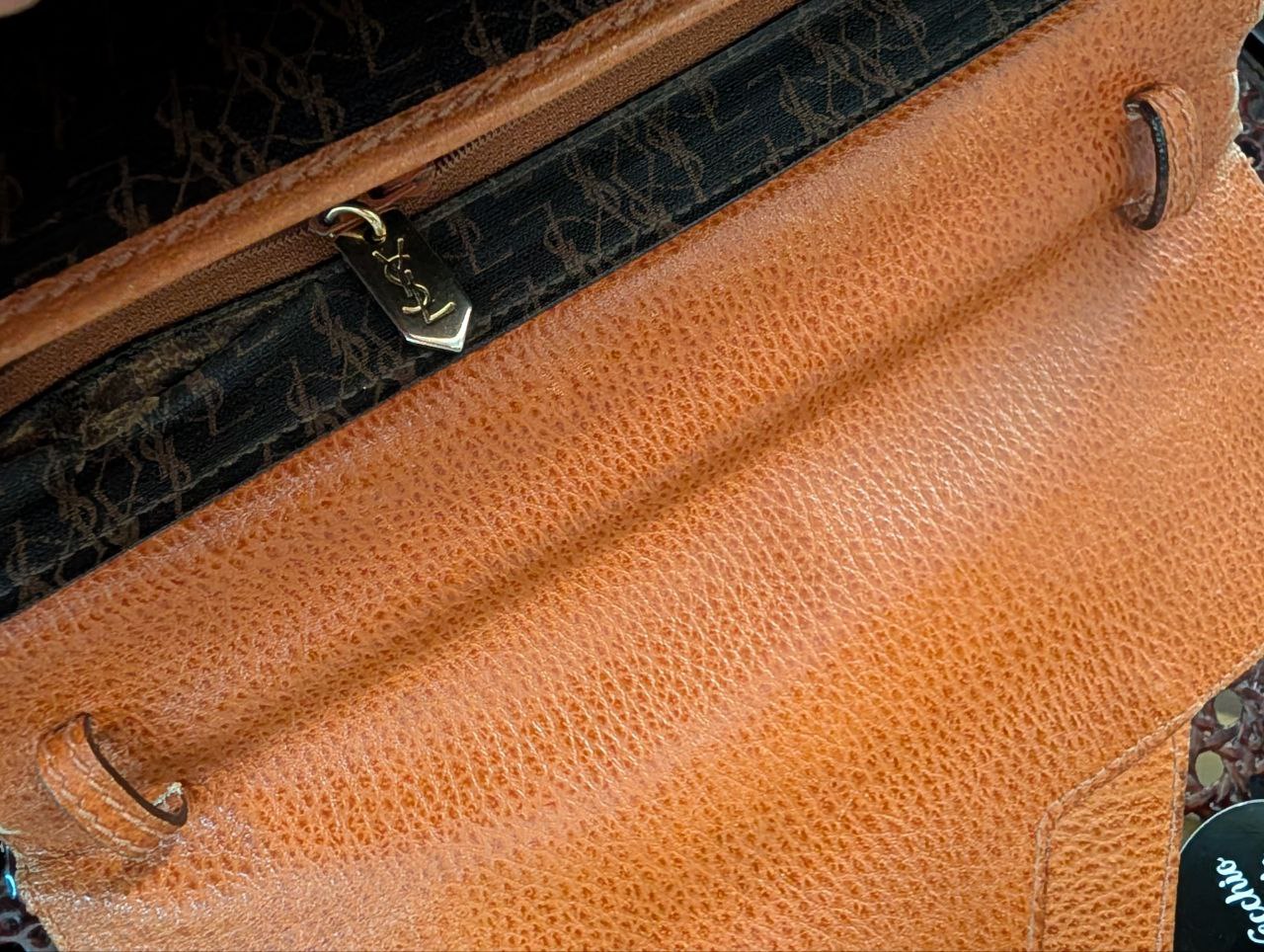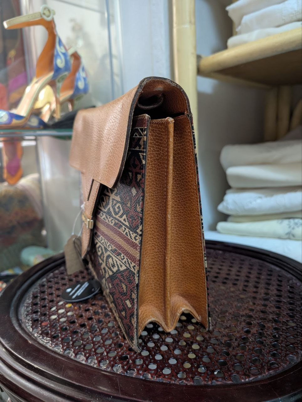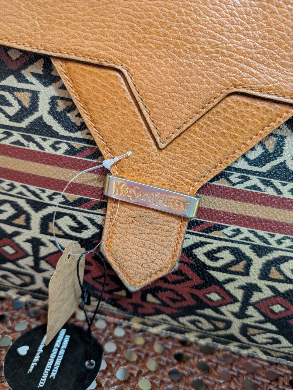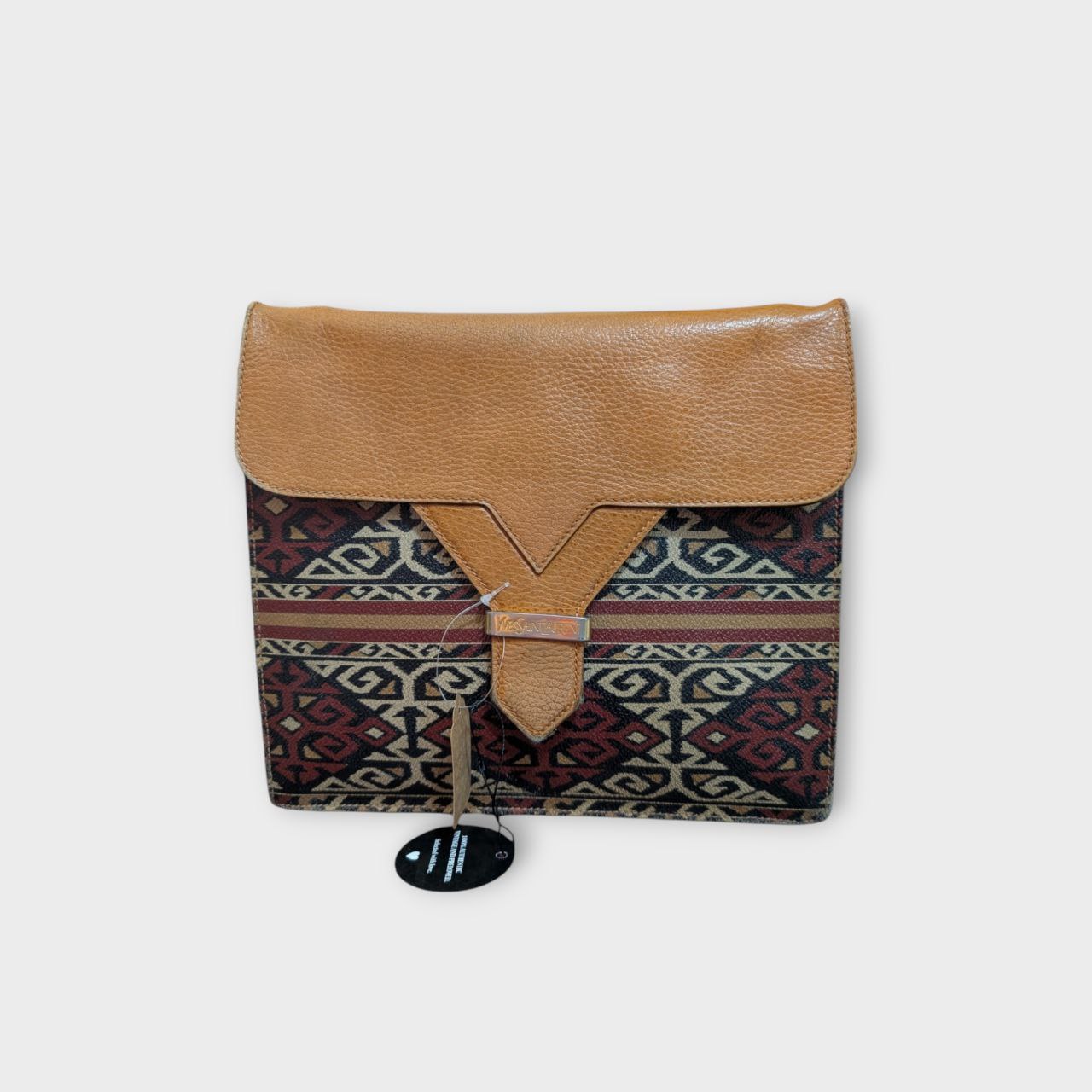 Pochette vintage a soffietto di Yves Saint Laurent, anni 80, in pelle marrone e canvas un po' etnico.