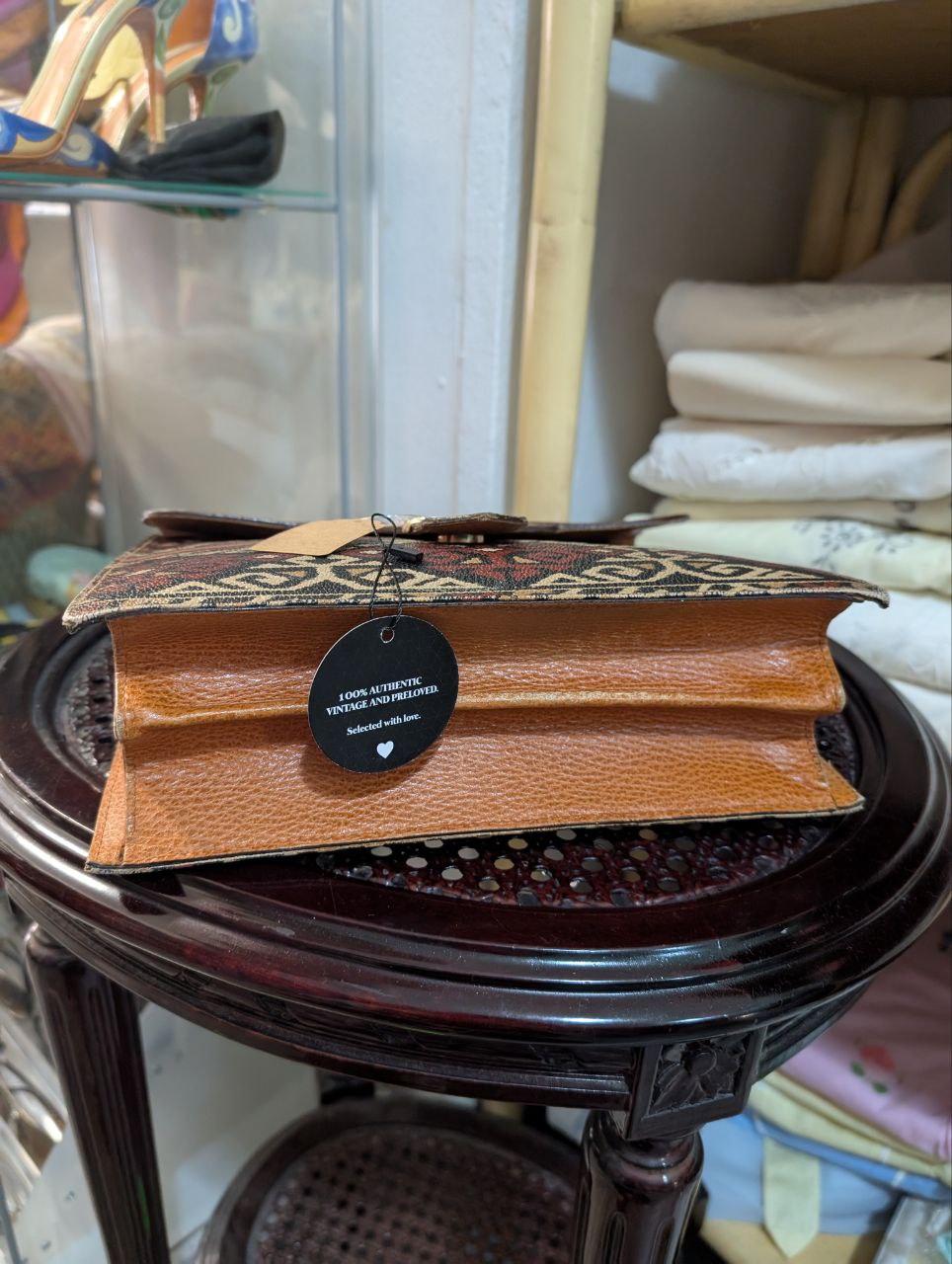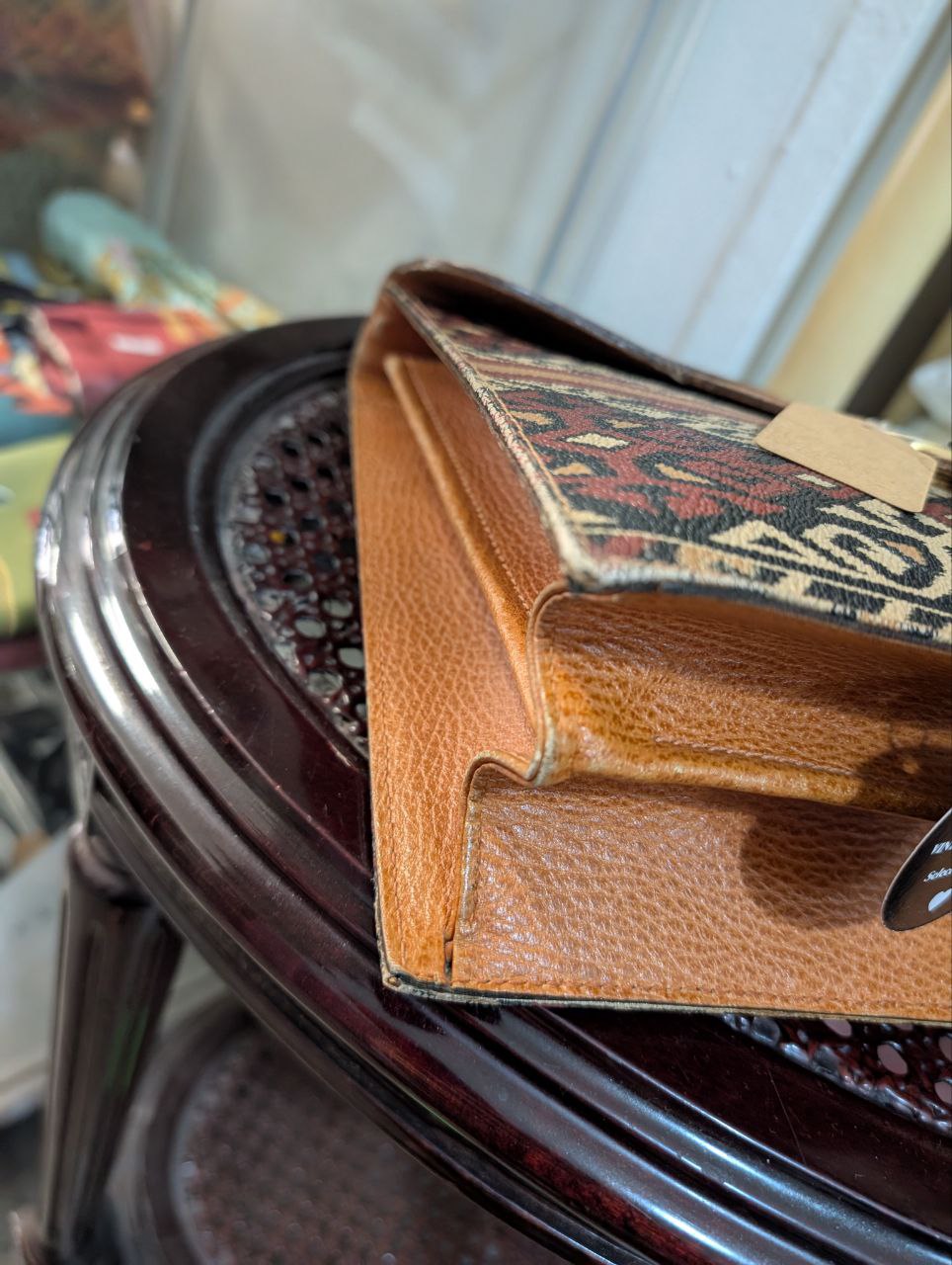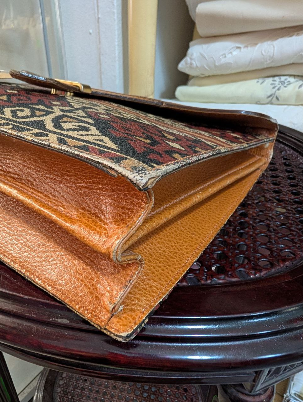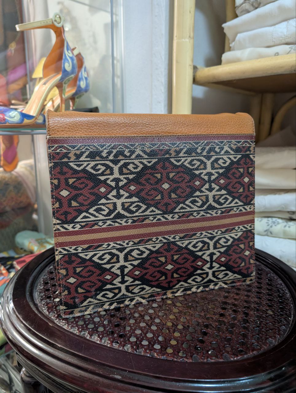 Pochette vintage a soffietto di Yves Saint Laurent, anni 80, in pelle marrone e canvas un po' etnico.