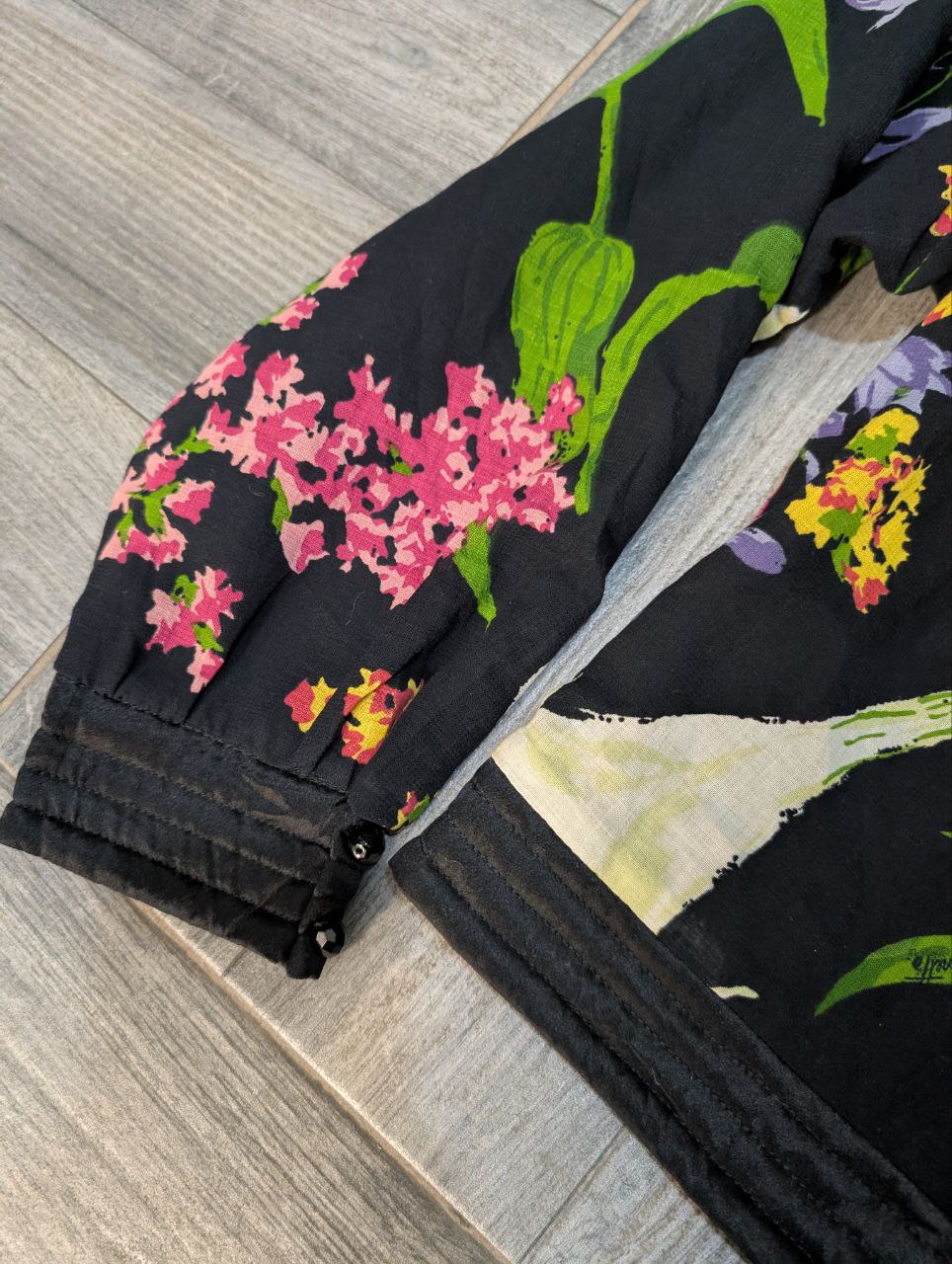 Taglia non riportata, ma misura spalle 44 cm circa. Veste leggermente crop. Etichetta di composizione presente, appunto 100% seta.